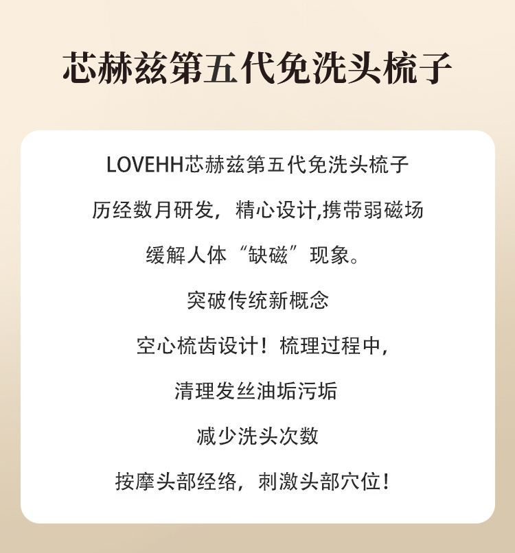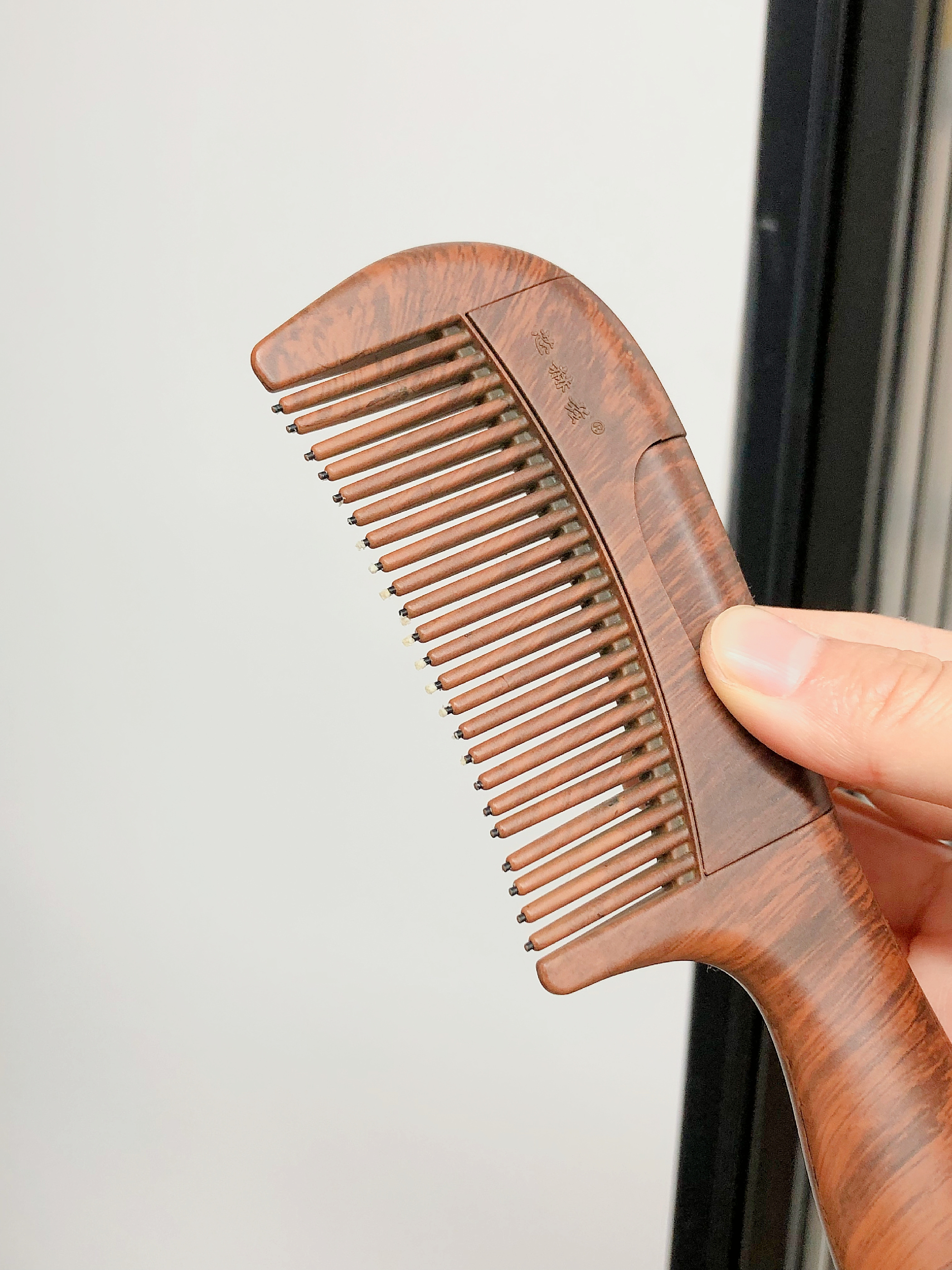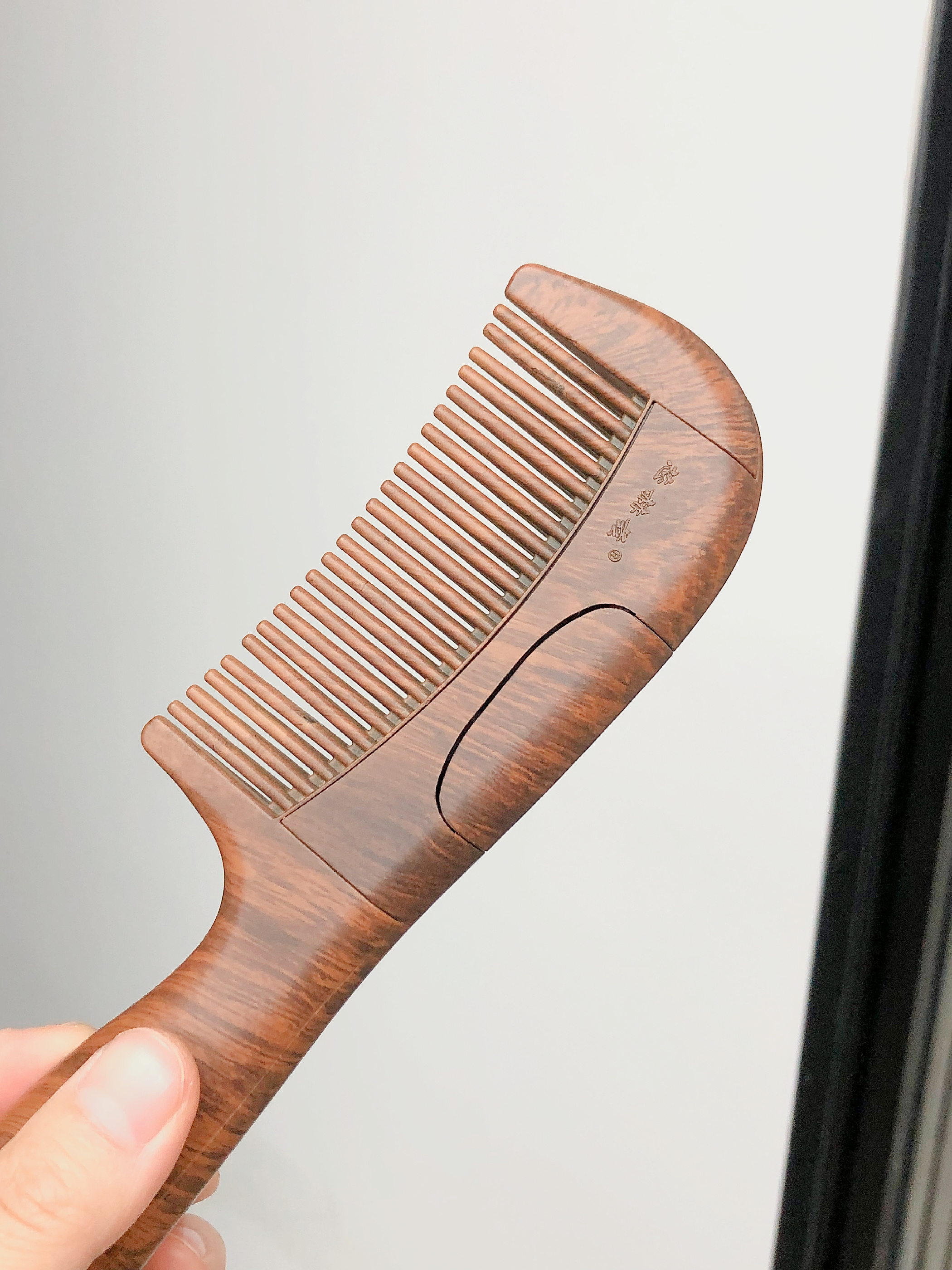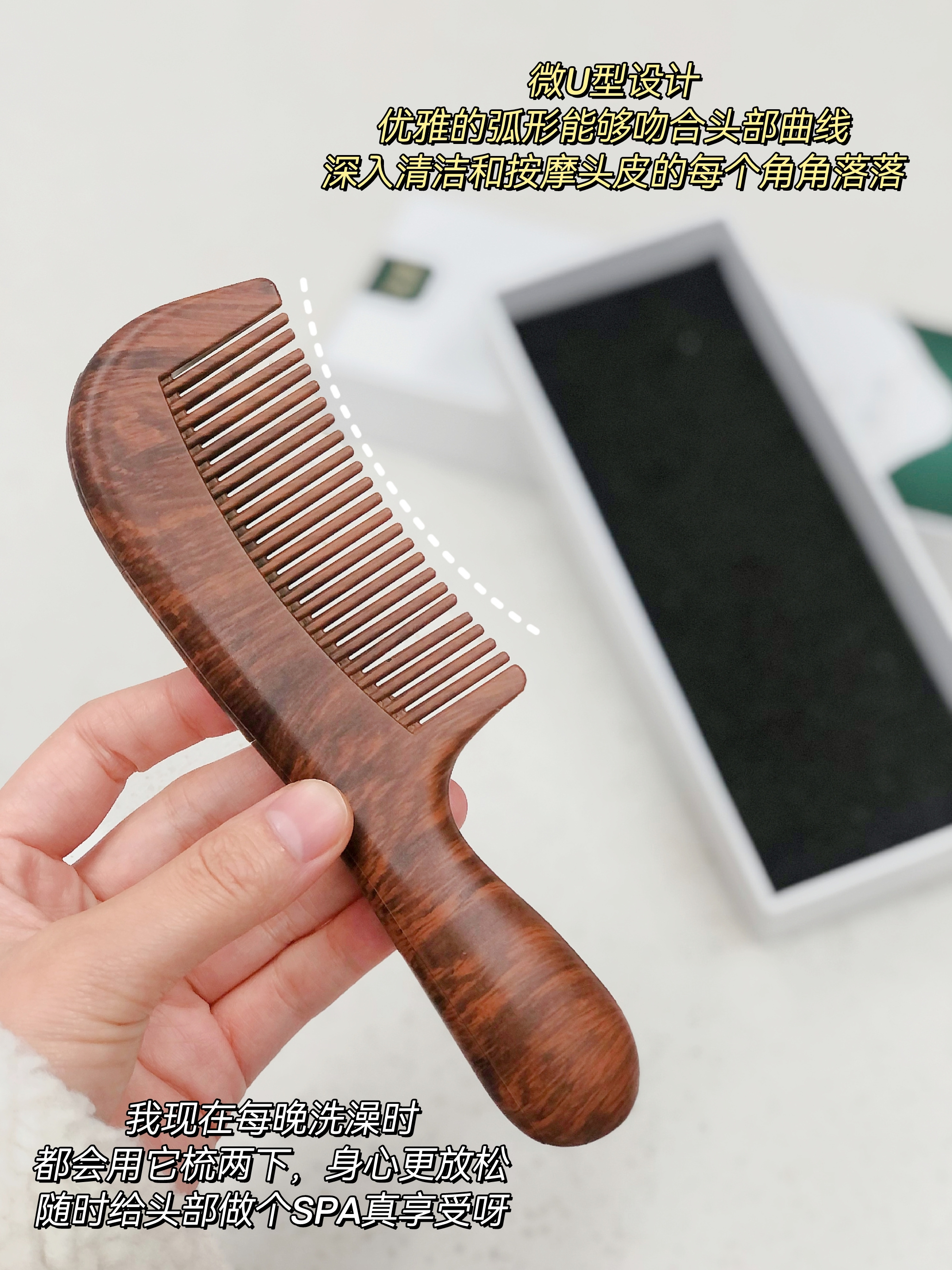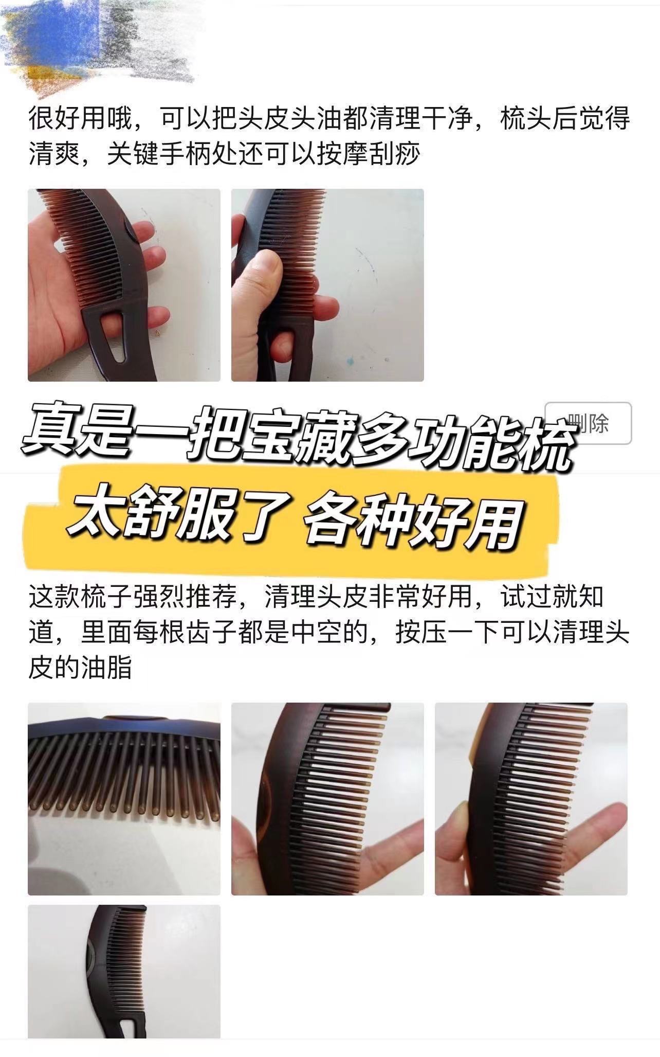 日常生活中,总有一些看似简单却又让人头大的事儿 比如梳子的清洁问题.....铛铛铛~芯赫兹第五代免洗头梳子 1.好打理:刷子刷一刷冲一冲就能洗干净了,非常方便 2.不藏头发:头发不容易勾留在梳齿上,有一两根也很好拿掉 3.对头皮友好:比塑料对头皮更好,特别便宜的塑料梳子,工艺处理的不好就很容易划伤头皮 4.摩擦力小,可以减少梳子对毛鳞片磨损 5.手感光滑,干净卫生,不起静电、能降低掉发 同时还能够减缓脑衰退,能够清除疲惫感,可以益脑醒神 具有降血压,防止脑溢血等病症的功效,能够缓解头疼,能耳聪慧目 可以对头部血液的循环系统,具有改进的功效 能具有推拿头发的作用,让秀发获得滋润,乌亮有光泽度 另外梳子是越久越好,经过长时间使用会变得更加光滑,老梳子不要丢,用起来更好哦