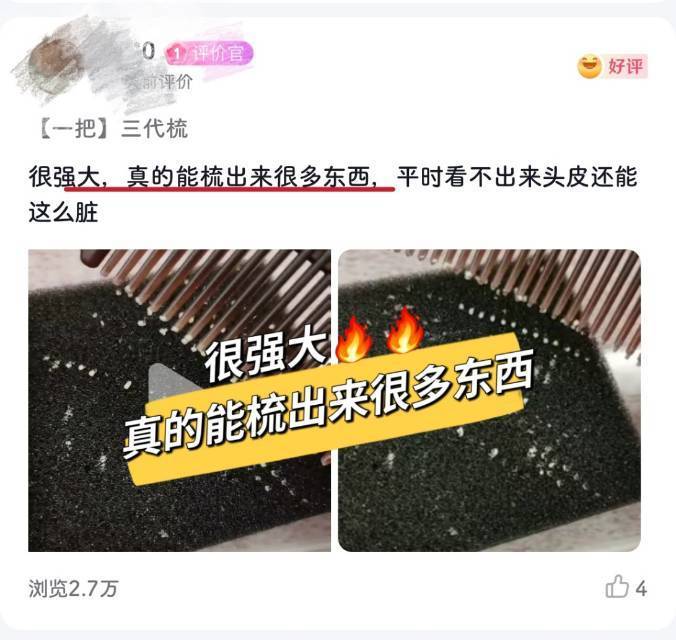 用过芯赫兹前面几代的免洗头梳子的评价: 🔺亲身体验,真的太神奇了,我昨晚才洗头,也能梳出这么多脏东西 轻松一梳,就可以刮掉头皮屑和头油,清除头皮毛囊里的污垢 保养头皮,效果实实在在看得到‼ 经常使用还能能去屑、止痒、去油、减少洗头次数!