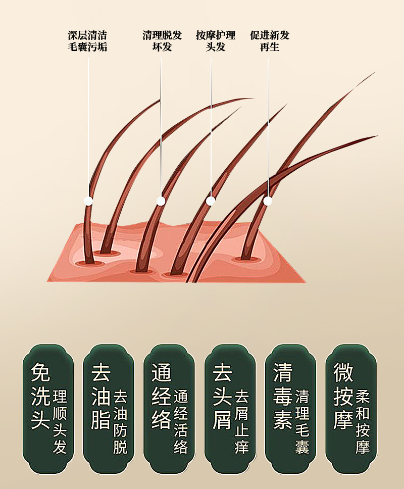 每天梳一梳通经活络,深度清理毛囊污垢,减少洗发次数。 更为重要的是,它是纯物理护发,无辐射,无化学添加,任何人都适用! 功效很多,去屑止痒,去头油,防脱发,促进新发再生 深度清理毛囊污垢,减少洗发次数! 还能通经活络,加快新陈代谢,改善头部血液循环 可以为头发输送更多的养分,重塑健康头皮环境,减少掉发,改善头皮屑! 白菜价解决头皮困扰,送家人,送朋友,都完全没问题的!