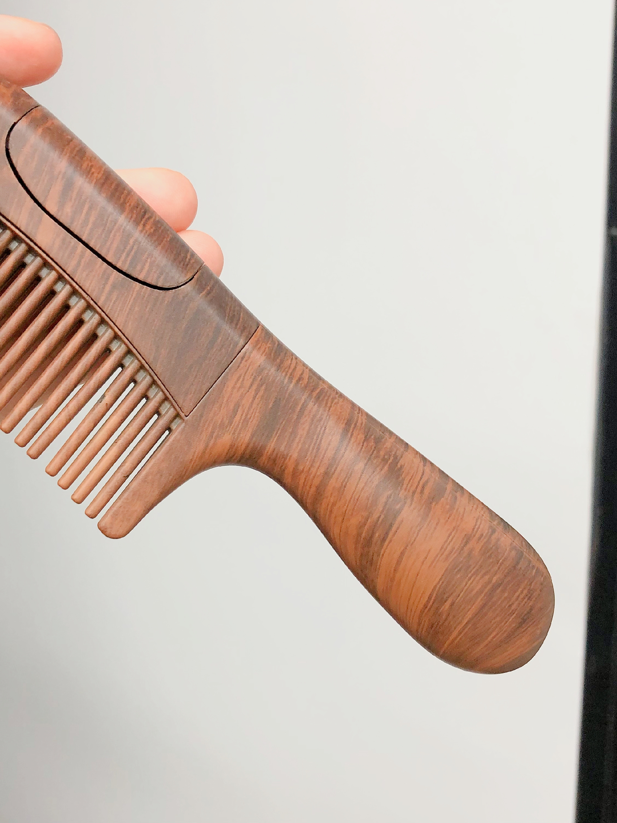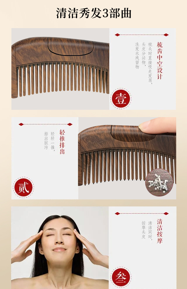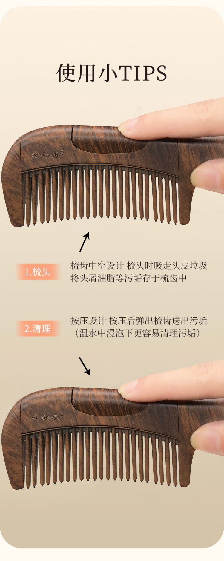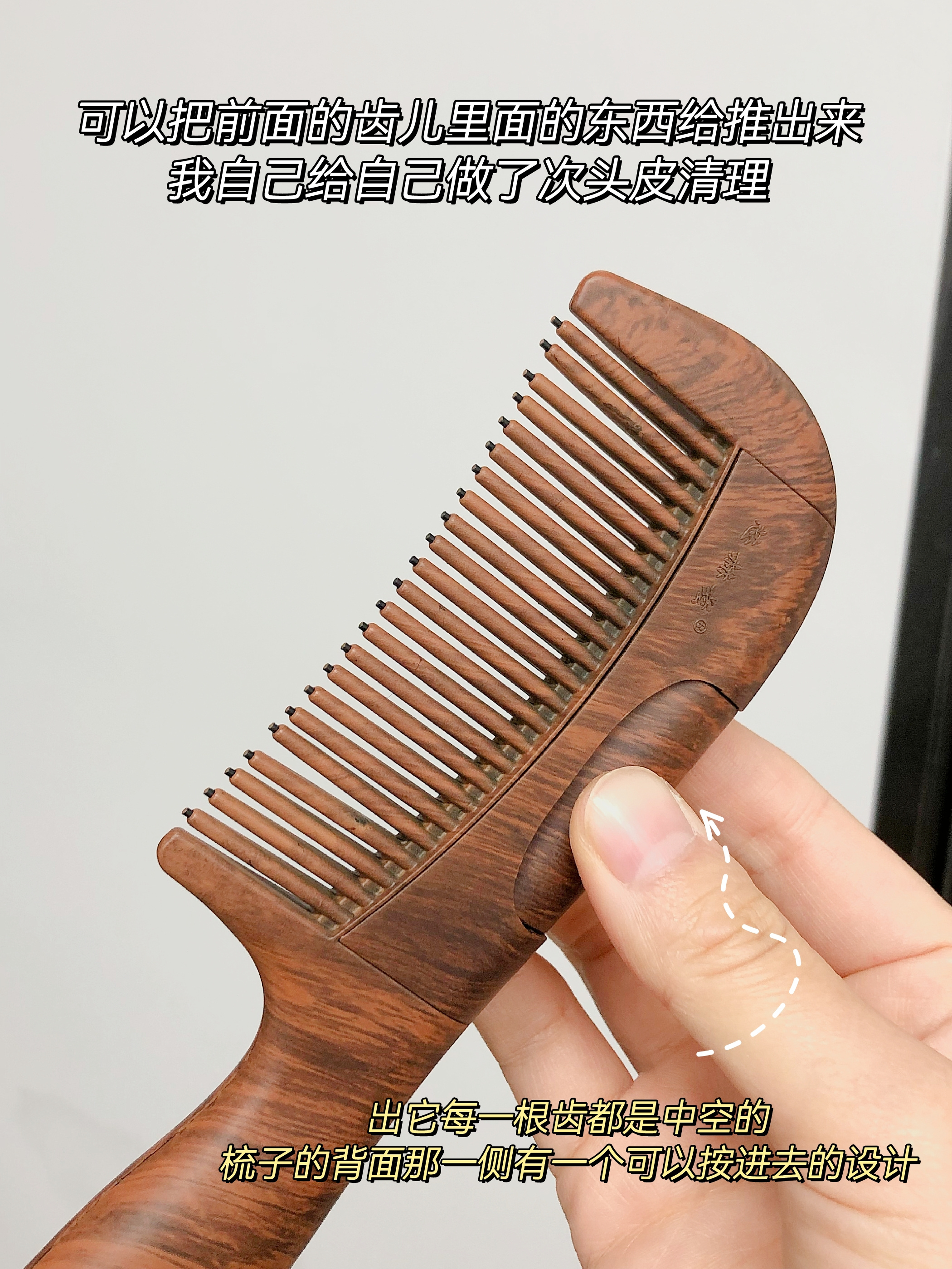 现在我们来看看它的细节 梳齿采用中空式设计 在梳理头发时,会将头屑油脂、污垢等存于梳芯中 深度清理毛囊,从而让头皮得到更好的清理效果 梳峰按压设计 每次梳完之后,轻轻一按,里面的头屑污垢就被梳芯推出啦 整齐的梳芯,按压梳头的时候还可以按摩头皮 疏通经络,改善头皮及头发的健康哦 厚实圆润的梳柄 握感舒服,梳理时轻松不费力
