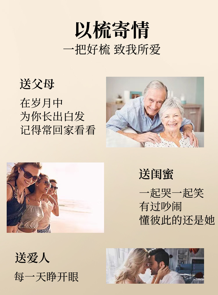 送梳子的含义你知道吗? 梳子送不同人,也代表着不同含义 送长辈:代表着健康快乐,把烦恼都梳走 送恋人:代表着相思,不论是给男朋友还是给女朋友 都有浓浓情意,青丝白发卿长在,细水流年卿不离 送闺蜜:愿岁月可以回首,且以梳篦寄情深 送新婚夫妇:所谓“一梳梳到底,二梳白发齐眉,三梳子孙满堂”