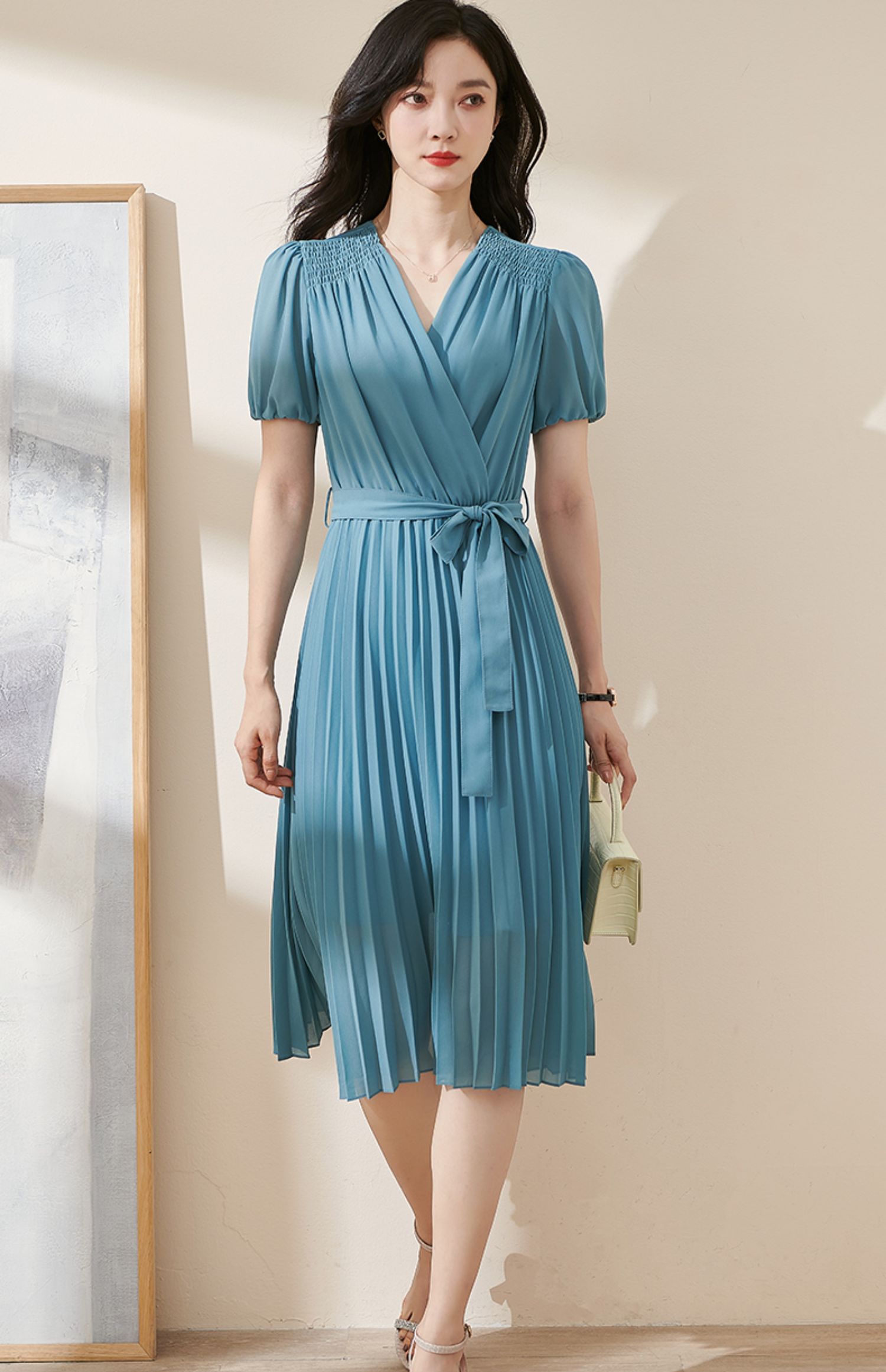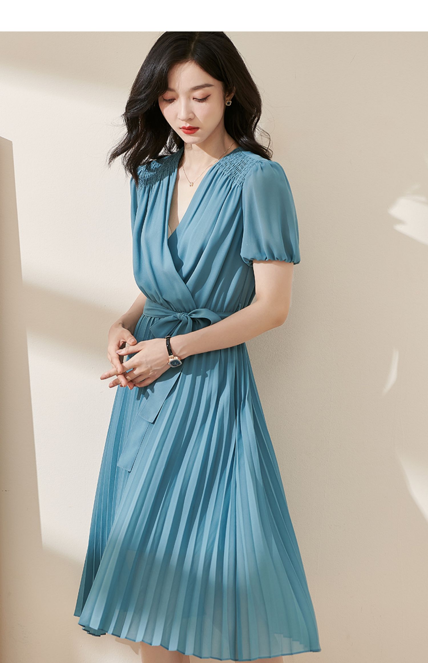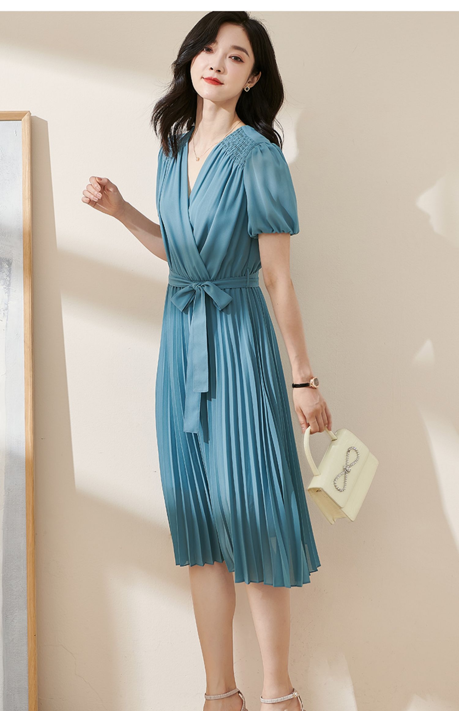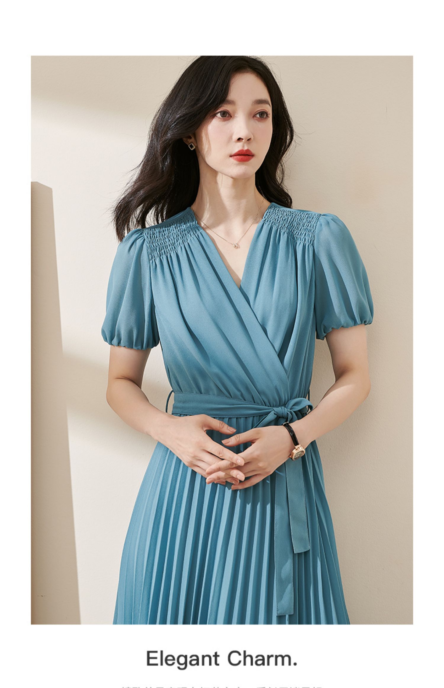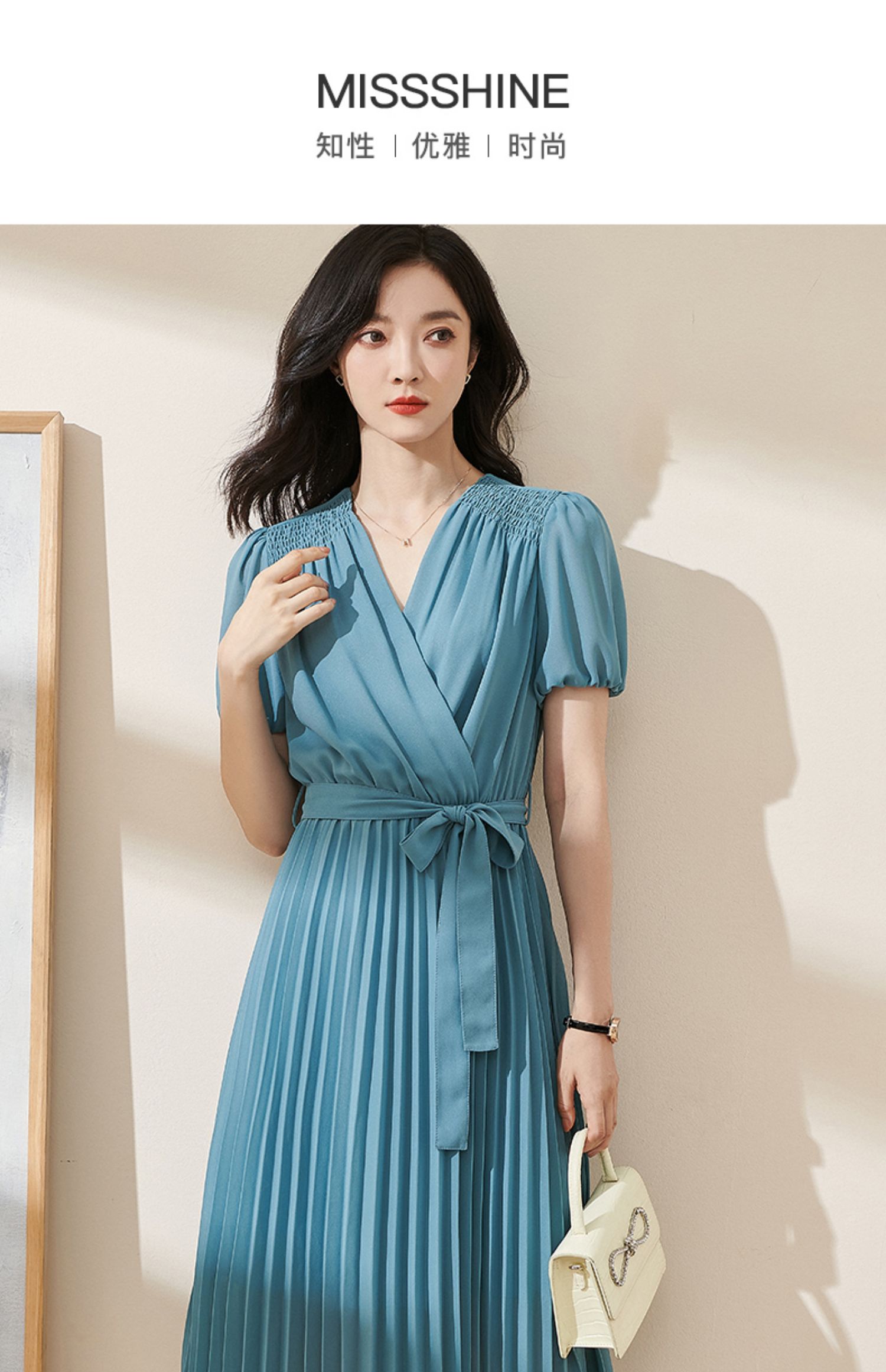 剩M/L/XL/XXL 米思阳2025夏季新款优雅气质淑女短袖连衣裙纯色百褶大摆裙1551