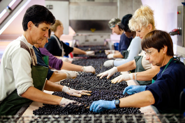 酒庄采用的修剪方式为双居由式(Guyot Double),给葡萄保留两根长枝并除芽。人力进行的细致修剪工作,为确保果实成熟度一致,打好了基础。全程手工采摘体现了对果实的尊重,采收回来的葡萄被放在多层小箱子里,入库的过程中,不合格的果实会根据重力原理顺势掉出筐外。
