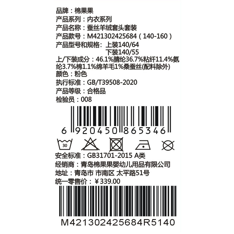 棉果果冬季新品羊绒蚕丝柔软保暖140-160码大码中大童蚕丝羊绒套头套装M421302425684