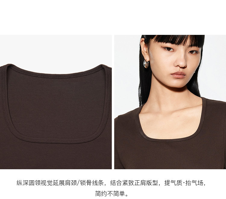 纵深圆领视觉延展肩颈 / 锁骨线条,结合紧致正肩版型,