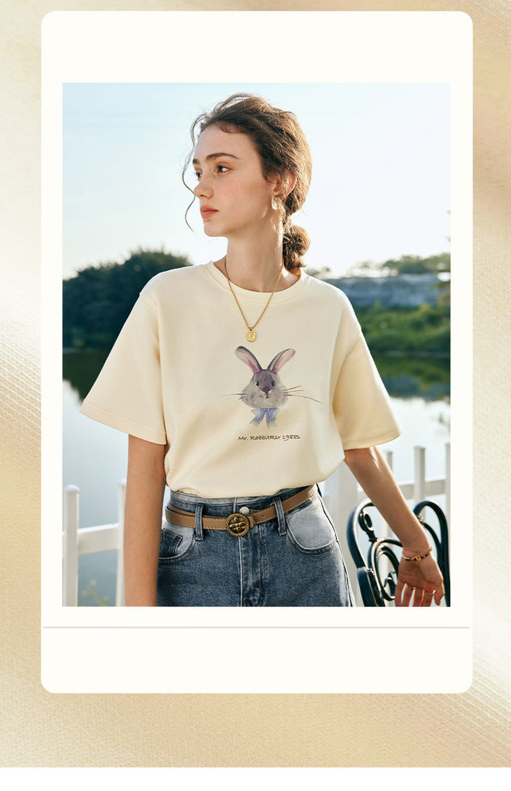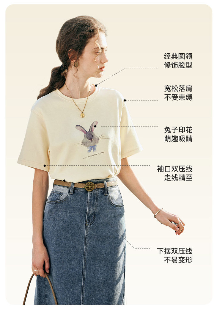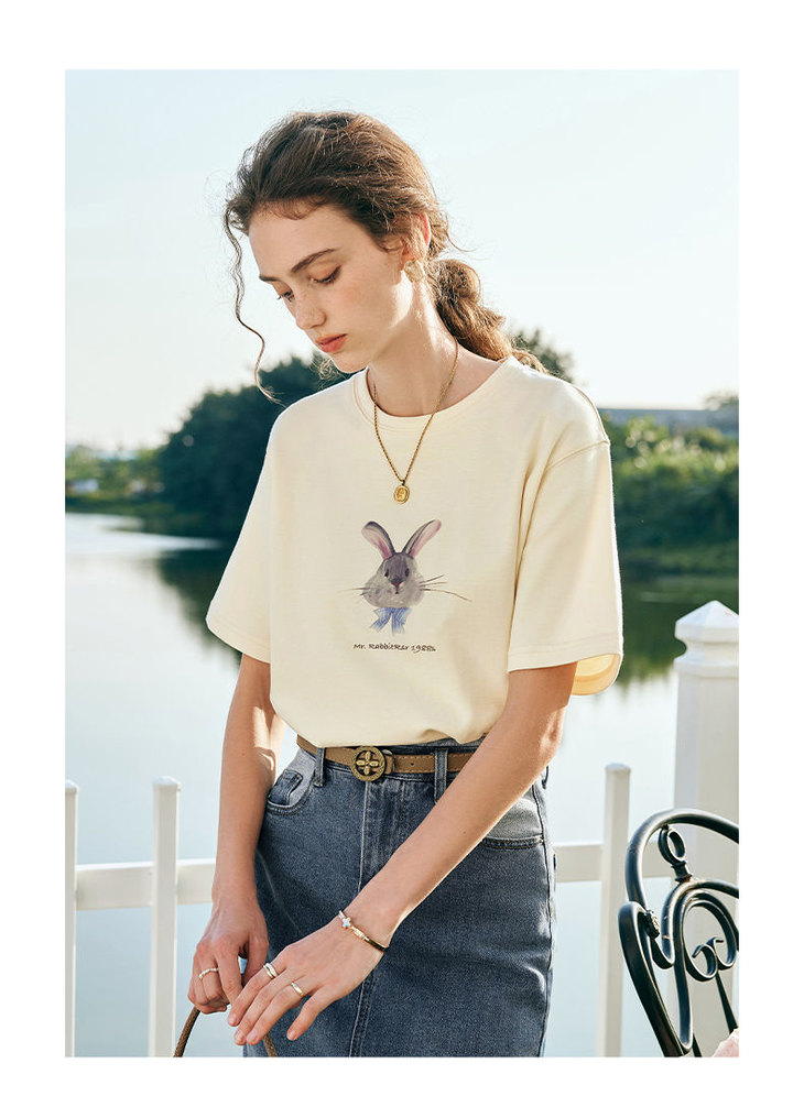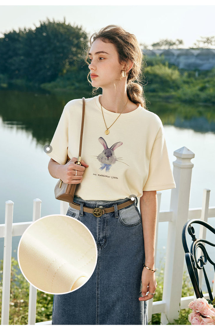 欧芮儿法式短袖T恤女夏装新款宽松卡通兔子印花上衣设计感体恤衫