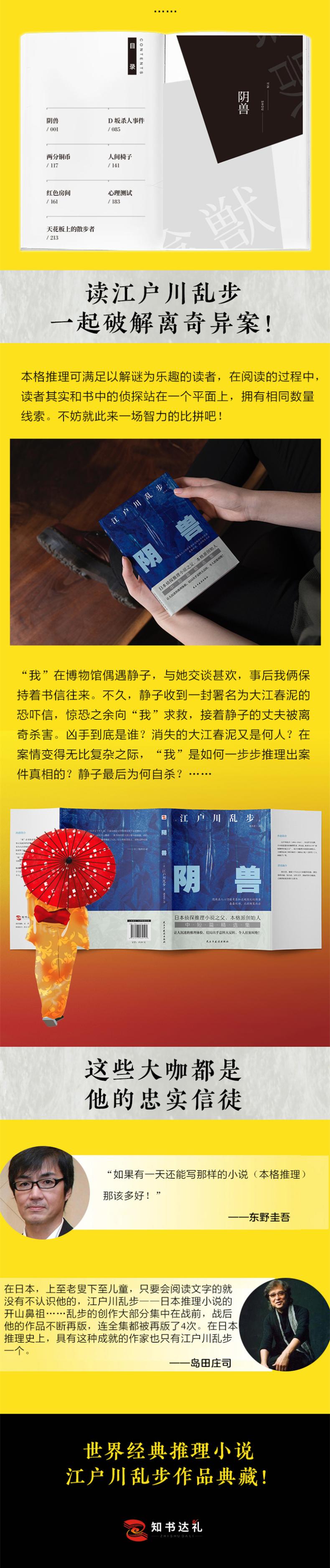 “我”在博物馆偶遇静子,与她交谈甚欢,事后我俩保持着书信往来。不久,静子收到一封署名为大江春泥的恐吓信,惊恐之余向“我”求救,接着静子的丈夫被离奇杀害。凶手到底是谁?消失的大江春泥又是何人?在案情变得无比复杂之际,“我”是如何一步步推理出案件真相的?静子最后为何自杀?……本书共收录《阴兽》《D坂杀人事件》《两分铜币》《人间椅子》等7篇中短篇小说,讲述了一个个扑朔迷离、充满悬念又妖异诡谲的故事。阅读本书,跟随江户川乱步一起解开众多的谜团。