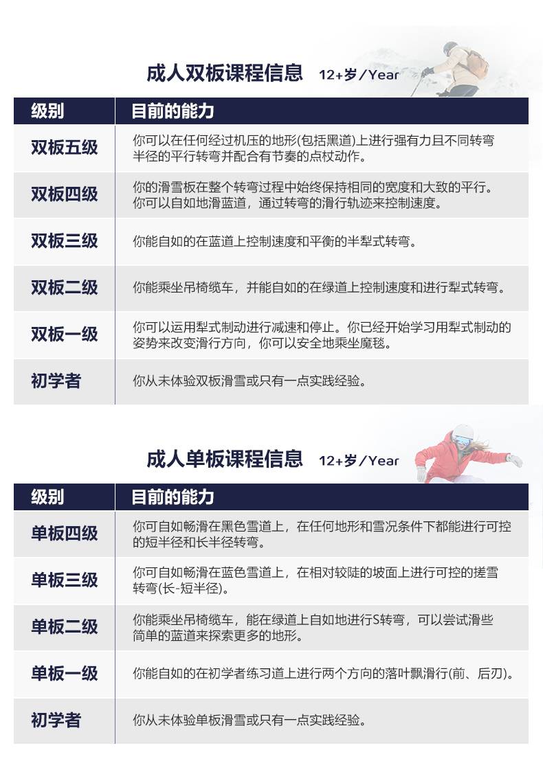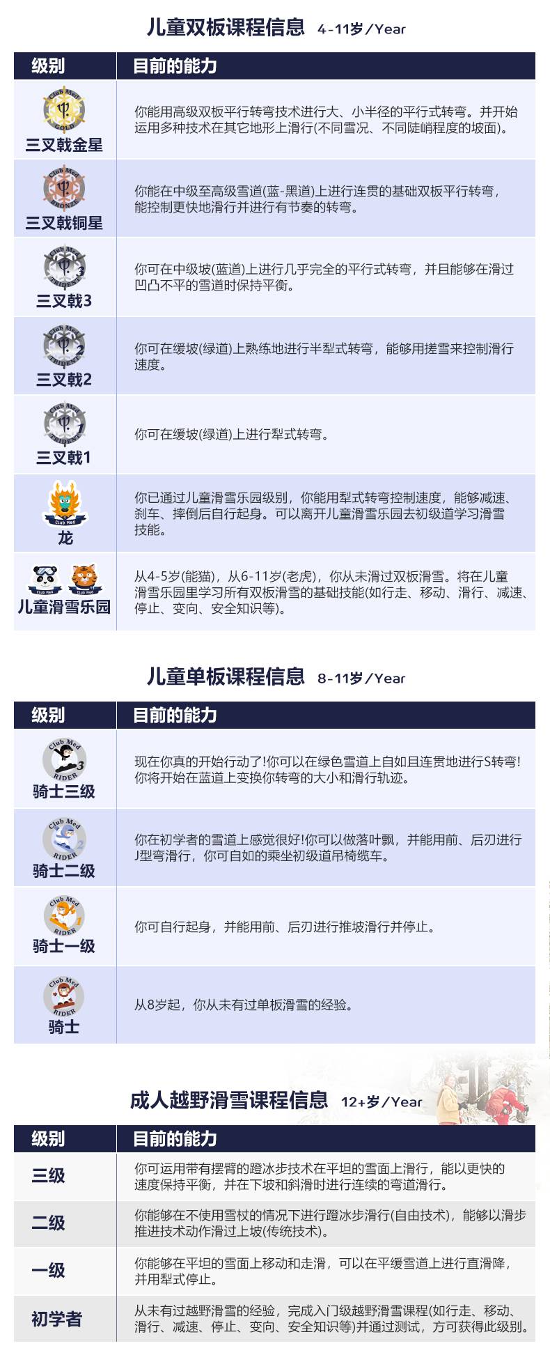 · 滑雪课程:儿童双板课程仅限4岁及以上儿童,儿童单板课程仅限8岁及以上儿童。