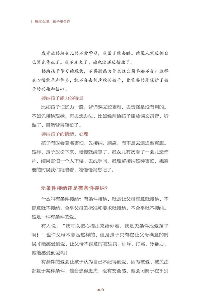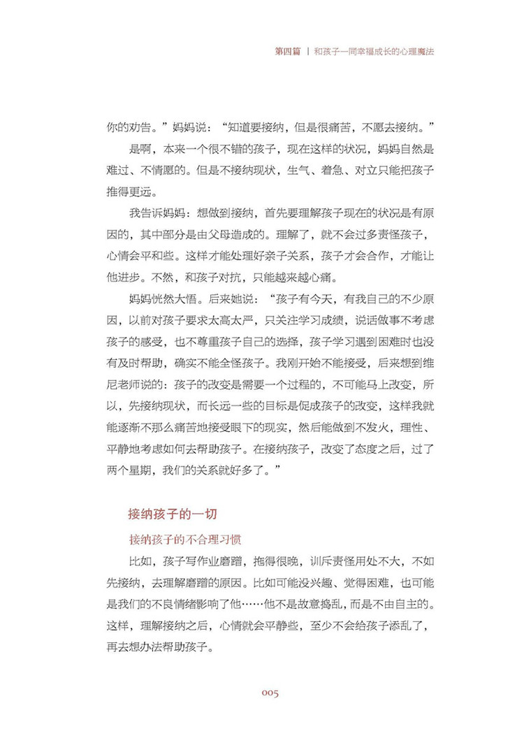 这也是个人心理成长的自助读本。育儿不是简单的事情,它考量的是父母的心理、智慧。很多人也许在职场上成功,但是在家里动辄发火、打骂孩子,心态不平和;育儿方法简单、粗暴、生硬、不灵活,缺乏智慧。所以,家庭教育就是一场修行,看起来是为了教育孩子,实则首先需要提升的是自己。
