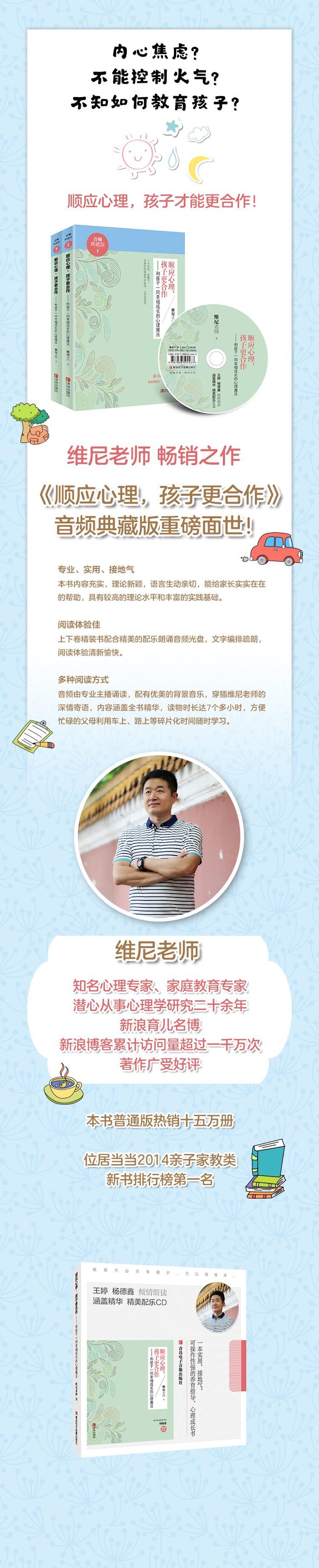本书将心理学认知疗法、行为主义学、人本主义学理论运用在家庭教育中,内容充实,理论新颖,语言生动亲切,很接地气,能给家长实实在在的帮助,具有较高的理论水平和丰富的实践基础,同时加上精美的配乐朗诵音频光盘,做成上下卷精装书,精装书文字编排疏朗,阅读清新愉快。