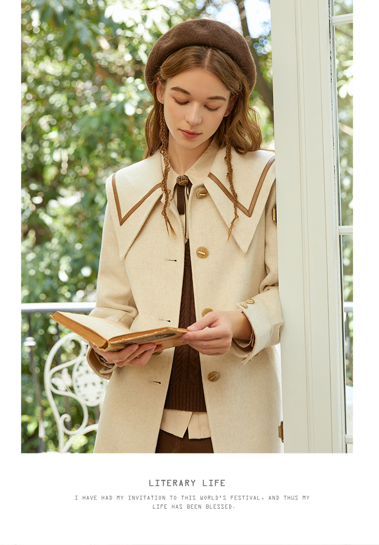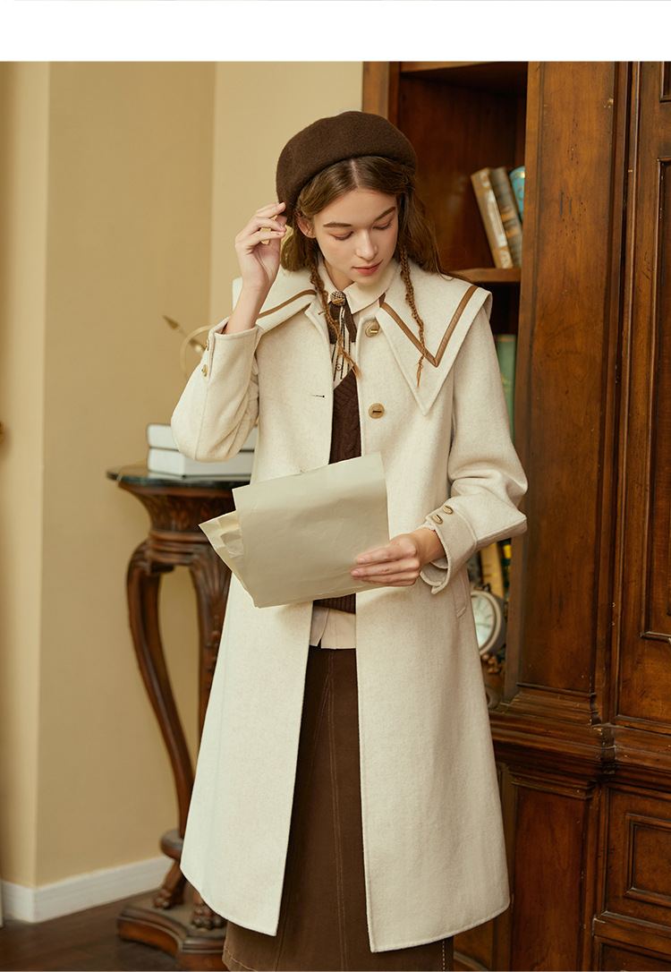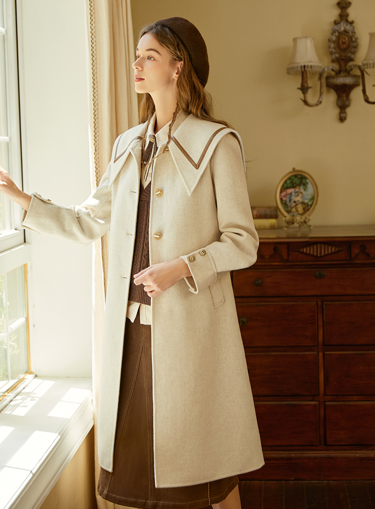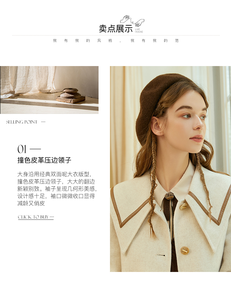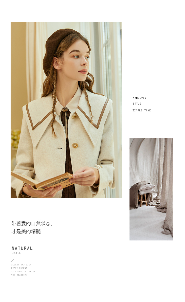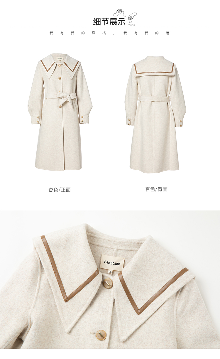 Famecoco范可儿双面呢大衣秋冬pu皮拼接撞色毛呢外套女F228AQ006