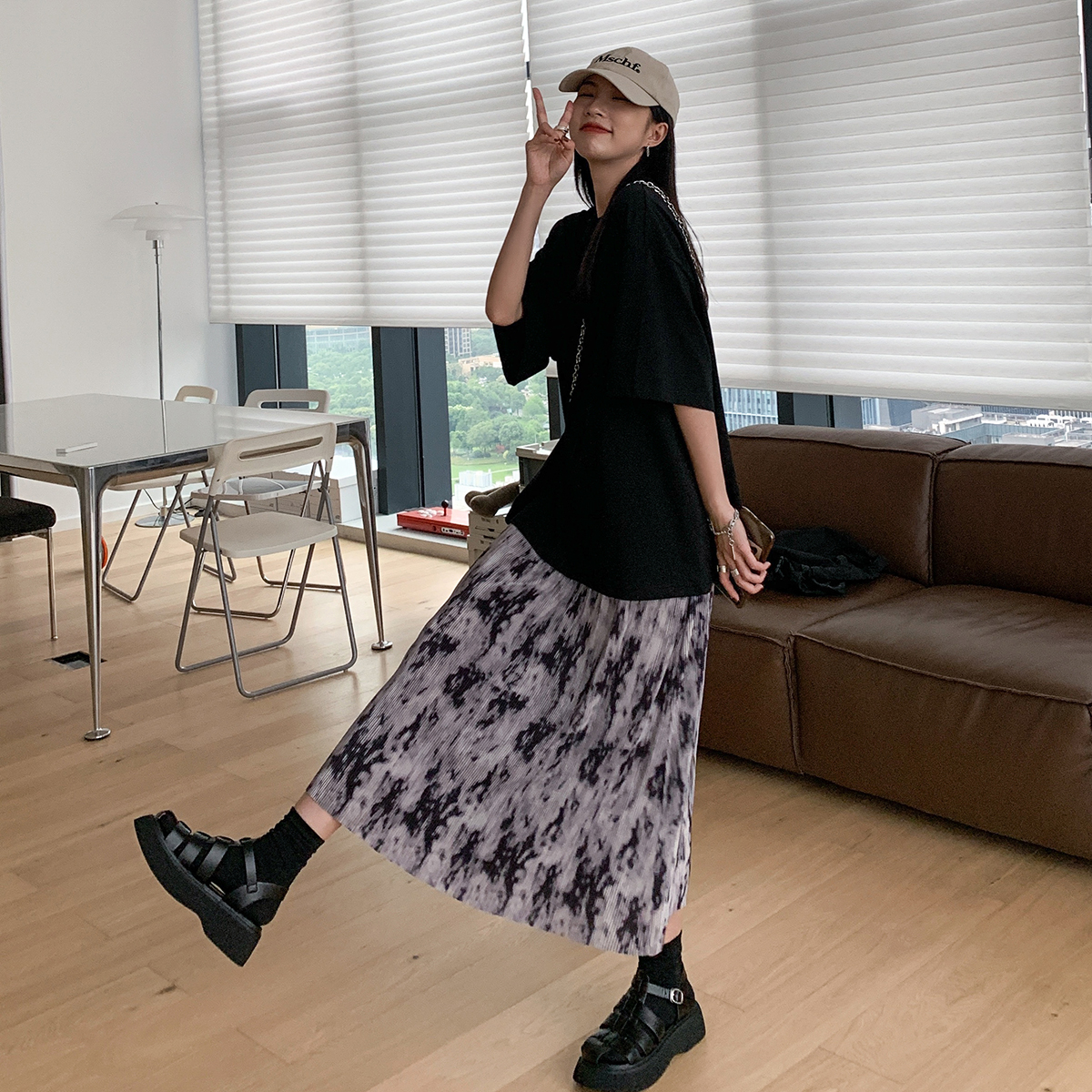 3、压褶的伞裙设计,长度刚好到小脚,遮肉还能修饰腿部线条