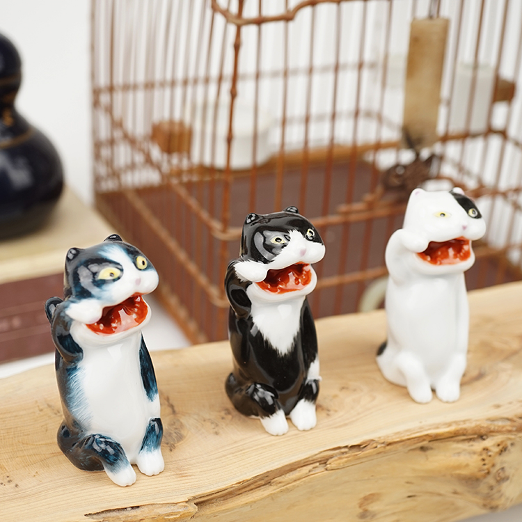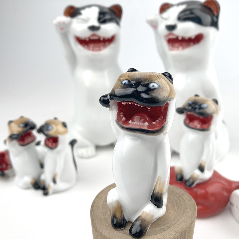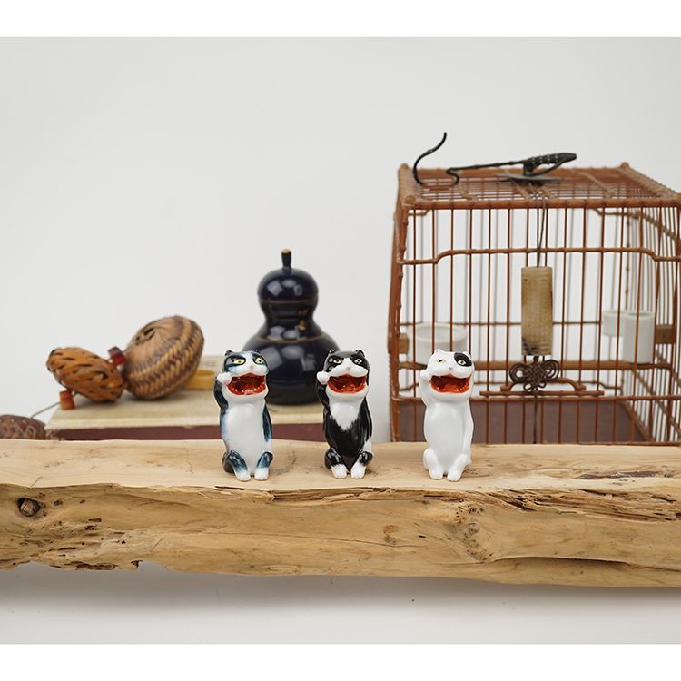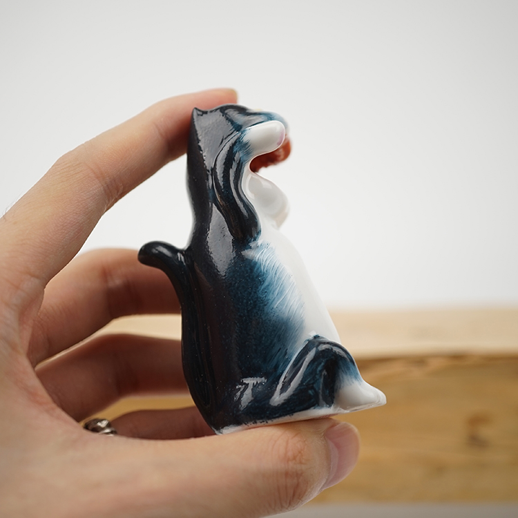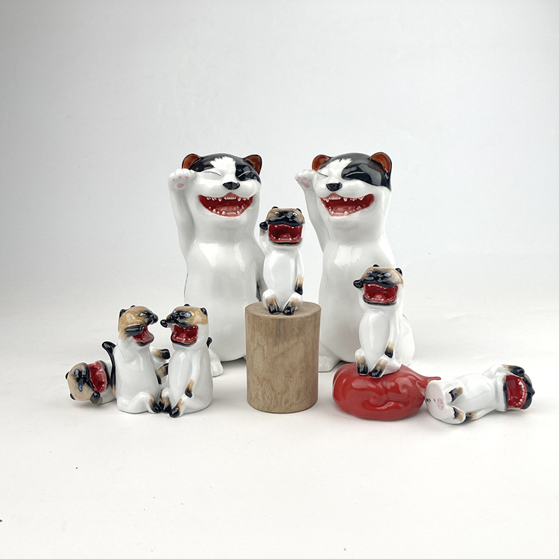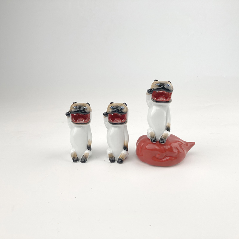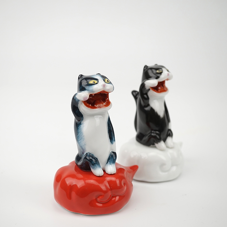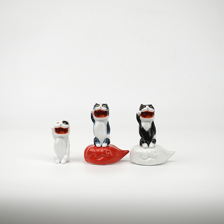 釉上彩手绘迷你招财猫一只瓷猫的诞生要经过十几个工序,首先制作陶泥雕塑,再用硅胶模翻制成树脂模型,经过打磨修整再次翻制成模种,整个制作打磨都由薛继业老师亲手完成,陶瓷雕塑必须使用石膏活模,一只猫要切割成三个部分才能完整的把所有牙齿舌头爪子尾巴的细节翻制出来,再把三个部分用泥浆衔接起来,一套模具在正常天气仅仅能做五只,冬天只能三只,成型的猫泥坯要经过一周的阴干,入窑素烧500℃后,在胎体上用青花绘画,再喷上高白釉再次入窑烧制八小时,温度达到1310℃,出窑冷却后再用砂轮修整底面,贴上底款贴花,再次入窑烧至800℃终完成,只有景德镇特有的优质瓷泥和釉料,才能烧制出如此玲珑剔透、温润洁白的招财猫。不同于以往的款式,此三款迷你招财猫为釉上彩纯手绘,每一缕毛发都历历在目,小猫变得栩栩如生的同时,略夸张的外形又让人不会感到俗气。新款釉上彩暹罗猫老款黑白蓝黑白蓝祥云底座