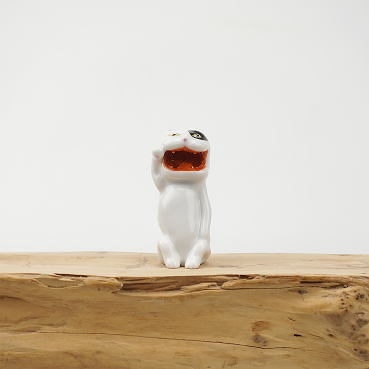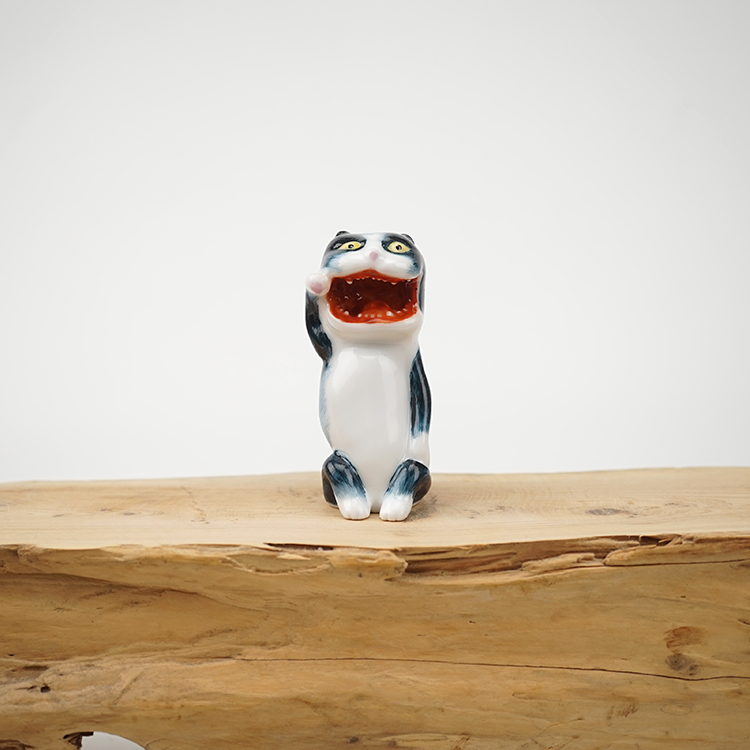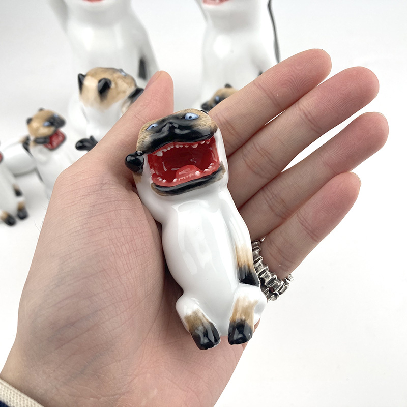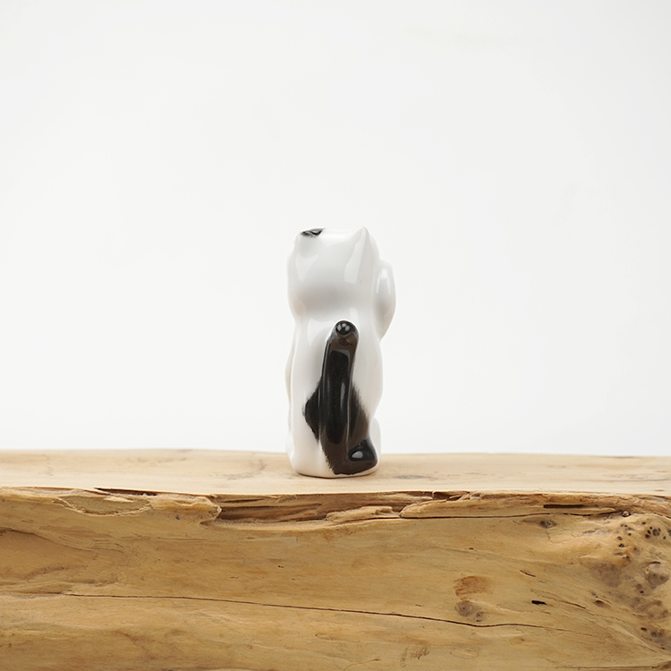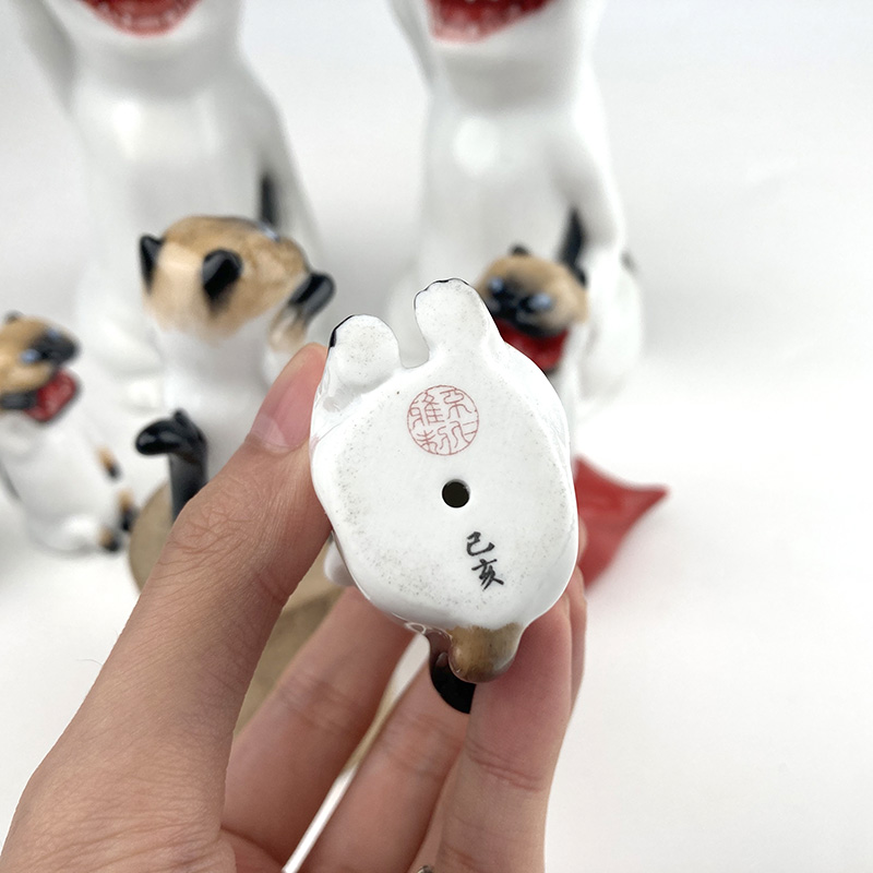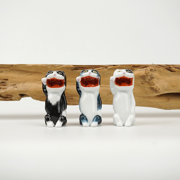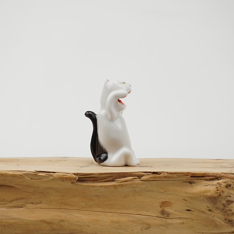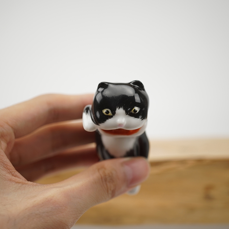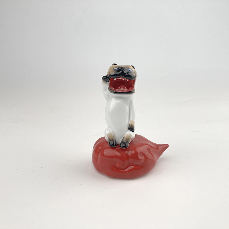 釉上彩手绘迷你招财猫一只瓷猫的诞生要经过十几个工序,首先制作陶泥雕塑,再用硅胶模翻制成树脂模型,经过打磨修整再次翻制成模种,整个制作打磨都由薛继业老师亲手完成,陶瓷雕塑必须使用石膏活模,一只猫要切割成三个部分才能完整的把所有牙齿舌头爪子尾巴的细节翻制出来,再把三个部分用泥浆衔接起来,一套模具在正常天气仅仅能做五只,冬天只能三只,成型的猫泥坯要经过一周的阴干,入窑素烧500℃后,在胎体上用青花绘画,再喷上高白釉再次入窑烧制八小时,温度达到1310℃,出窑冷却后再用砂轮修整底面,贴上底款贴花,再次入窑烧至800℃终完成,只有景德镇特有的优质瓷泥和釉料,才能烧制出如此玲珑剔透、温润洁白的招财猫。不同于以往的款式,此三款迷你招财猫为釉上彩纯手绘,每一缕毛发都历历在目,小猫变得栩栩如生的同时,略夸张的外形又让人不会感到俗气。新款釉上彩暹罗猫老款黑白蓝黑白蓝祥云底座