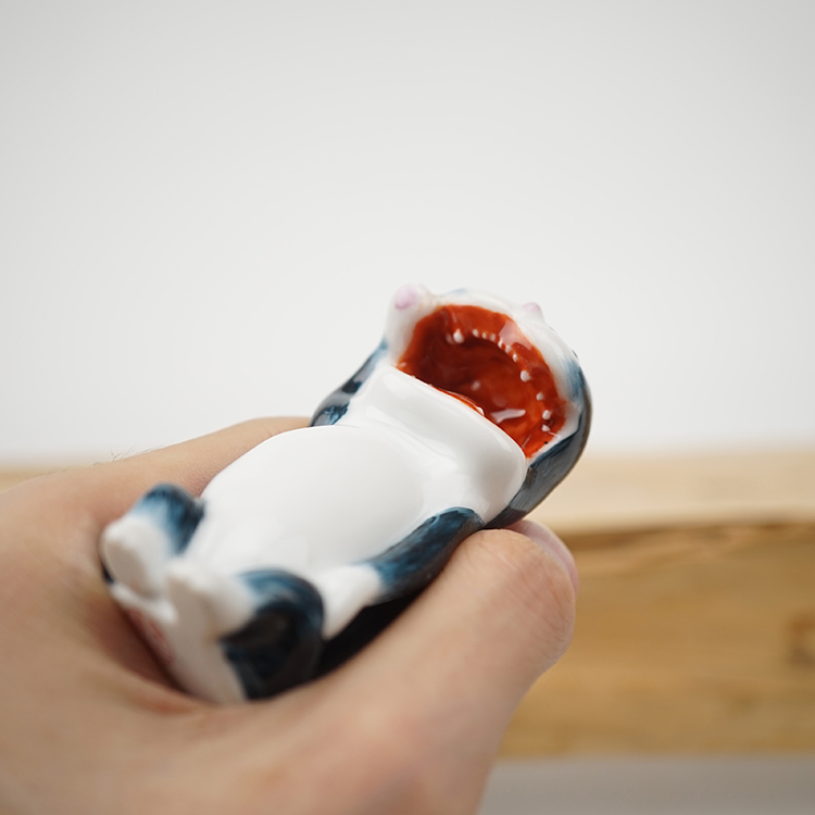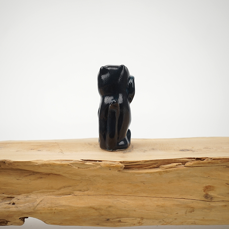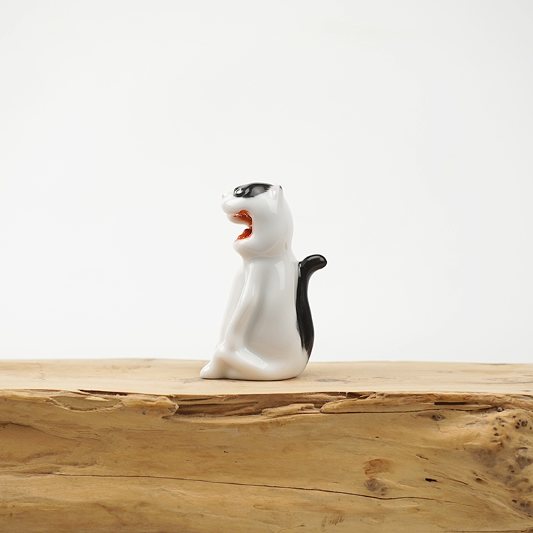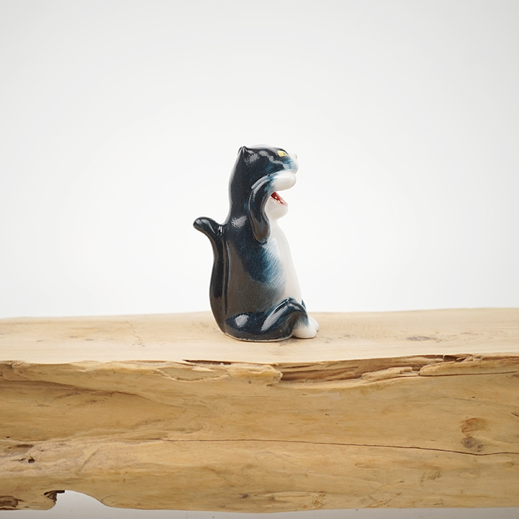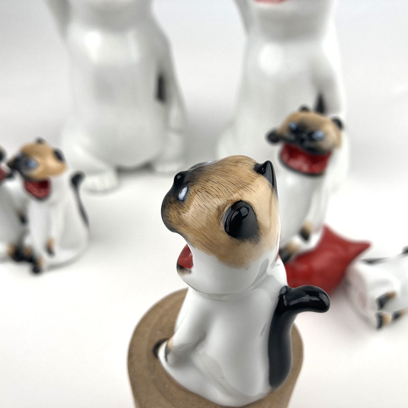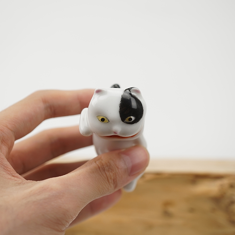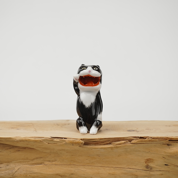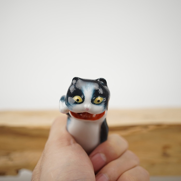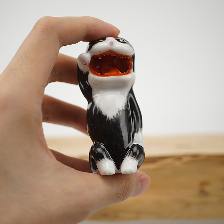 釉上彩手绘迷你招财猫一只瓷猫的诞生要经过十几个工序,首先制作陶泥雕塑,再用硅胶模翻制成树脂模型,经过打磨修整再次翻制成模种,整个制作打磨都由薛继业老师亲手完成,陶瓷雕塑必须使用石膏活模,一只猫要切割成三个部分才能完整的把所有牙齿舌头爪子尾巴的细节翻制出来,再把三个部分用泥浆衔接起来,一套模具在正常天气仅仅能做五只,冬天只能三只,成型的猫泥坯要经过一周的阴干,入窑素烧500℃后,在胎体上用青花绘画,再喷上高白釉再次入窑烧制八小时,温度达到1310℃,出窑冷却后再用砂轮修整底面,贴上底款贴花,再次入窑烧至800℃终完成,只有景德镇特有的优质瓷泥和釉料,才能烧制出如此玲珑剔透、温润洁白的招财猫。不同于以往的款式,此三款迷你招财猫为釉上彩纯手绘,每一缕毛发都历历在目,小猫变得栩栩如生的同时,略夸张的外形又让人不会感到俗气。新款釉上彩暹罗猫老款黑白蓝黑白蓝祥云底座