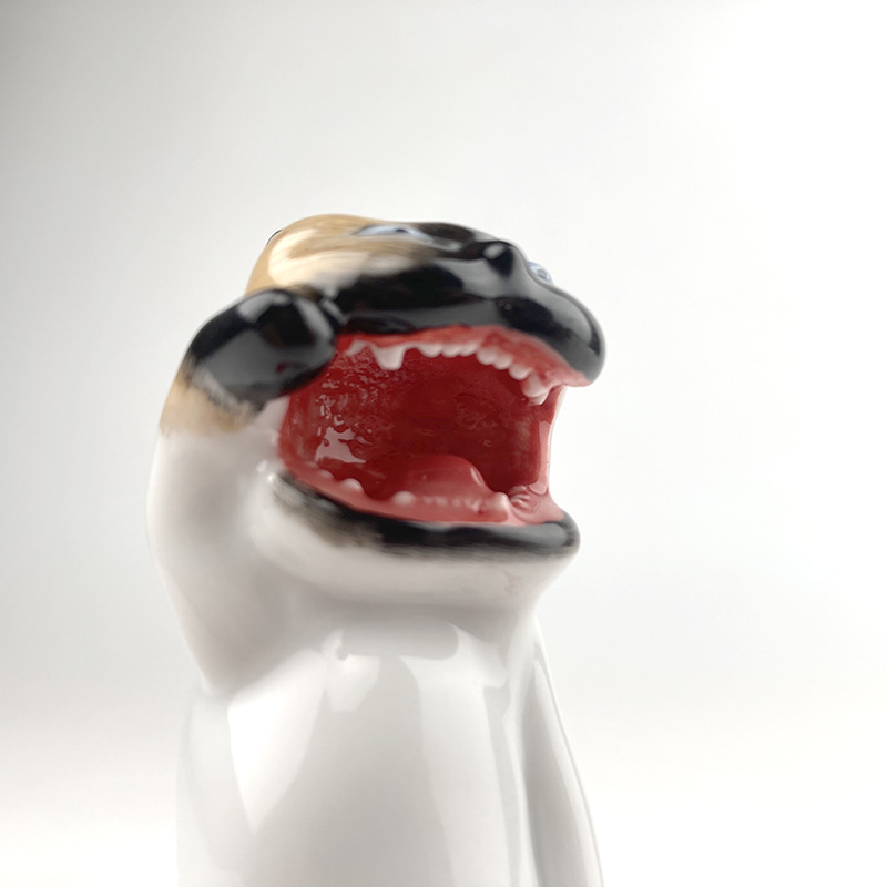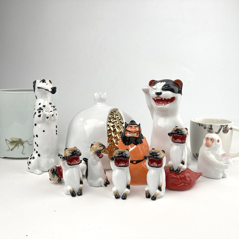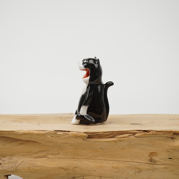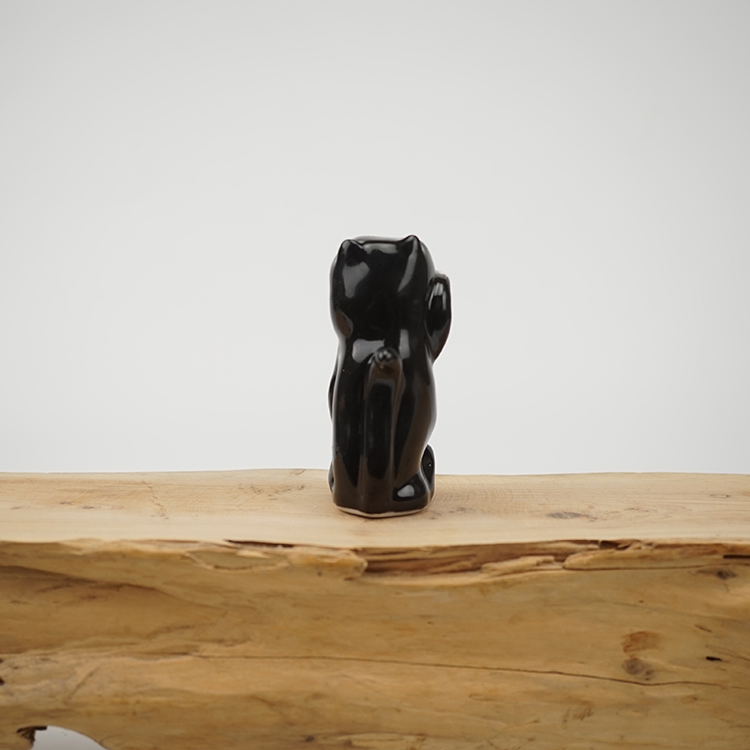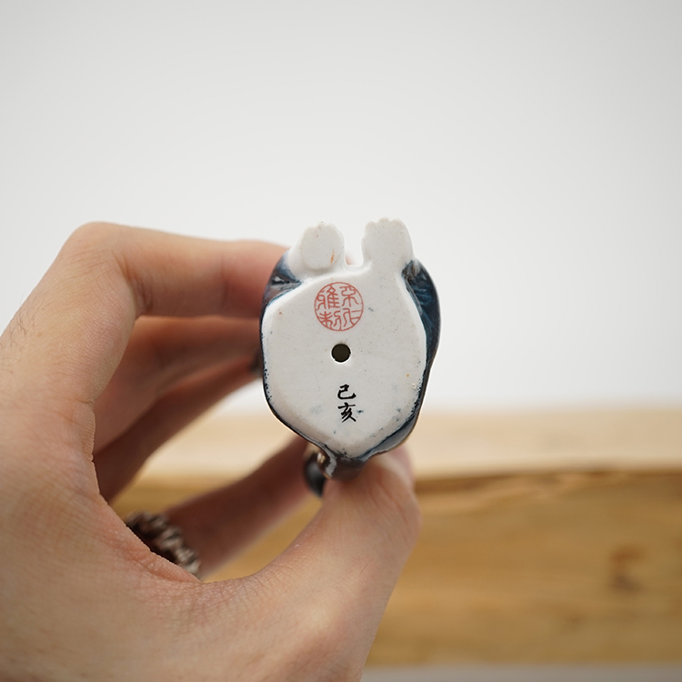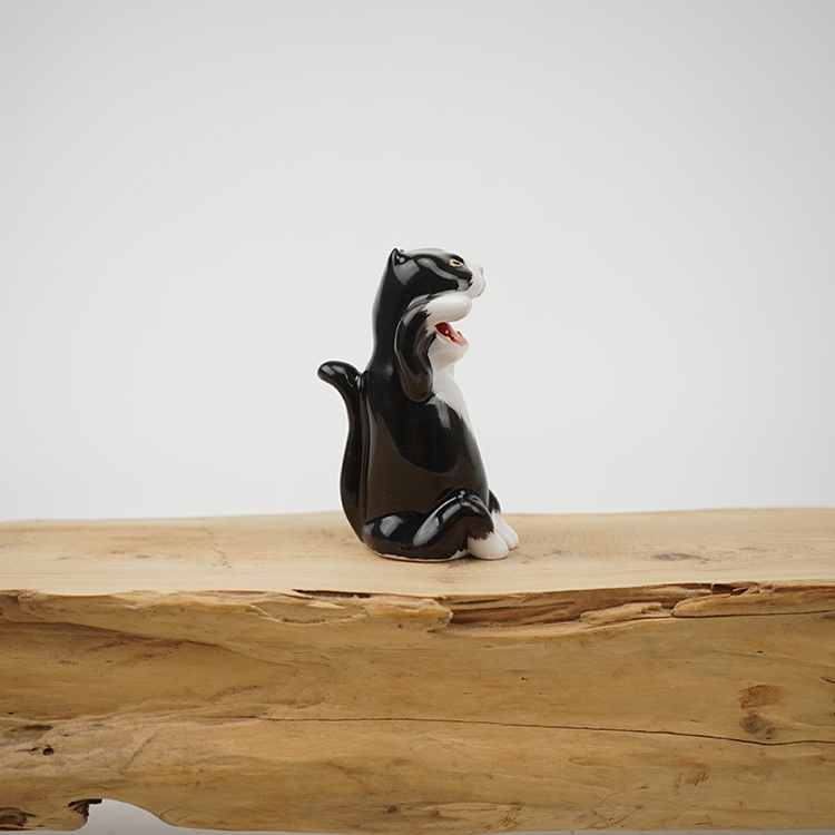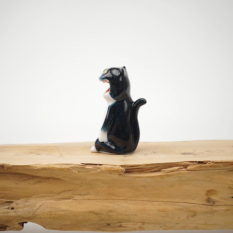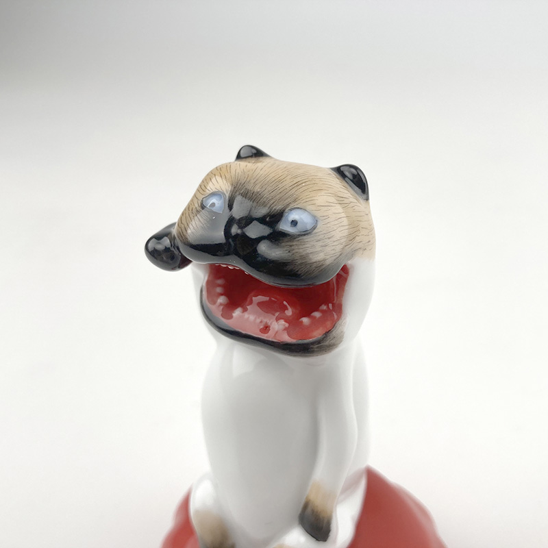 釉上彩手绘迷你招财猫一只瓷猫的诞生要经过十几个工序,首先制作陶泥雕塑,再用硅胶模翻制成树脂模型,经过打磨修整再次翻制成模种,整个制作打磨都由薛继业老师亲手完成,陶瓷雕塑必须使用石膏活模,一只猫要切割成三个部分才能完整的把所有牙齿舌头爪子尾巴的细节翻制出来,再把三个部分用泥浆衔接起来,一套模具在正常天气仅仅能做五只,冬天只能三只,成型的猫泥坯要经过一周的阴干,入窑素烧500℃后,在胎体上用青花绘画,再喷上高白釉再次入窑烧制八小时,温度达到1310℃,出窑冷却后再用砂轮修整底面,贴上底款贴花,再次入窑烧至800℃终完成,只有景德镇特有的优质瓷泥和釉料,才能烧制出如此玲珑剔透、温润洁白的招财猫。不同于以往的款式,此三款迷你招财猫为釉上彩纯手绘,每一缕毛发都历历在目,小猫变得栩栩如生的同时,略夸张的外形又让人不会感到俗气。新款釉上彩暹罗猫老款黑白蓝黑白蓝祥云底座