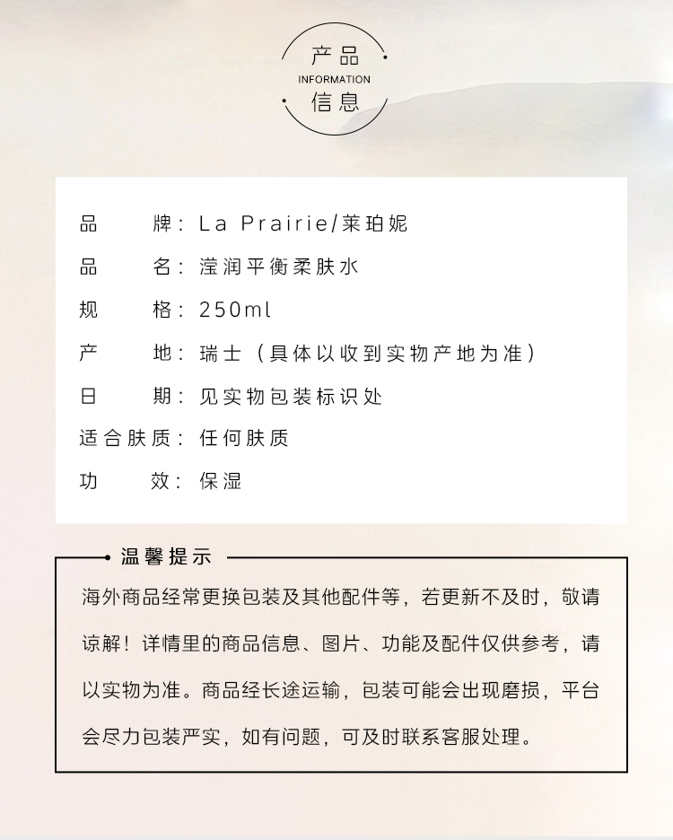 La Prairie莱珀妮水凝平衡精华柔肤水粉水250ml 保湿亮肤