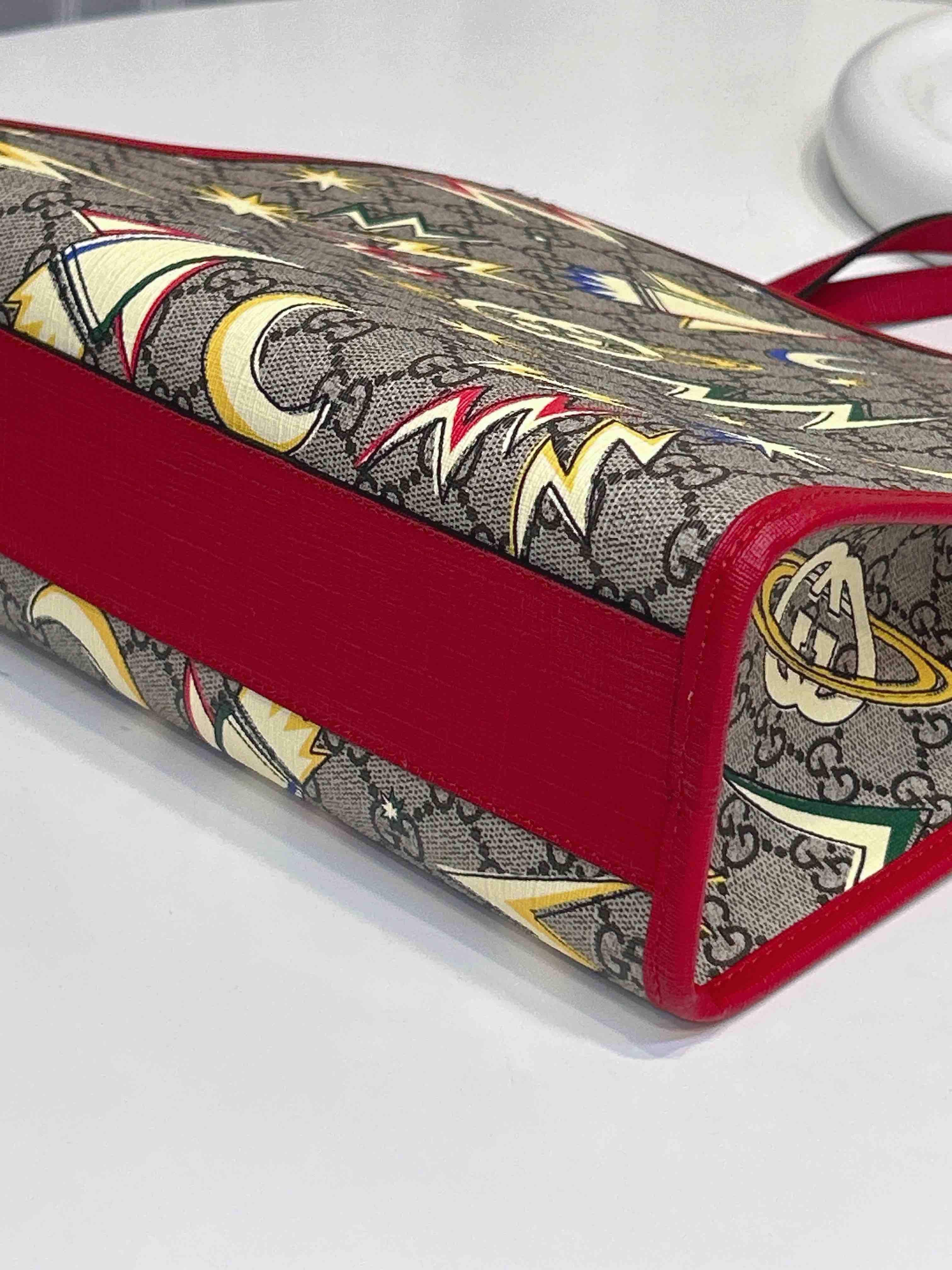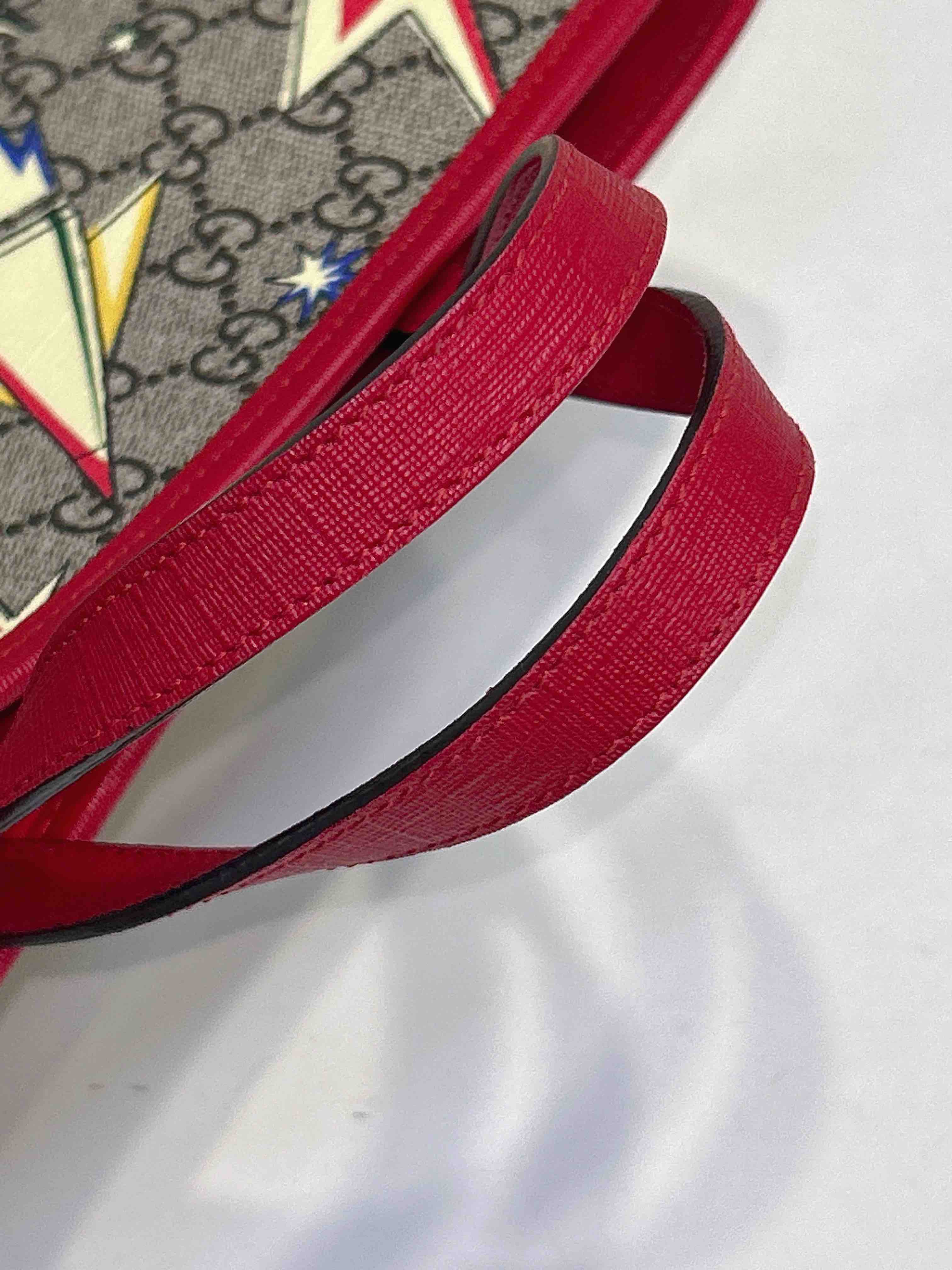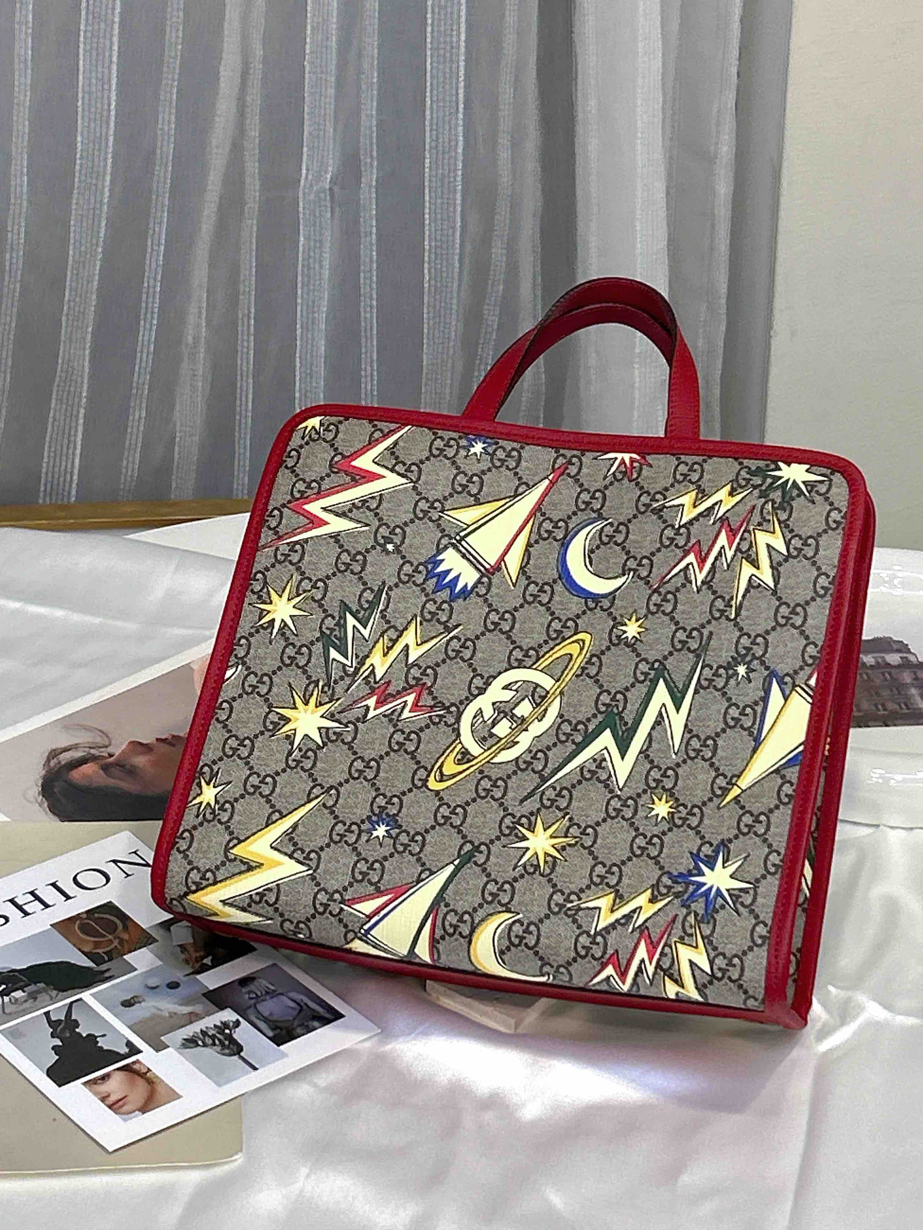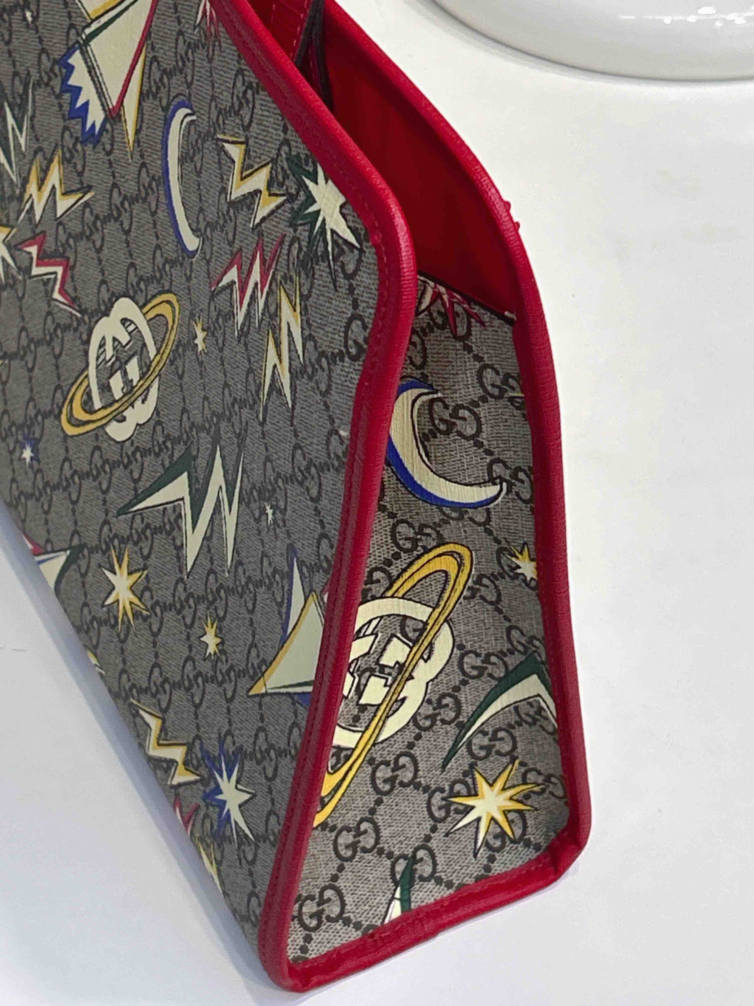 【商品详情】正品二手 Gucci 老花拼红色 太空星月 儿童包💫97新 28*24 配件:说明书。内里有一处小污渍。涂鸦彩绘童真可爱
