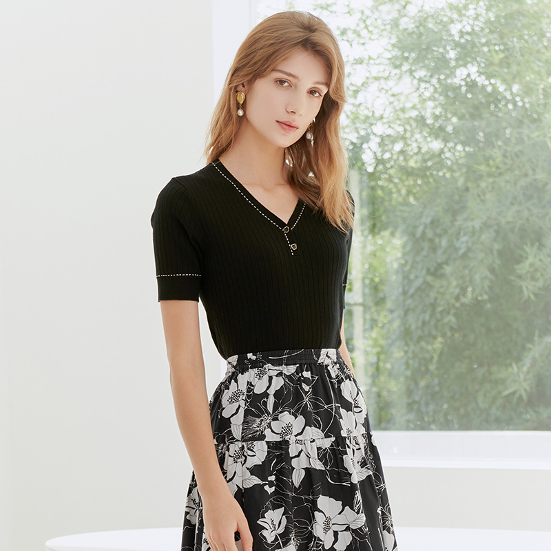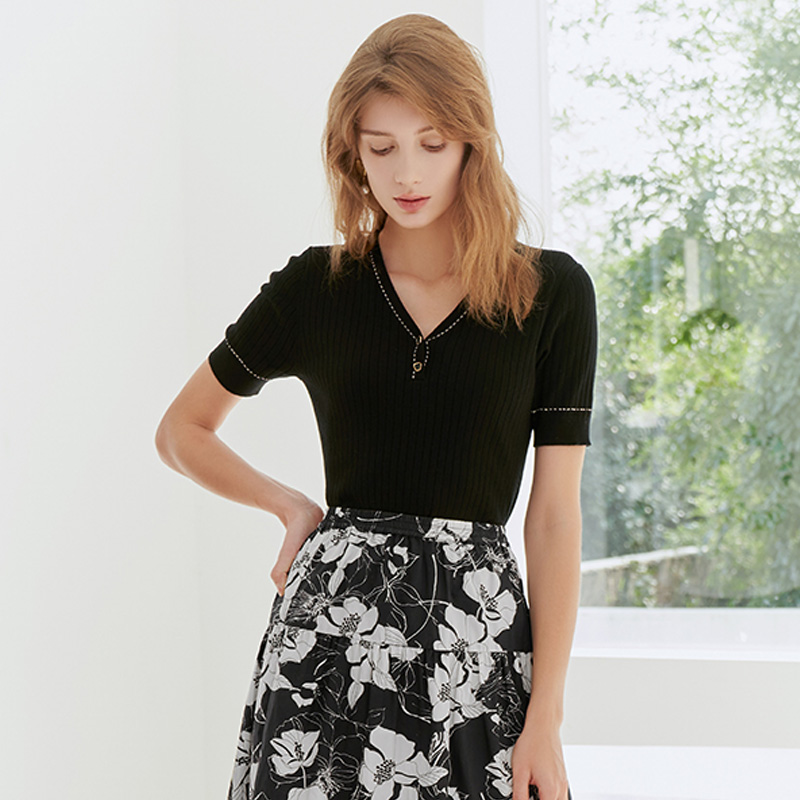 【棉+桑蚕丝针织套衫】23年夏季新品女士薄款修身显瘦针织衫短袖V领上衣
