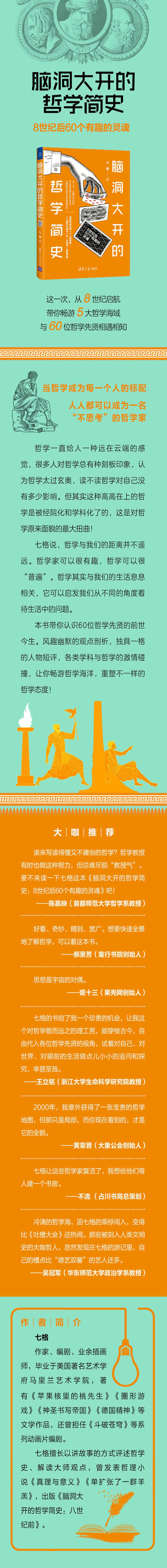 七格擅长以讲故事的方式评述哲学史、解读大师观点,曾发表哲理小说《真理与意义》《单扩张了一群羊羔》,出版《脑洞大开的哲学简史:八世纪前》。