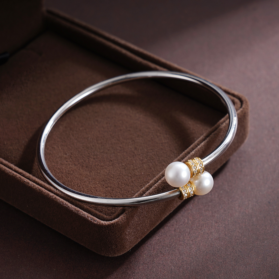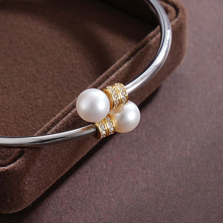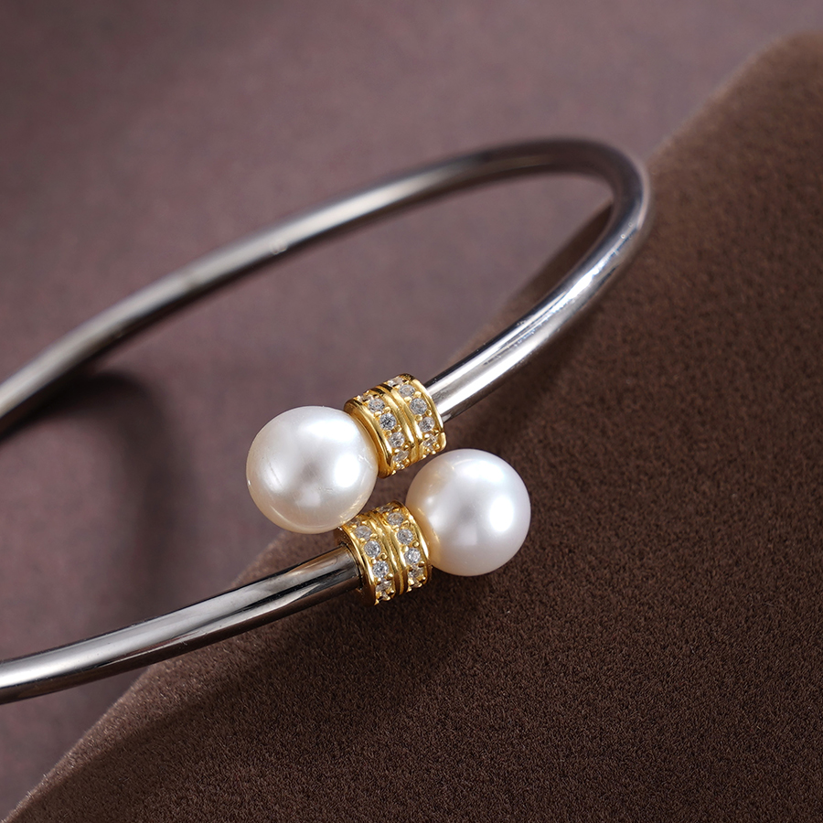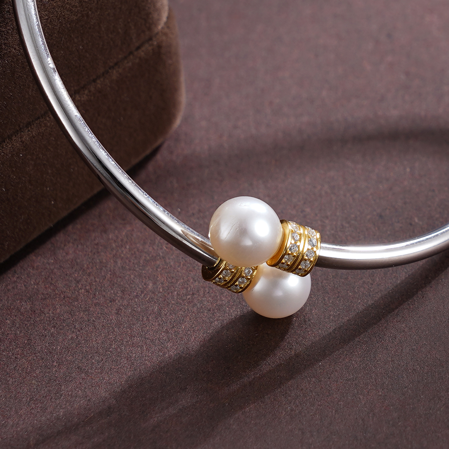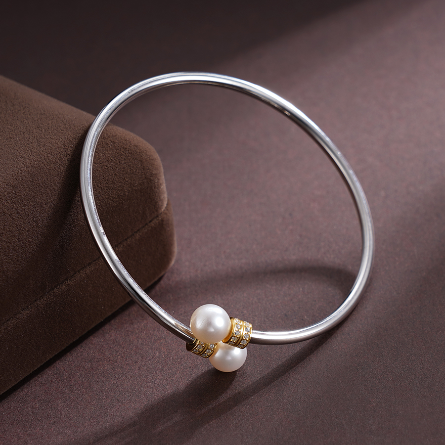 【寓意】:手镯纯银材质,抛光工艺打磨,接口处嵌合莹润珍珠,造型简约却显格调。珠光流转间,勾勒出低调奢华的气质美学。