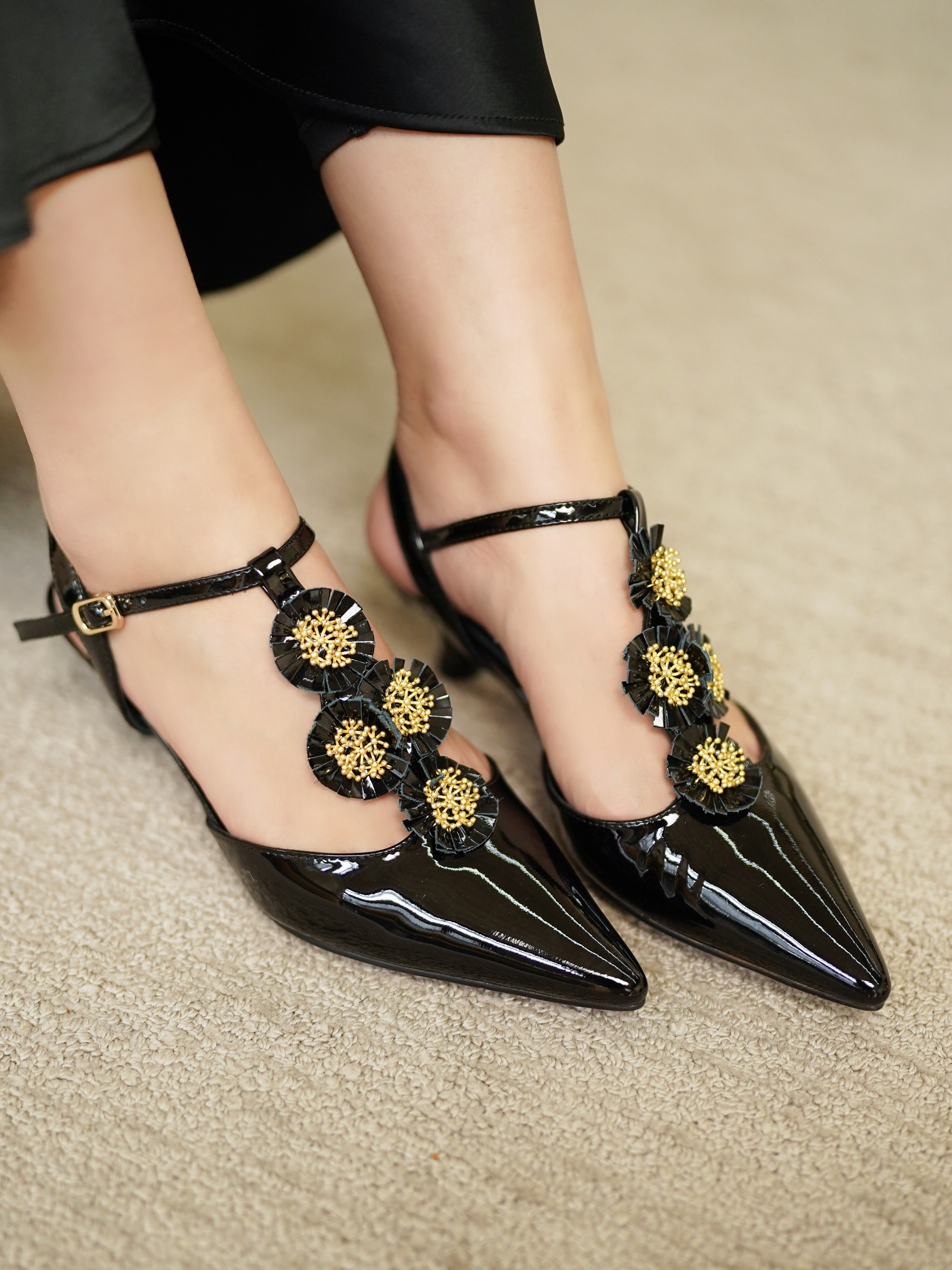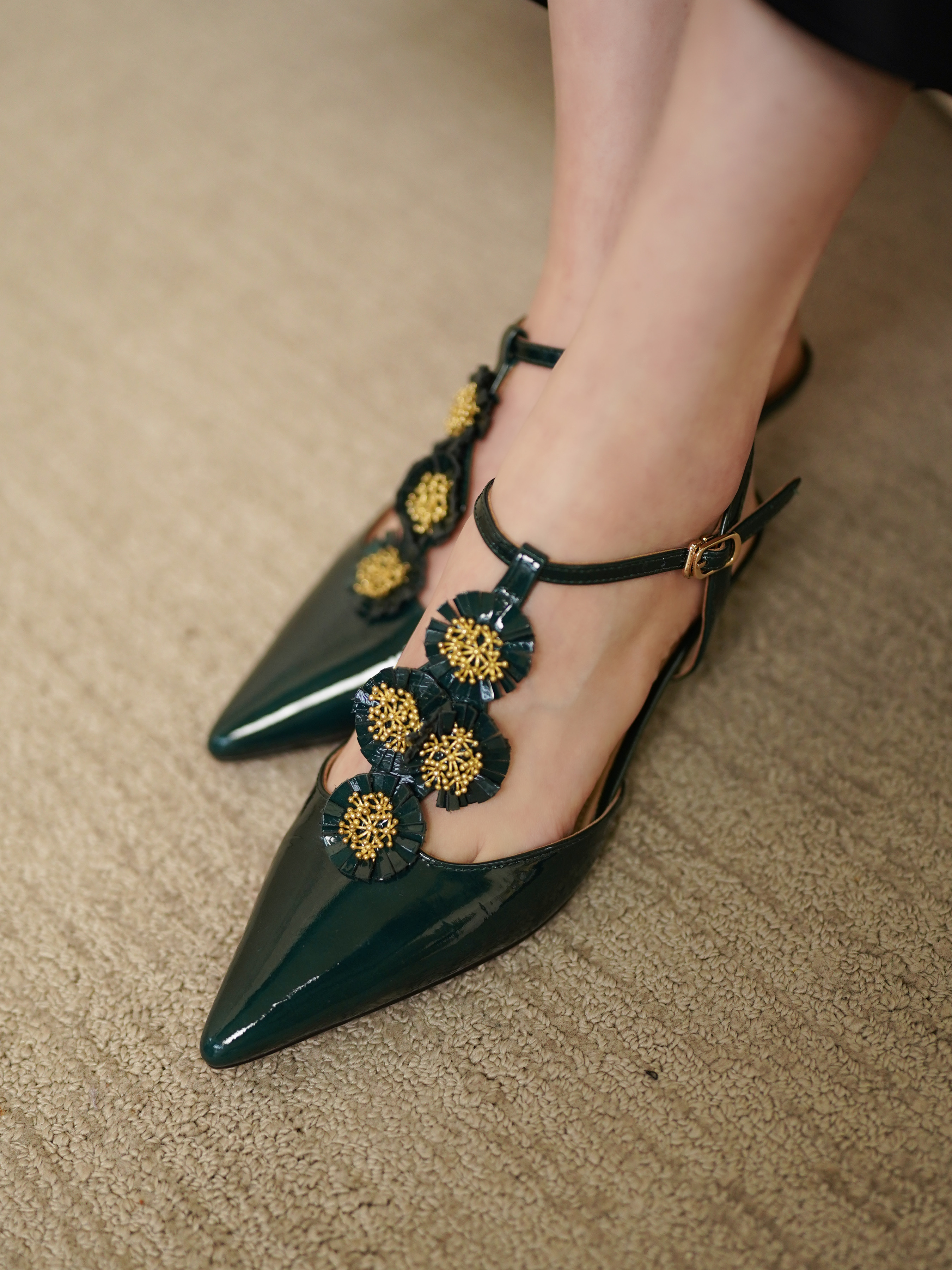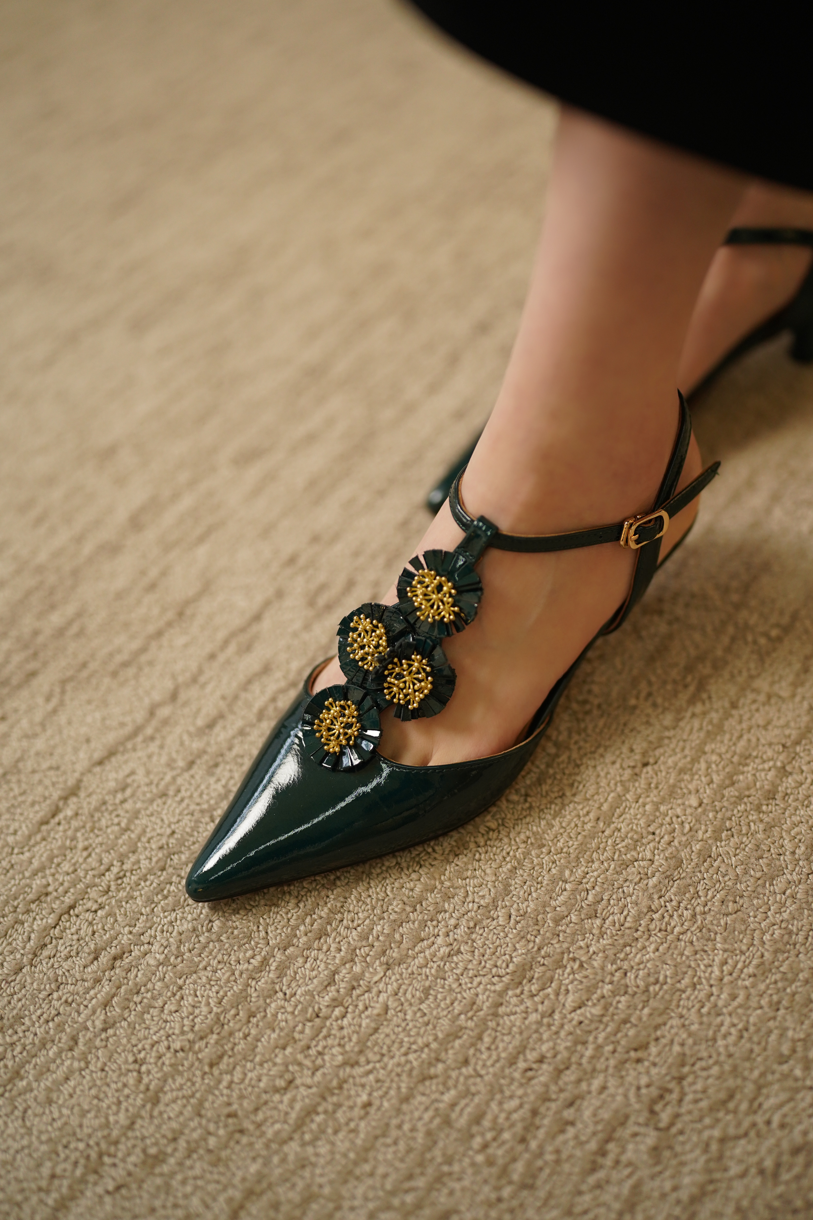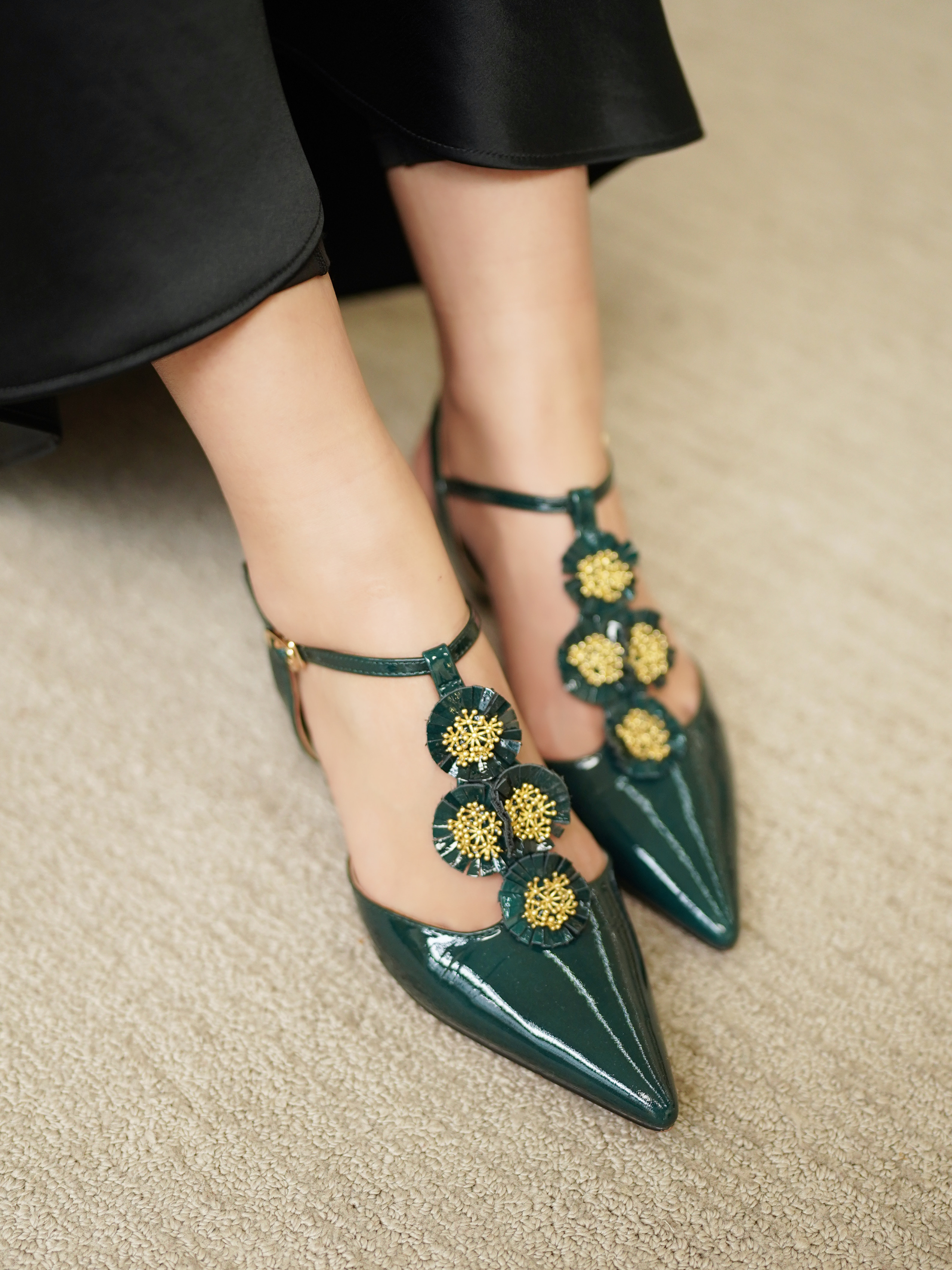 漆皮双色工艺+进口头层牛皮皮胚,让鞋身的光泽质感体现的邻里尽致。鞋面的花朵都是手工定制裁剪的,du家开模,采用黄铜材质,抗氧化不易变色,是我很喜欢的设计,像春天含苞待放的花朵,集具美感~~