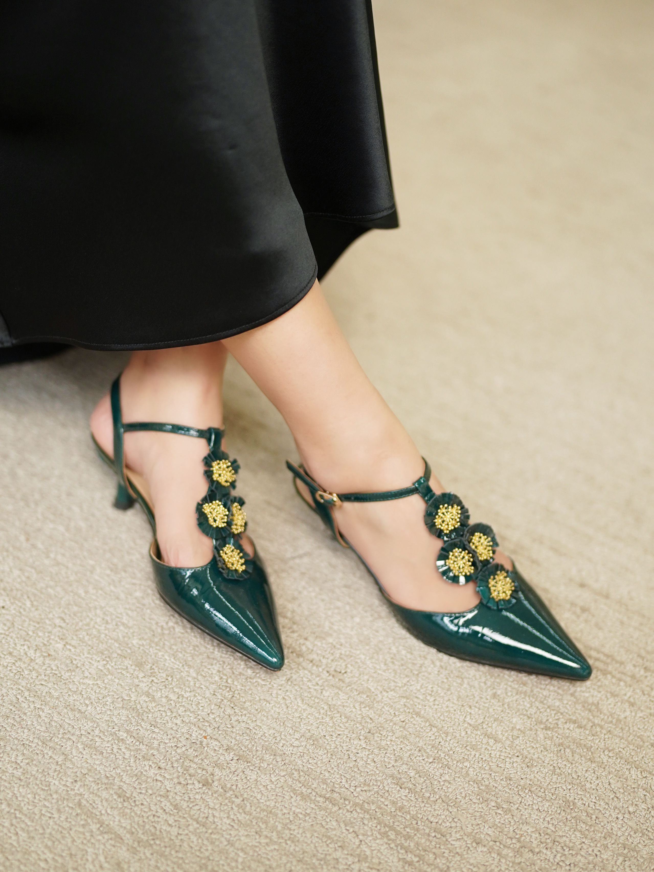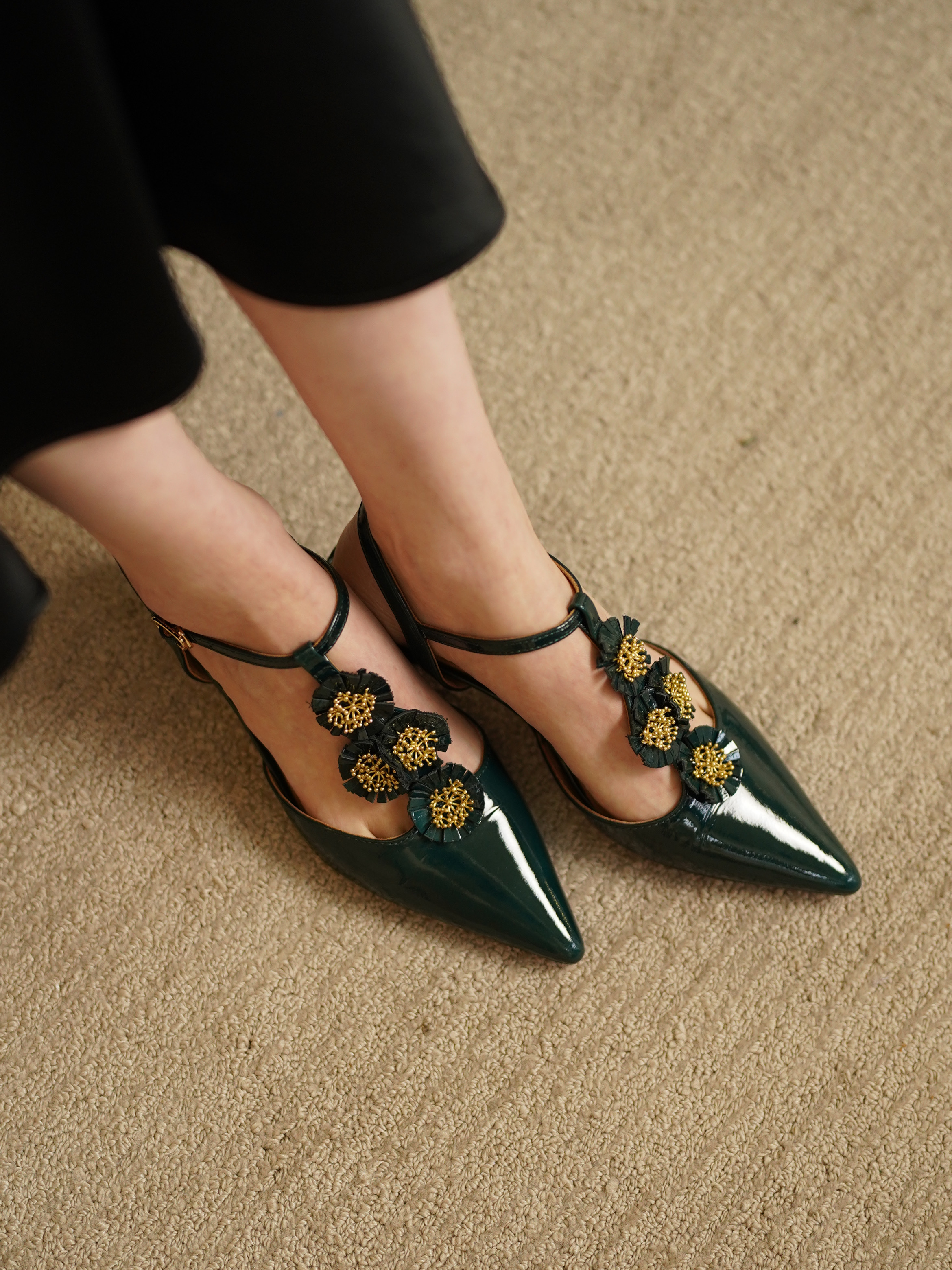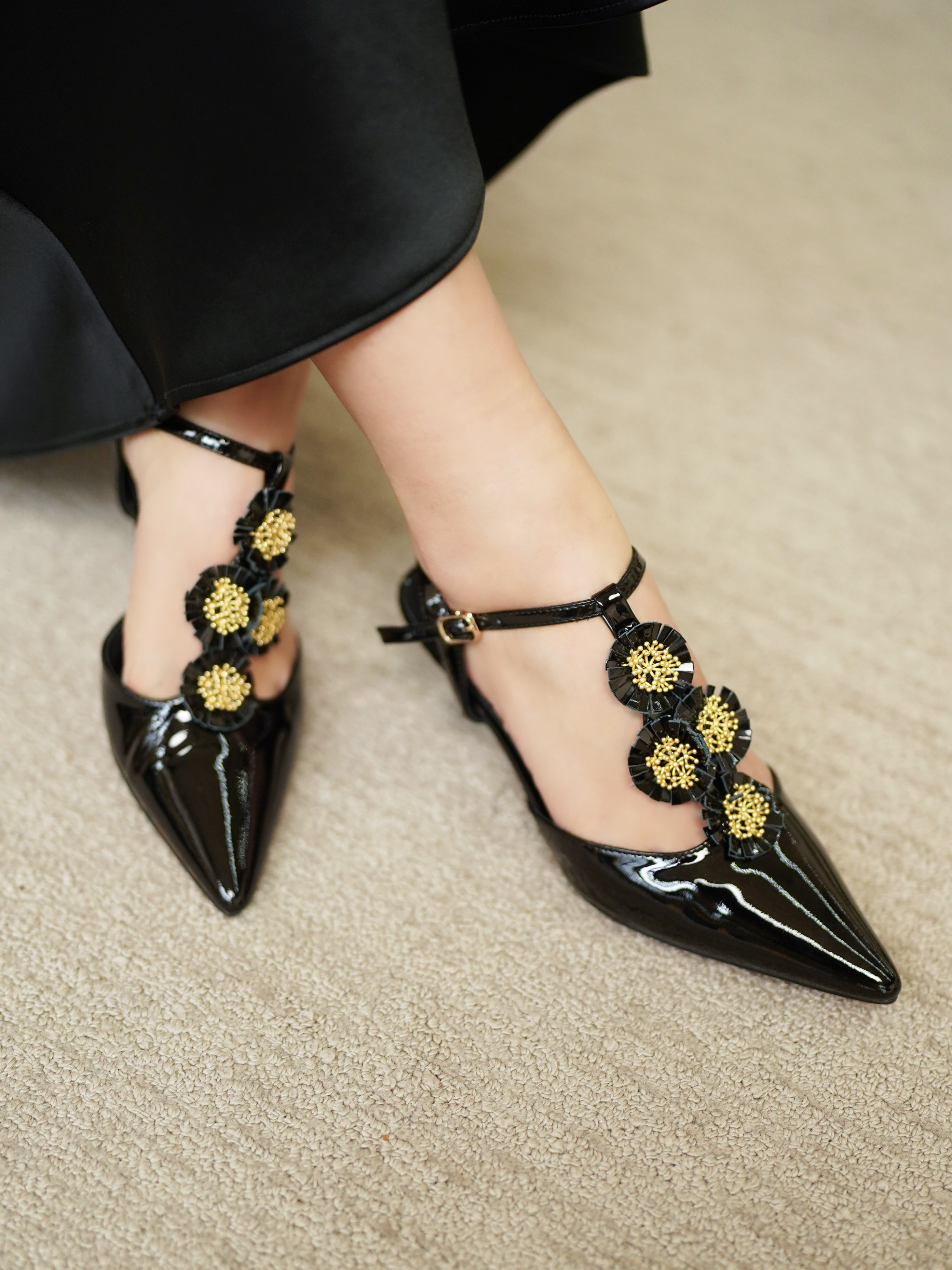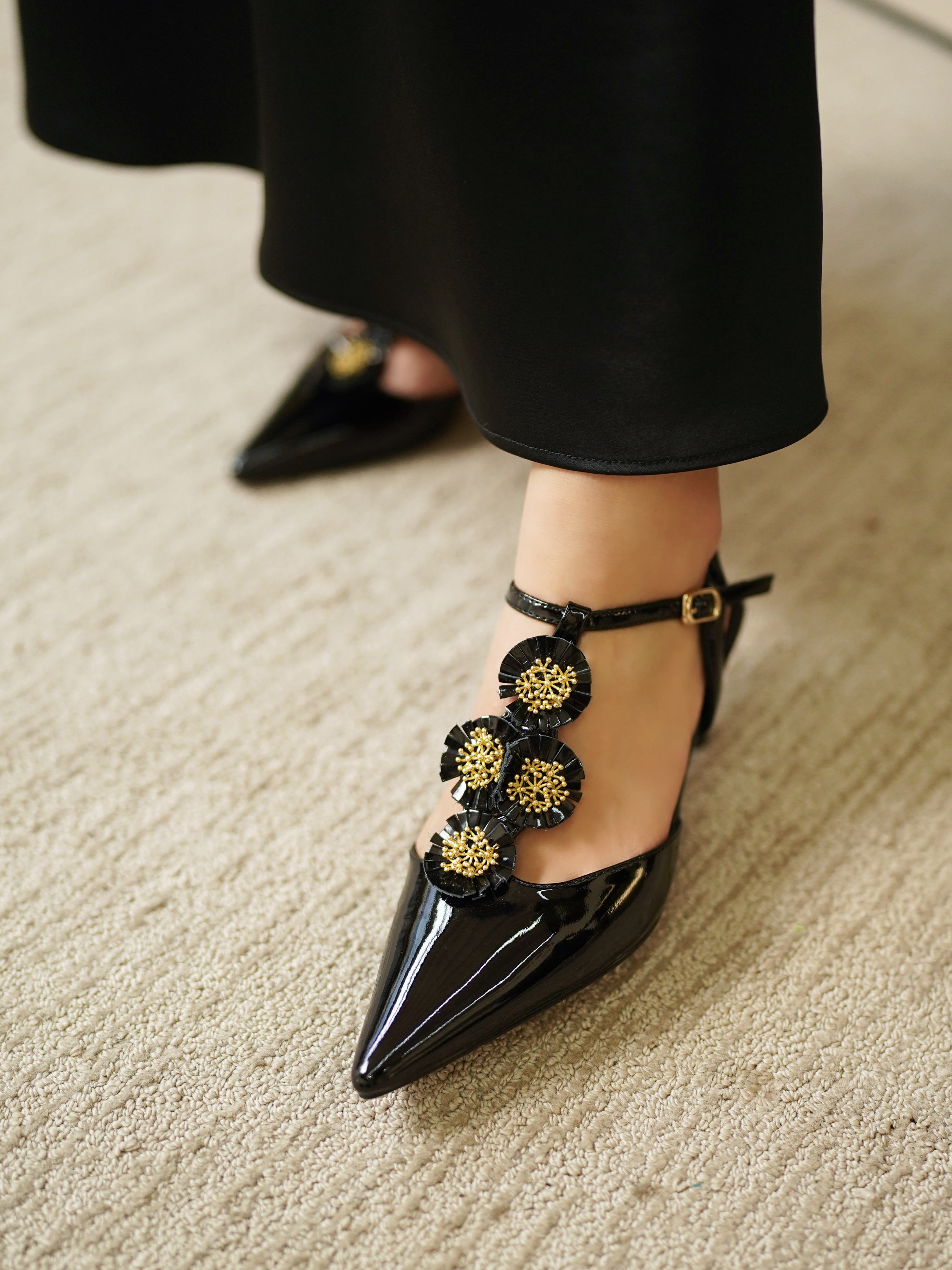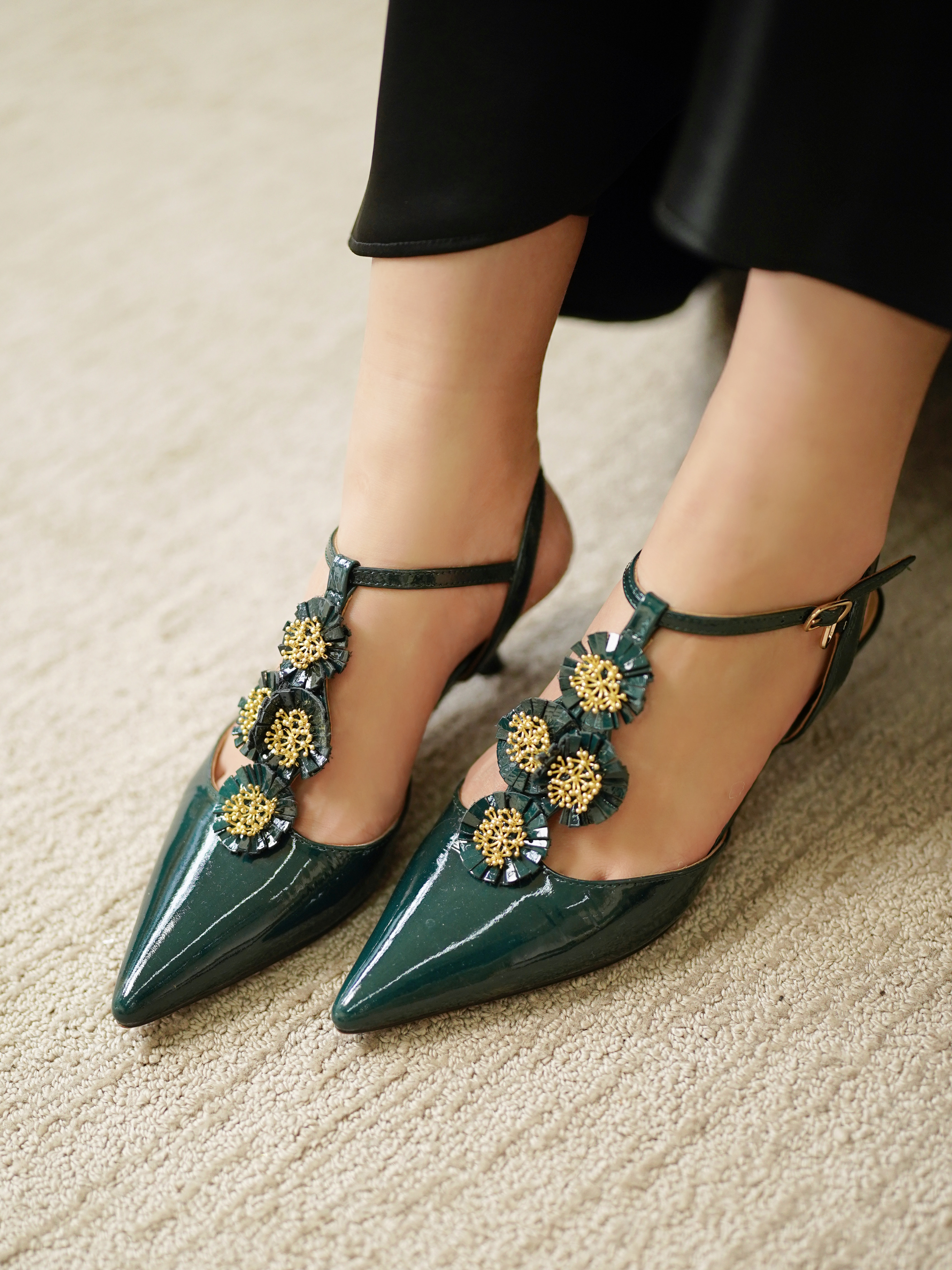 漆皮双色工艺+进口头层牛皮皮胚,让鞋身的光泽质感体现的邻里尽致。鞋面的花朵都是手工定制裁剪的,du家开模,采用黄铜材质,抗氧化不易变色,是我很喜欢的设计,像春天含苞待放的花朵,集具美感~~