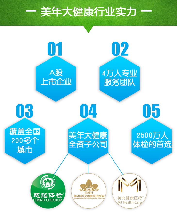 - 中国体检行业上市企业。集健康体检、健康管理、健康咨询于一体的经营连锁机构,致力于企业、个人的健康管理服务。