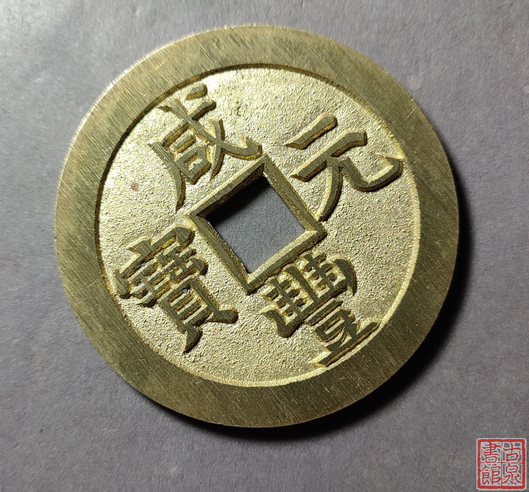 为了尽量还原古代钱币的文字神韵与时代铸造特征,每一枚都进行手工修刀、打磨。会有打磨痕迹、刻刀痕迹,铸造气孔或者微小沙眼,这正是手工与机器制作的区别,并非瑕疵。