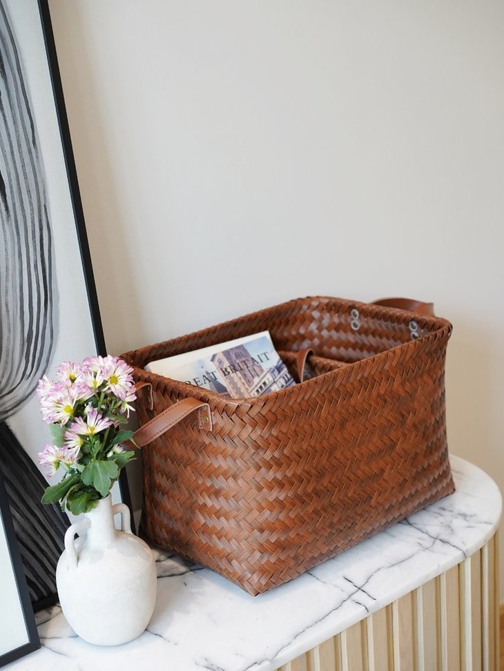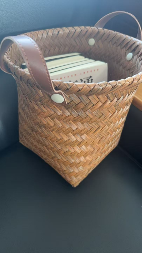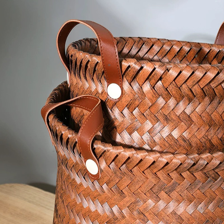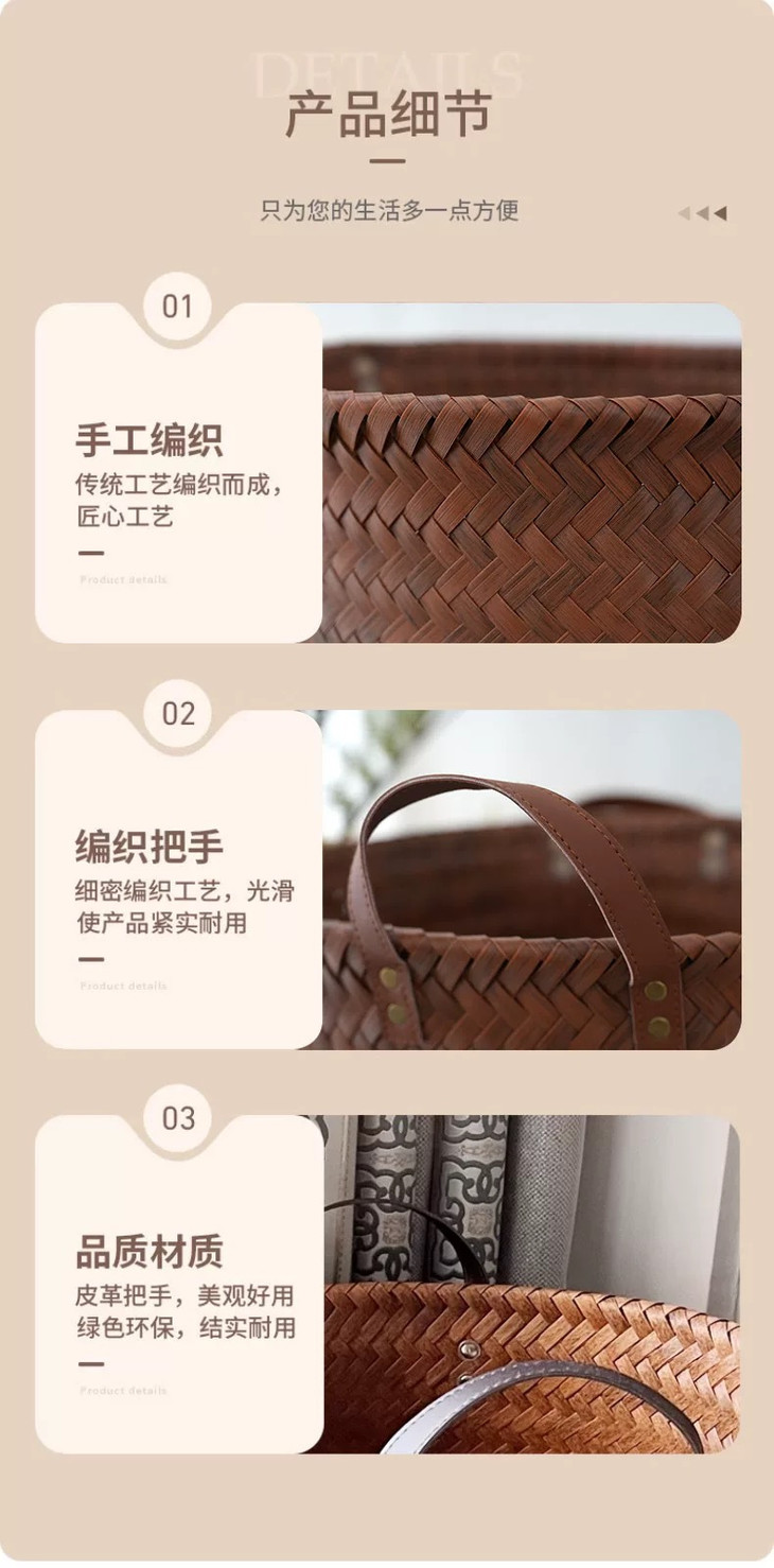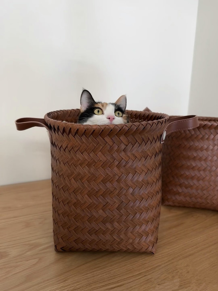 收纳筐都是纯手工编织而成 藤条细节都处理非常好, 完全没有毛刺 而且又编织的规则有序、密实紧凑👍 特别有型,支撑性非常好, 不会软塌塌的 简直像工艺品一样精美 环保PP仿藤材质 精致PU把手+金属升级铆钉的设计, 更是让人觉得做工精细,美观大气 拿到手后真的会让人觉得物超所值!