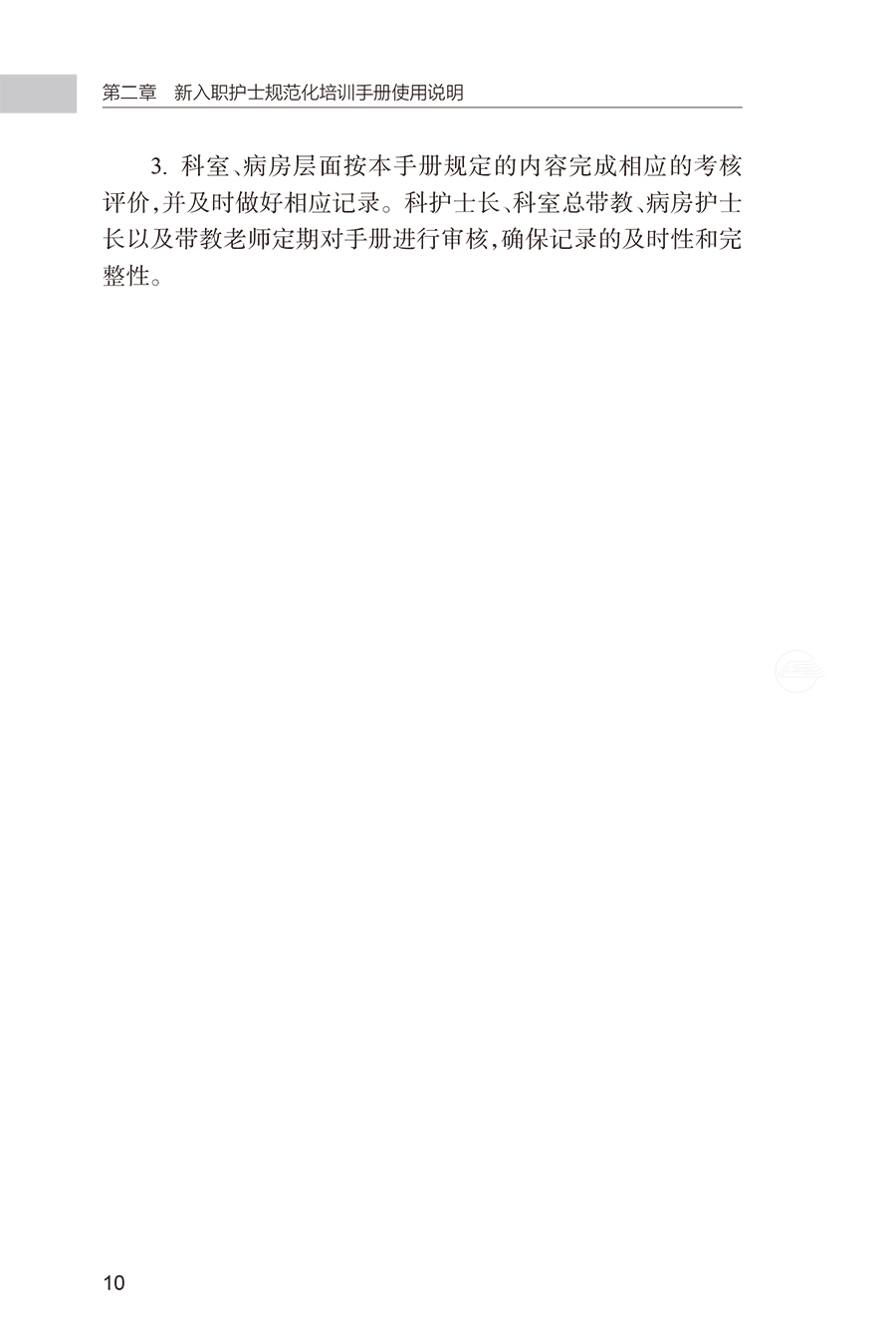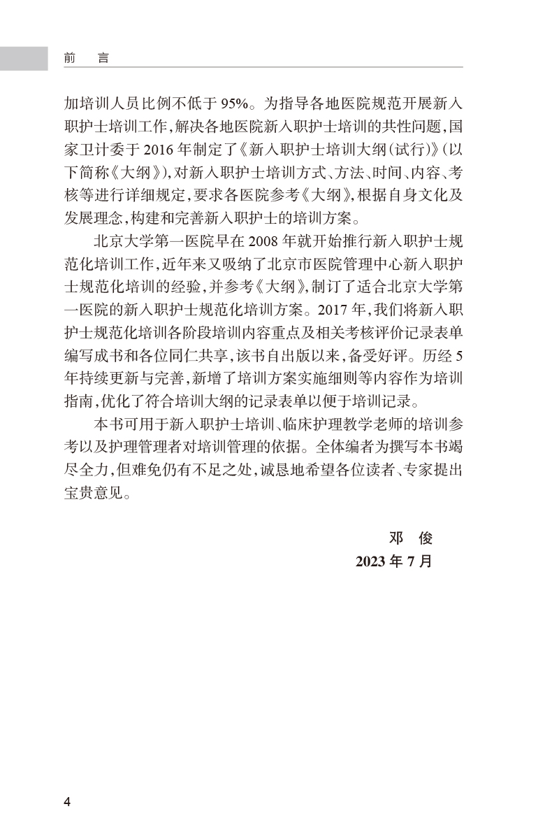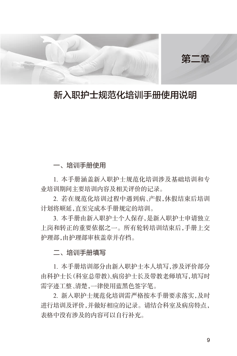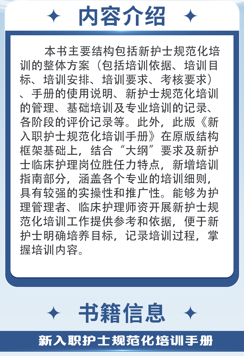 本书主要结构包括新护士规范化培训的整体方案(包括培训依据、培训目标、培训安排、培训要求、考核要求)、手册的使用说明、新护士规范化培训的管理、基础培训及专业培训的记录、各阶段的评价记录等。此外,此版《新入职护士规范化培训手册》在原版结构框架基础上,结合“大纲”要求及新护士临床护理岗位胜任力特点,新增培训指南部分,涵盖各个专业的培训细则,具有较强的实操性和推广性。能够为护理管理者、临床护理师资开展新护士规范化培训工作提供参考和依据,便于新护士明确培养目标,记录培训过程,掌握培训内容。
