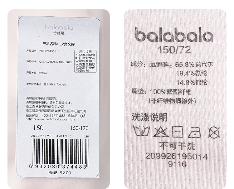 【balaOne】巴拉巴拉女童内衣发育期防走光防凸点儿童小背心文胸