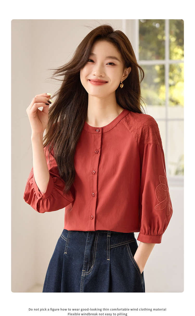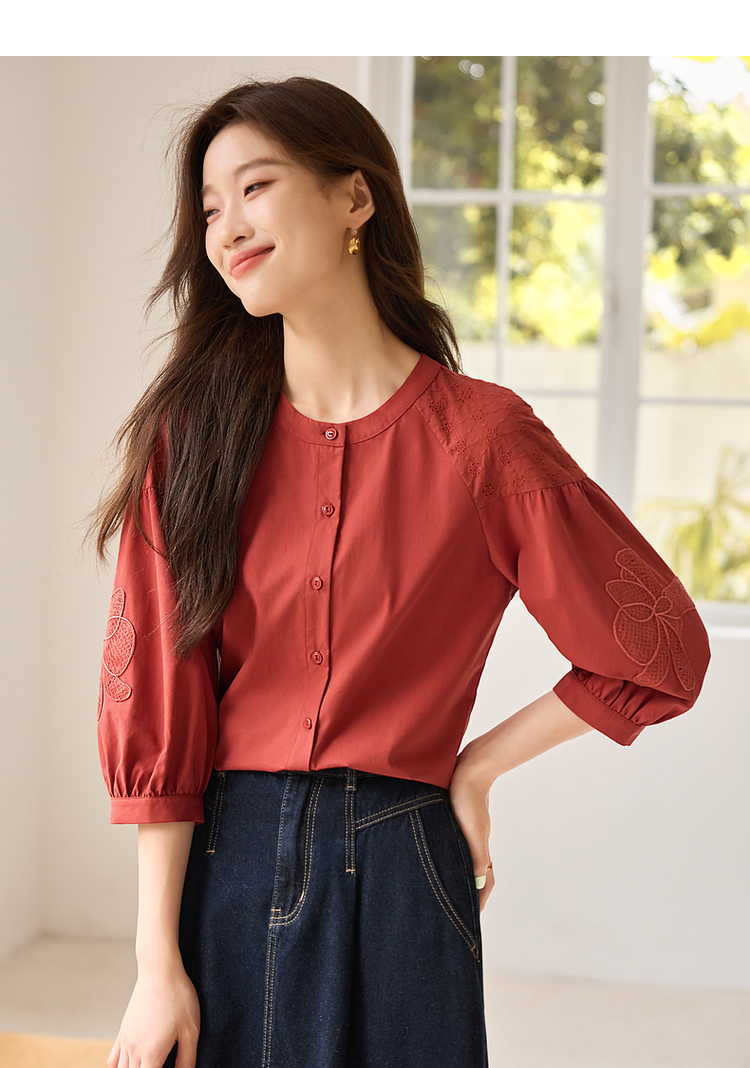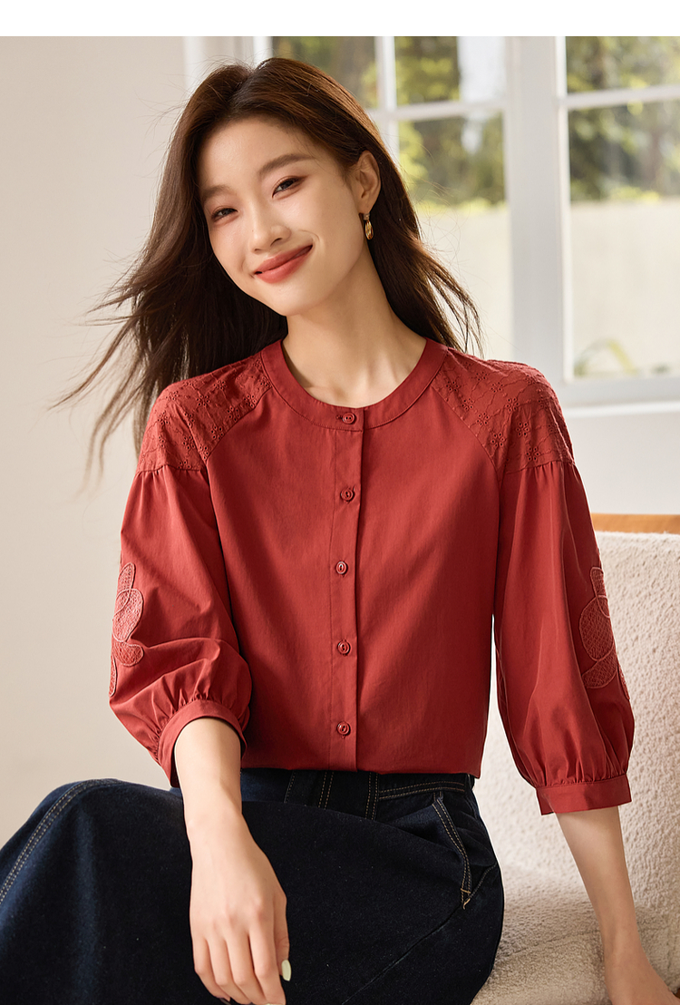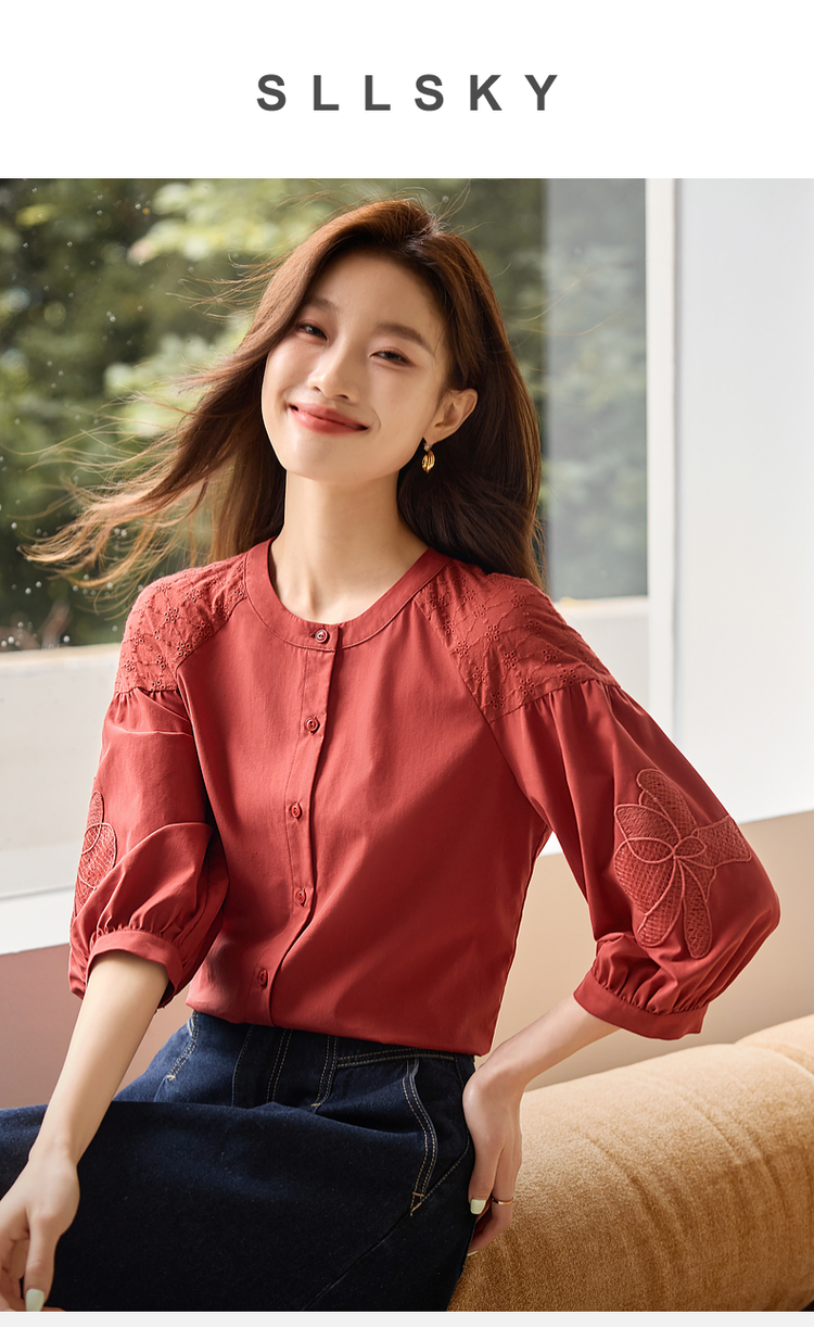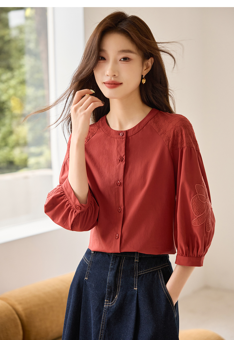 【专属特价】熙世界红色法式七分袖衬衣女2025初秋新款高端气质天丝衬衫上衣