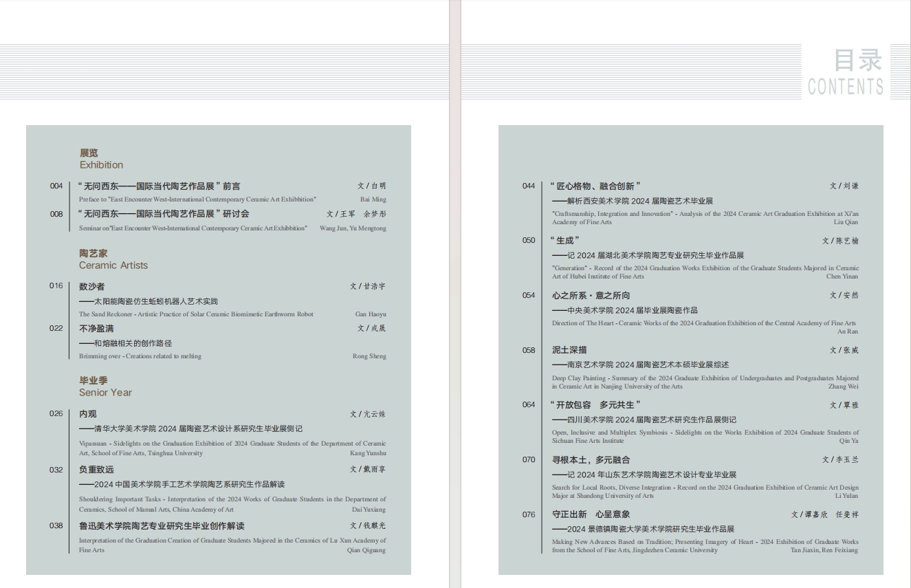 本期杂志分为“展览”“陶艺家”“毕业季”三个版块,“毕业季”部分梳理了包括清华大学美术学院、中国美术学院、景德镇陶瓷大学、南京艺术学院、四川美术学院等在内的国内各大艺术院校的2024年陶瓷艺术相关毕业展览,并对其中的优秀毕业作品进行了介绍。“陶艺家”板块与“展览”板块分别对国内知名的陶艺家与本季度国内重要的现当代陶艺展览、学术沙龙进行了介绍。