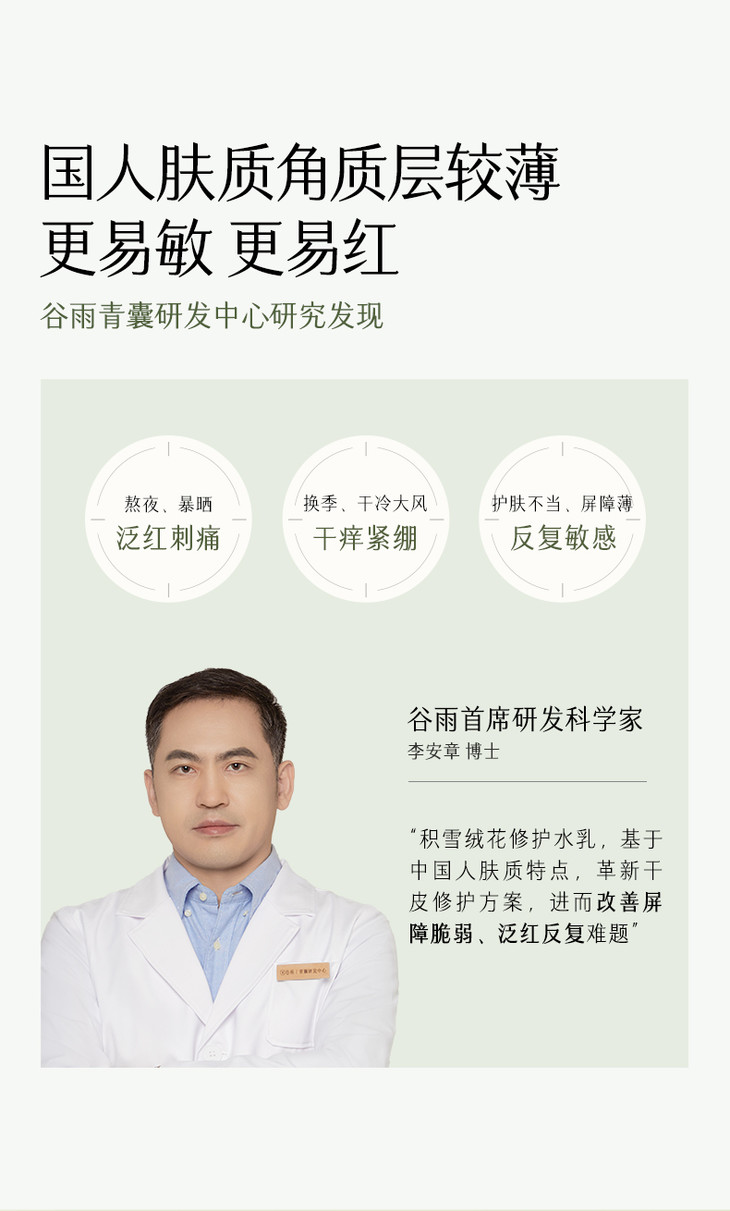 - 谷雨,更适合中国人肤质的植萃美白。专研中华珍稀美白植萃光甘草定,深入研究中国人肤质特点,打造中国女性独有的仙气白。