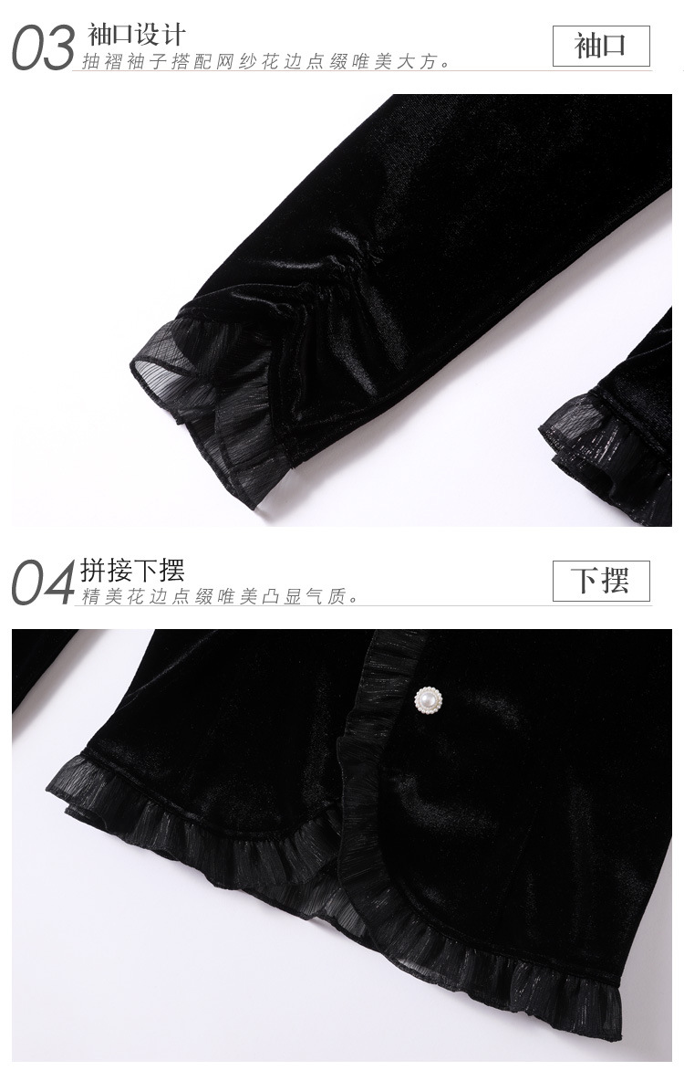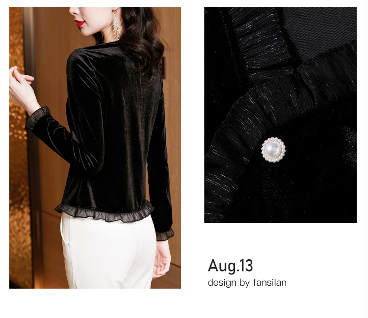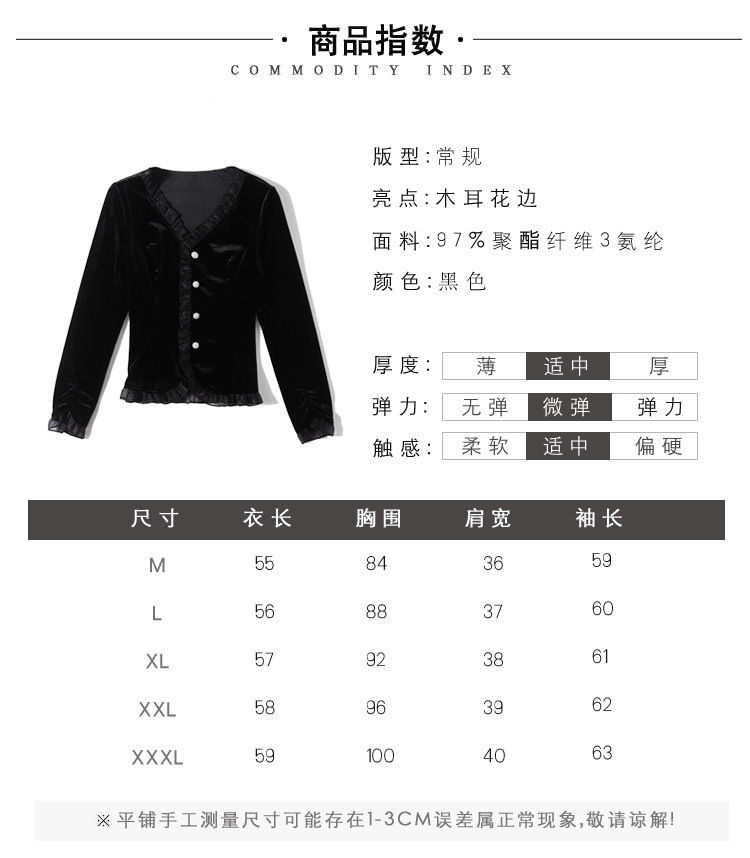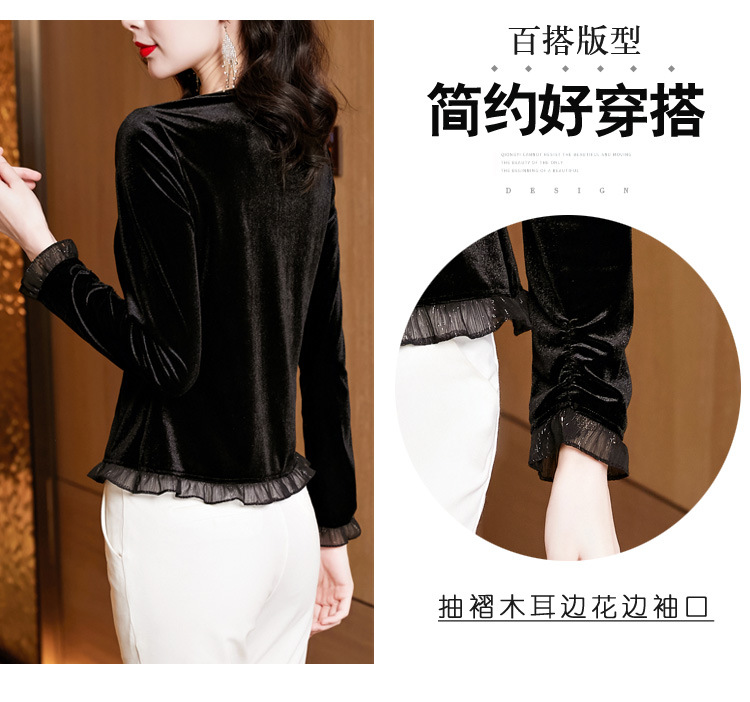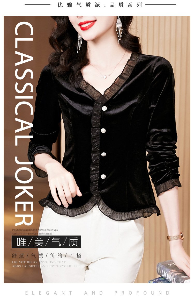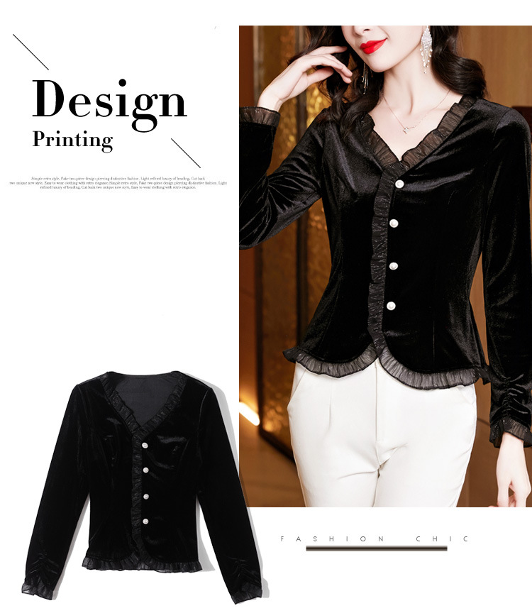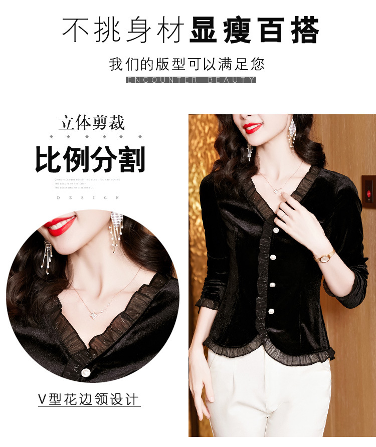 V领荷叶边洋气修身,显瘦丝绒长袖小衫KQL-2365
