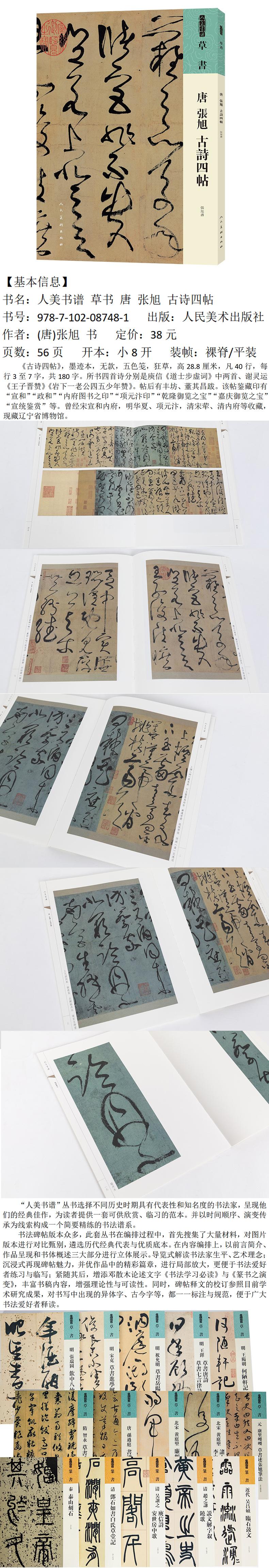 “人美书谱”丛书选择不同历史时期具有代表性和知名度的书法家,呈现他们的经典佳作,为读者提供一套可供欣赏、临习的范本。并以时间顺序、演变传承为线索构成一个简要精练的书法谱系。 《唐张旭古诗四帖》为该丛书之一。 《古诗四帖》,墨迹本,无款,五色笺,狂草,高28.8厘米,凡40行,每行3至7字,共180字。所书四首诗分别是庾信《道士步虚词》中两首、谢灵运《王子晋赞》《岩下一老公四五少年赞》。帖后有丰坊、董其昌跋。该帖鉴藏印有“宣和”“政和”“内府图书之印”“项元汴印”“乾隆御览之宝”“嘉庆御览之宝”“宣统鉴赏”等。曾经宋宣和内府,明华夏、项元汴,清宋荦、清内府等收藏,现藏辽宁省博物馆。本书正文后附局部放大与邓散木《书法学习必读·草书》,供读者研习参考。为便于读者规范识读,释文中错字、异体字在()内注明正确字、正体字。