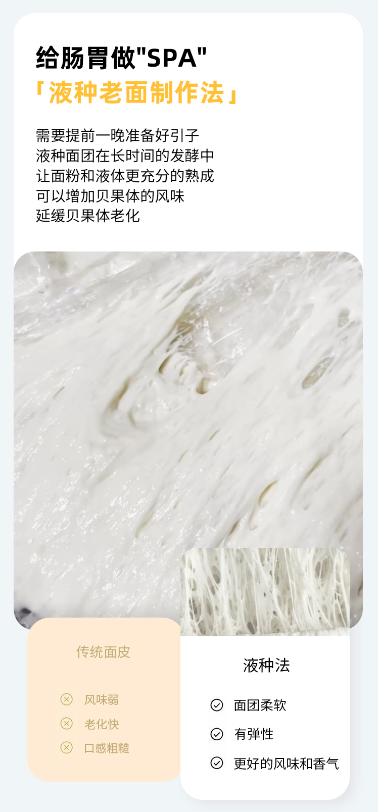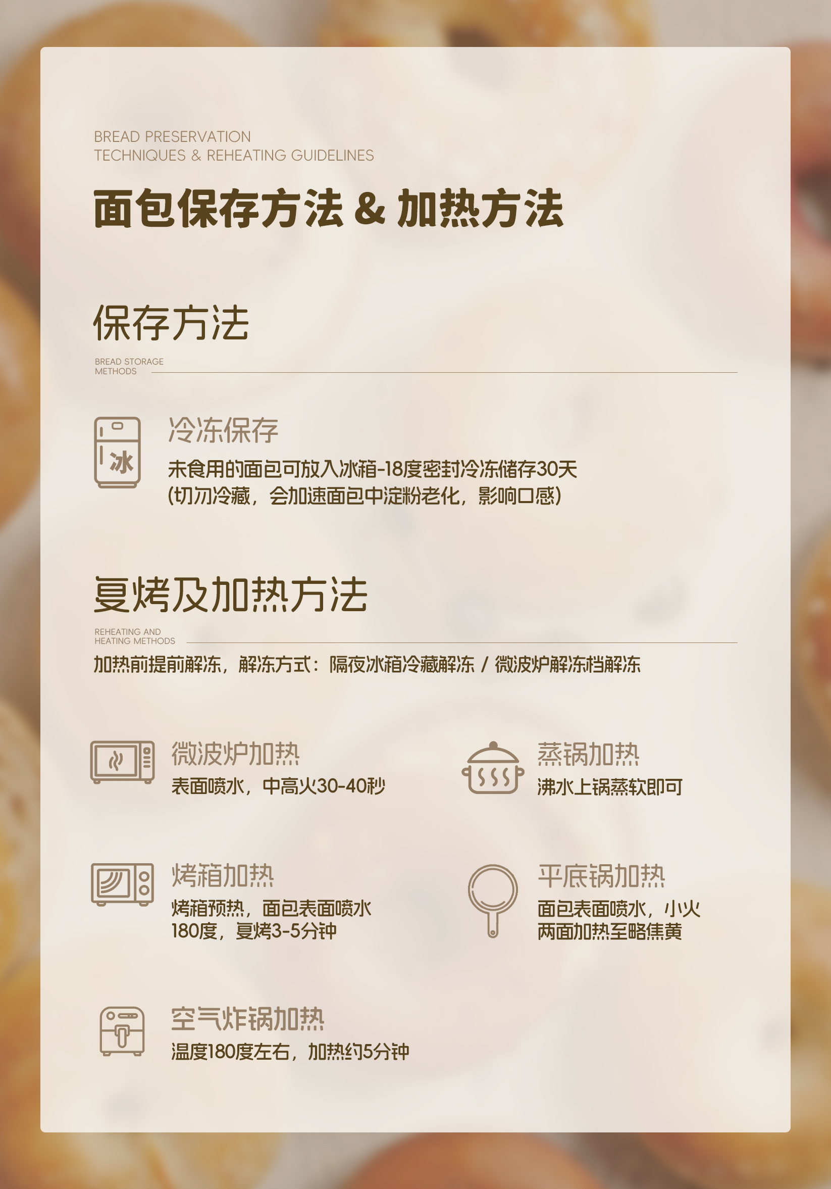 存储方式:面包收到后请及时放入冷冻(-18℃存储),食用时提前冷藏解冻,切勿冷藏存储,会加速面包淀粉老化,影响口感。
