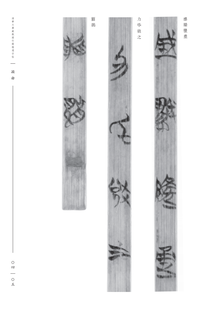 清华简《说命》共有三篇,每篇最末一简背面皆书有“傅说之命”四字,系篇题,原整理者根据内容次第分别题为《说命上》《说命中》和《说命下》。三篇形制大致相同,简长约四十五厘米,宽〇•六厘米,三道编。每篇简背原有次序编号录有内容完整的上、中两篇。