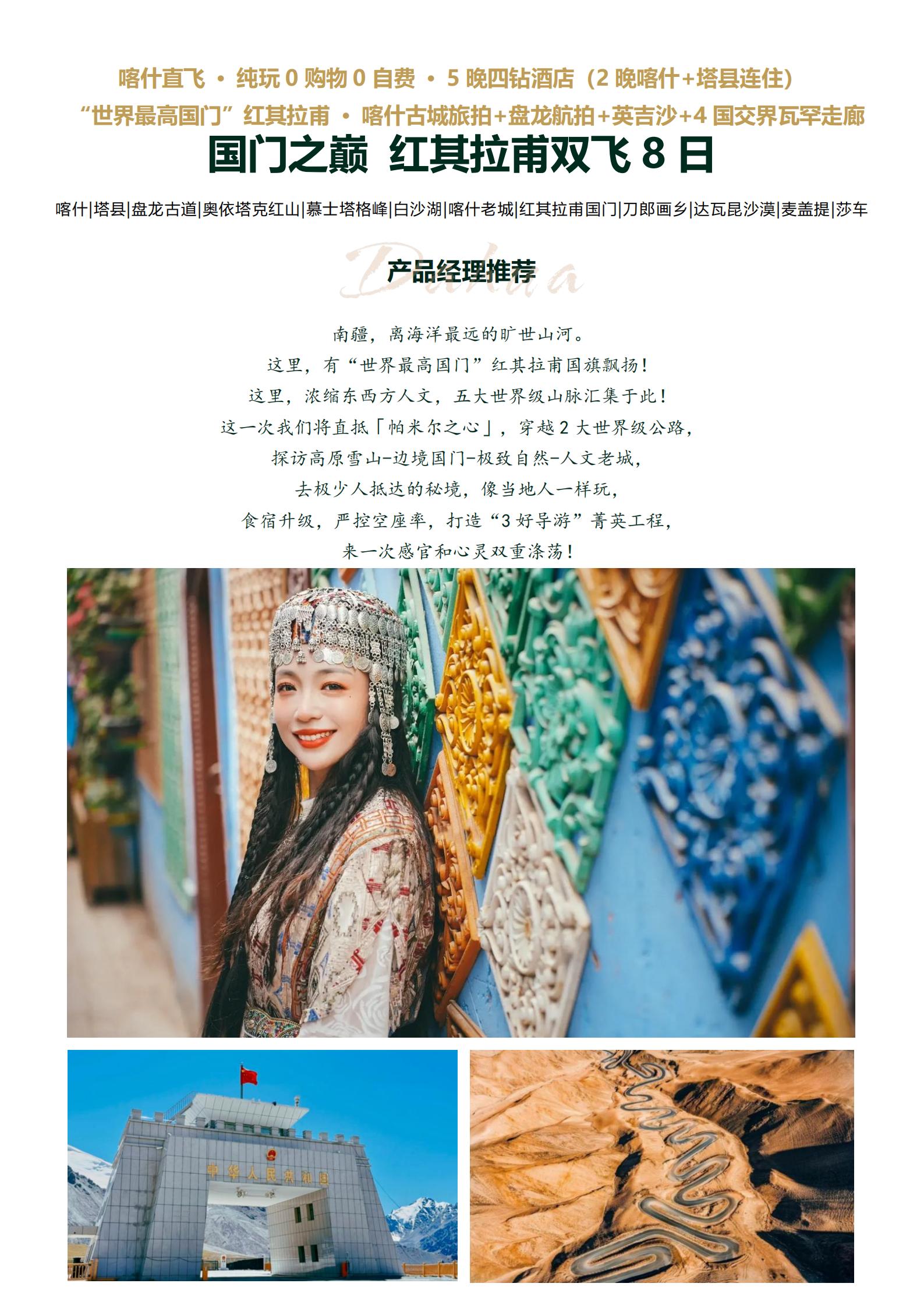 【五一】<新疆南疆双飞8日游-直飞喀什>喀什|塔县|盘龙古道|奥依塔克红山|慕士塔格峰|白沙湖|喀什老城|红其拉甫国门|刀郎画乡|达瓦昆沙漠|麦盖提|莎车