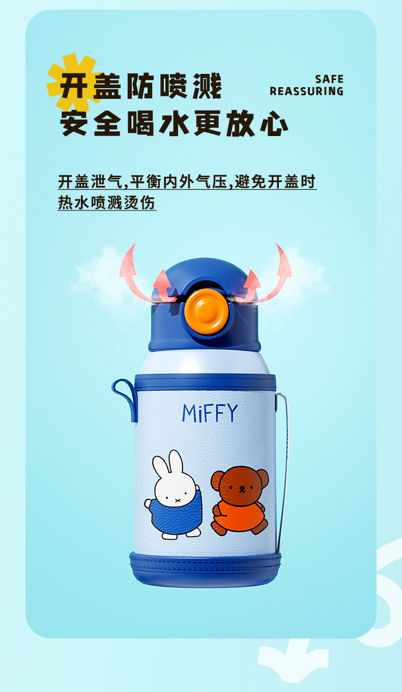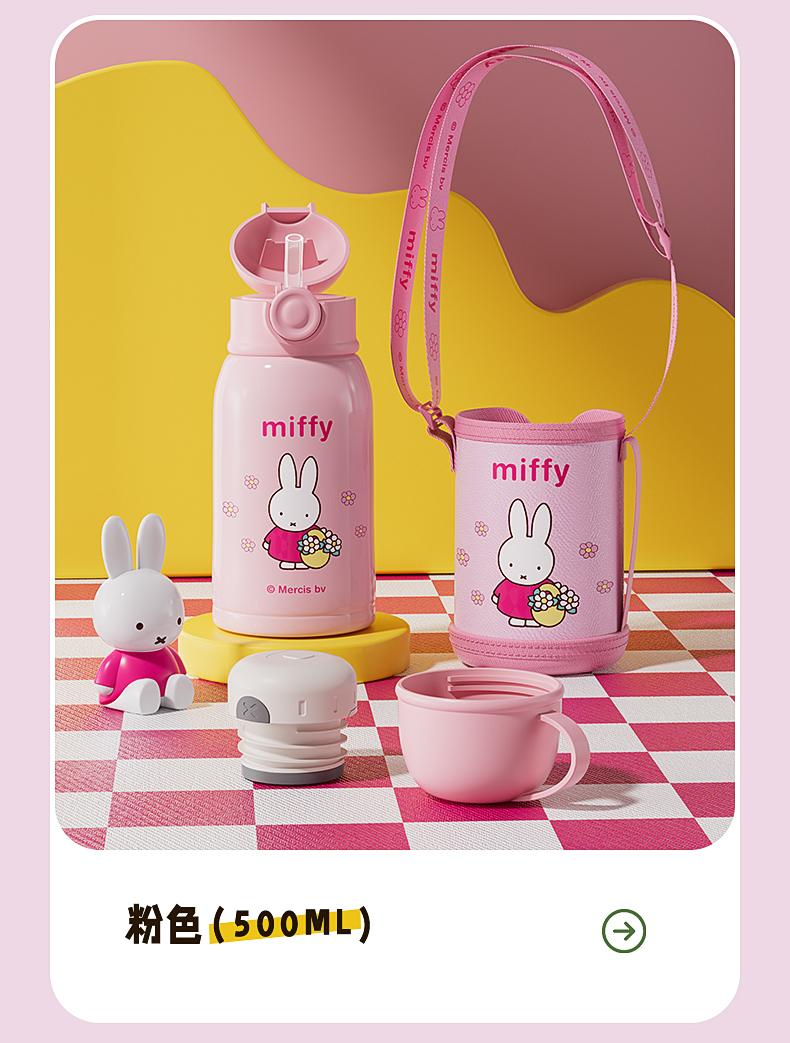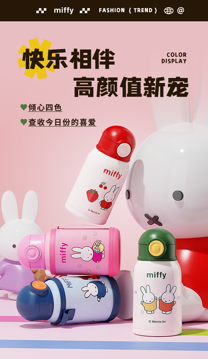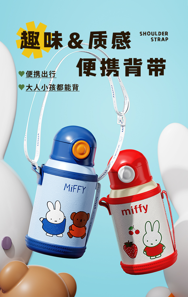 米菲Miffy儿童保温杯316吸管杯一杯三盖男女水杯子幼儿园小学生上学专用保温水壶带杯套