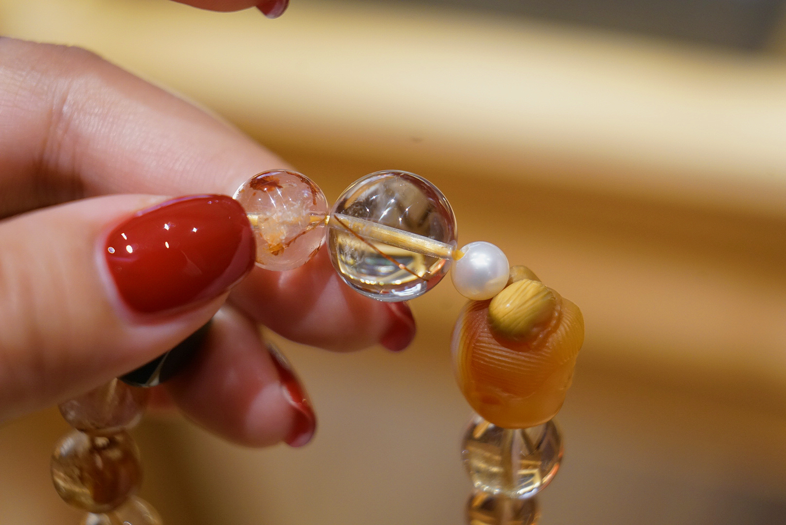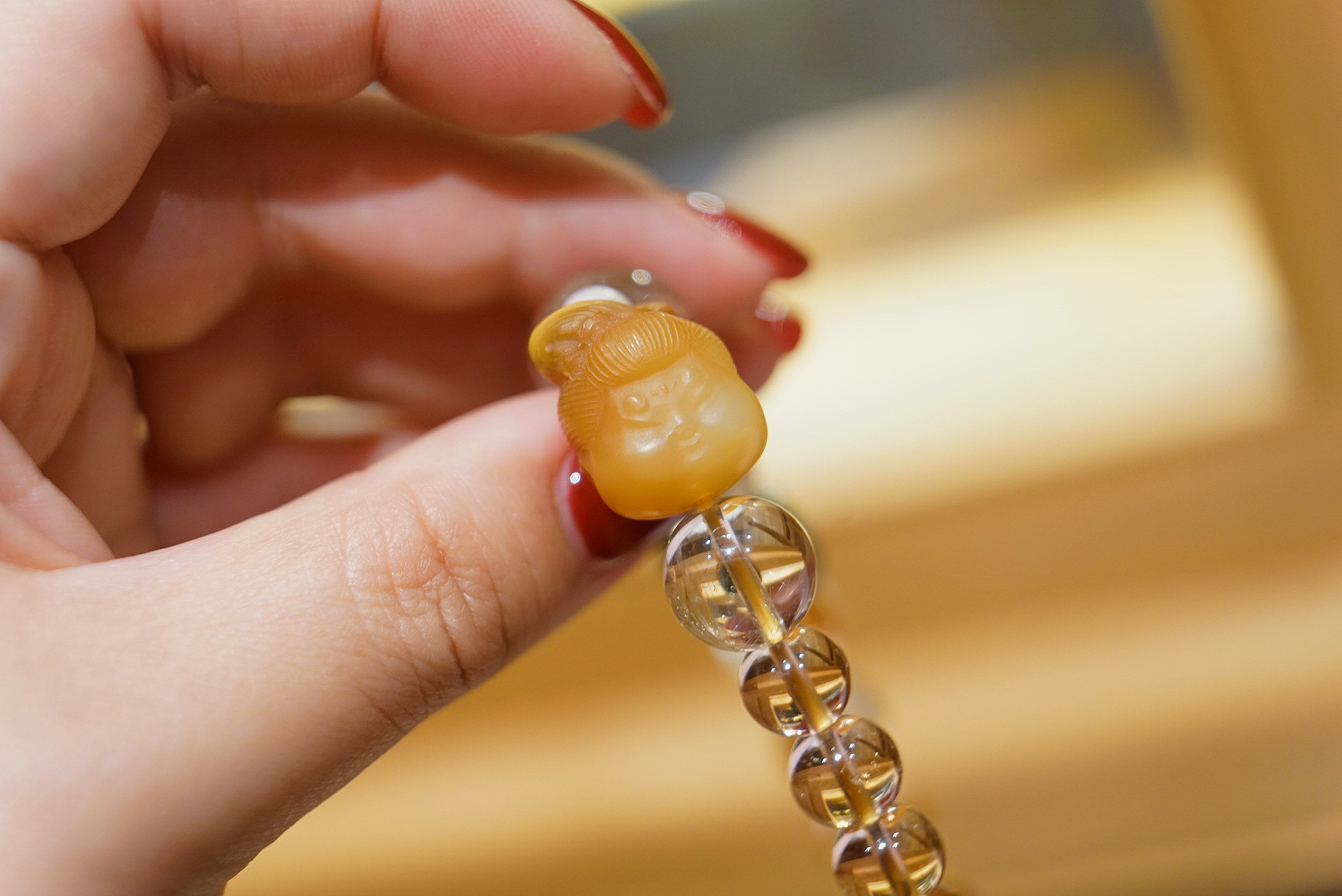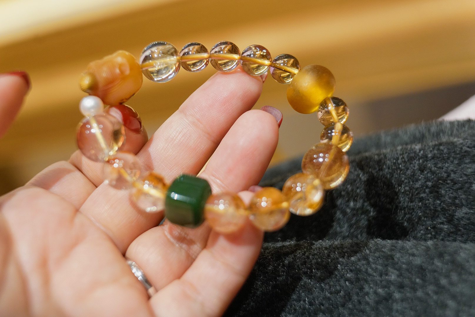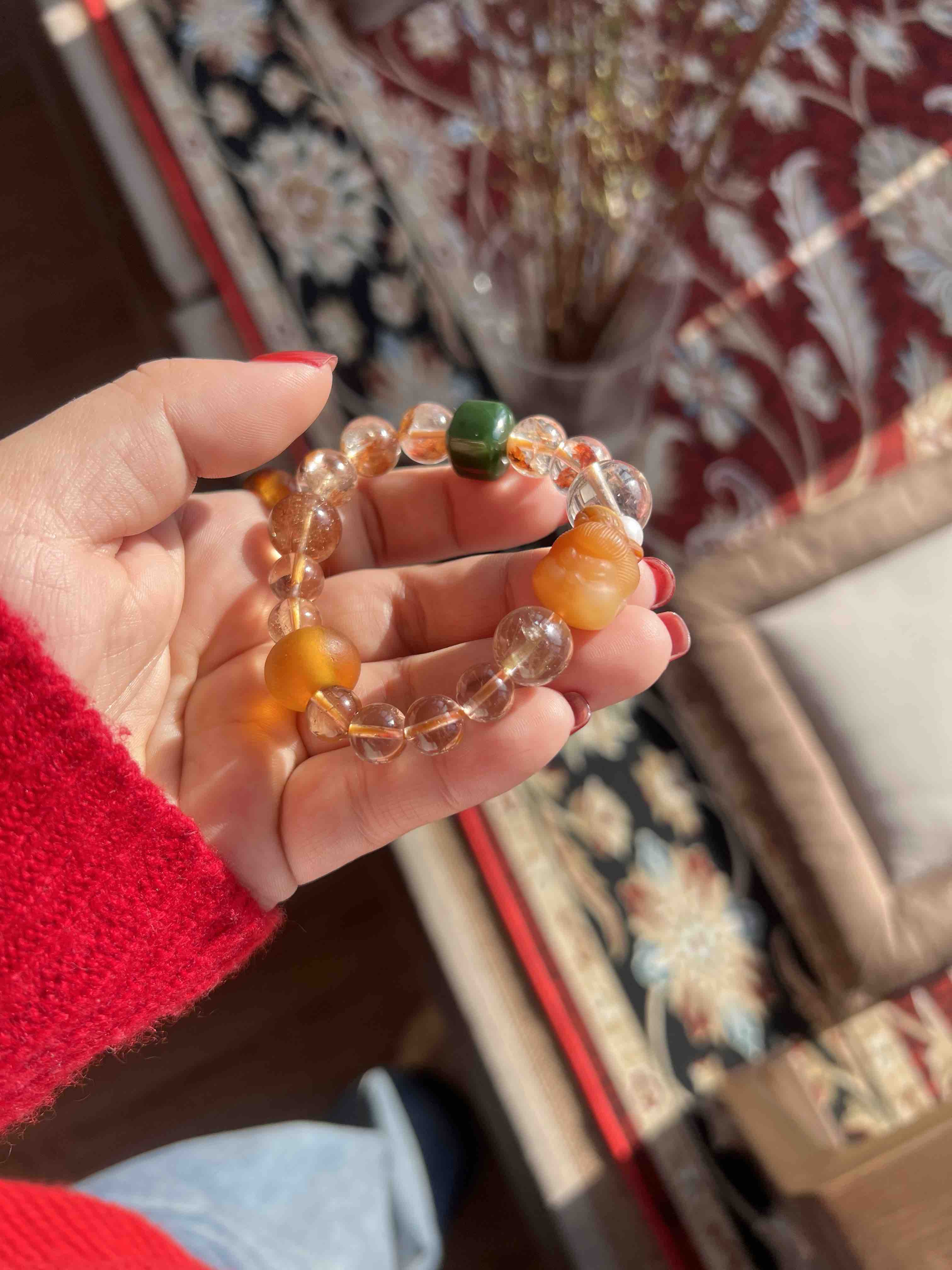 其中一颗压轴方形和田玉,加入稳重大气的碧玉,把这条水晶的贵格提了提,完美😍 一颗就几百啦!
