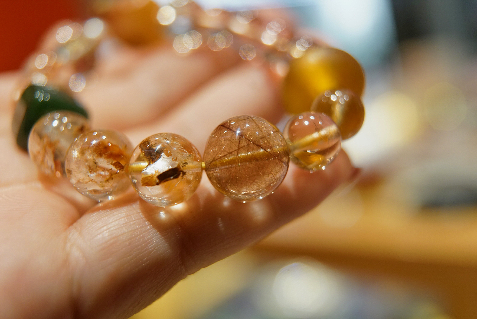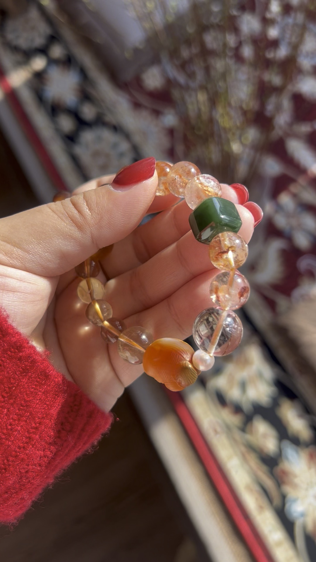这条精品水晶设计素材:橘色胶花(实物更美)~这条还有维多利亚紫黄晶里的黄水晶(罕见),橘色老琉璃,里面还含有三颗不同状态的发晶,自己到手去发现吧~