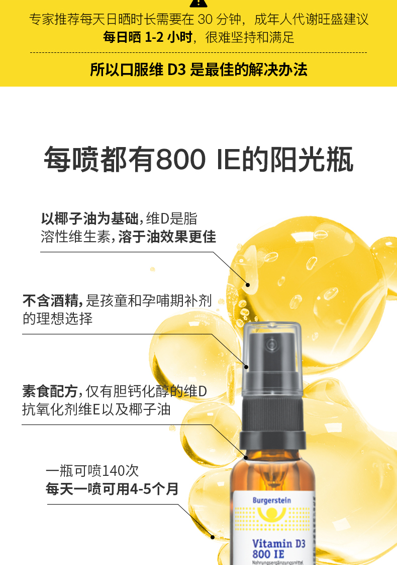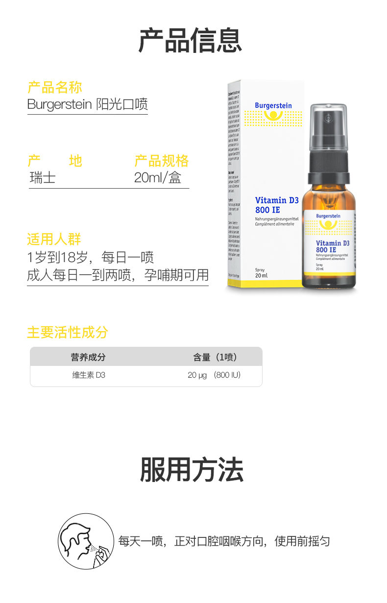 瑞士Burgerstein阳光口喷维生素D3口喷补钙引钙800IU非钙片纯素无酒精成人儿童阳光瓶