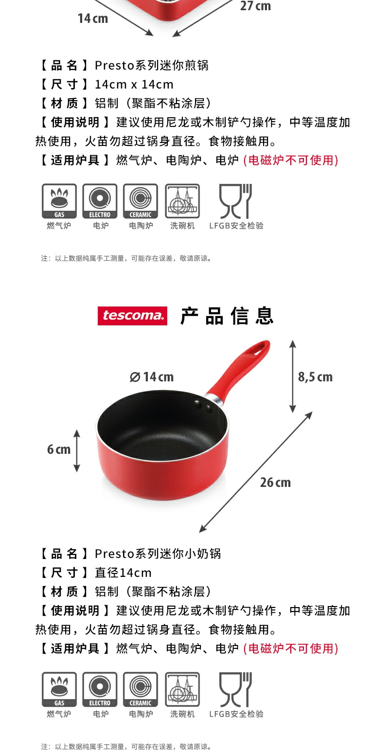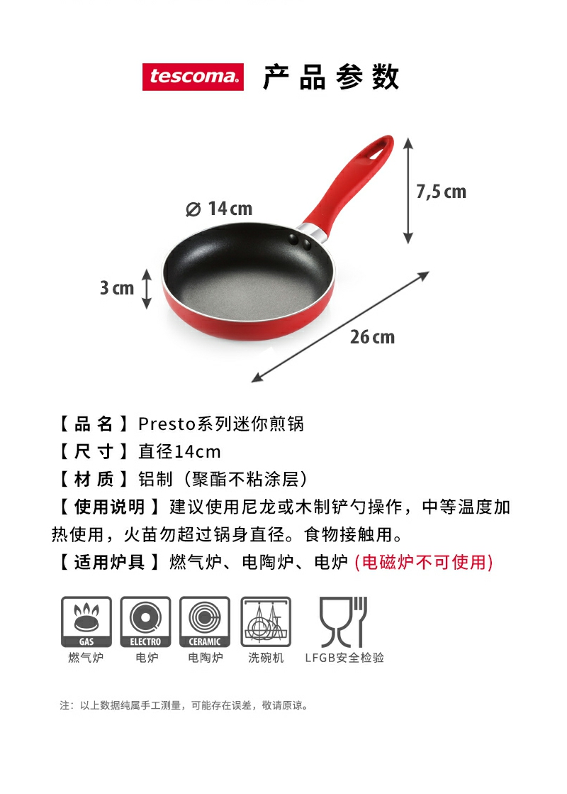 【直发】tescomatescoma 烹饪锅具 捷克 圆形方形小煎锅 煎蛋锅 宝宝辅食锅早餐锅 14cm奶锅