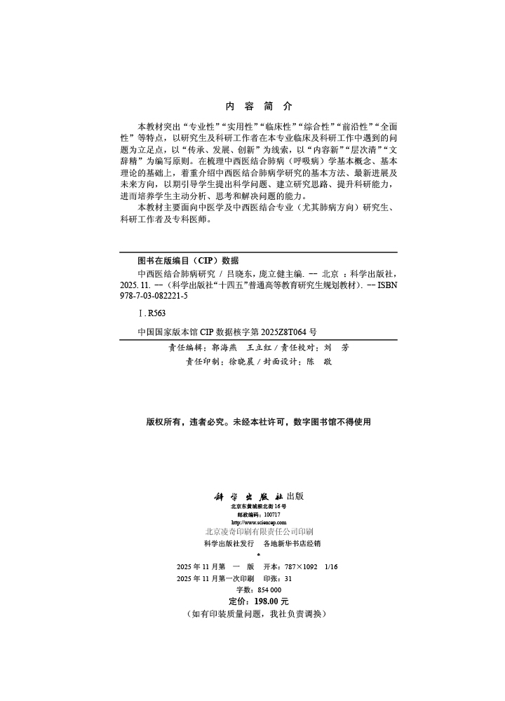 中西医结合肺病研究 十四五普通高等教育研究生规划教材 吕晓东 庞立健 供中医学及中西医结合专业(尤其肺病方向)等 科学出版社