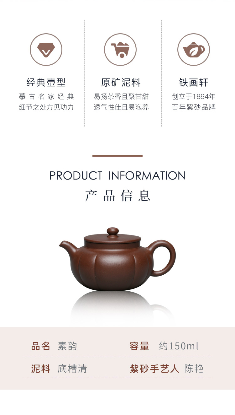 百年紫砂品牌铁画轩出品 底槽清 素韵紫砂壶150ml