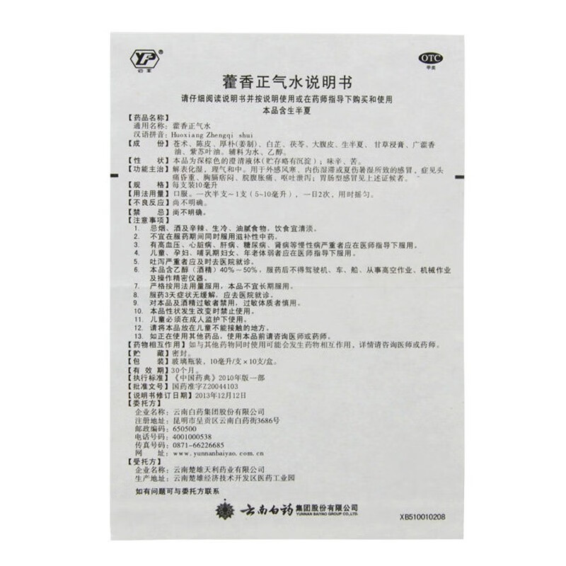 【官方正品】云南白药云丰藿香正气水10ml/支*10支/盒 解表化湿理气和中