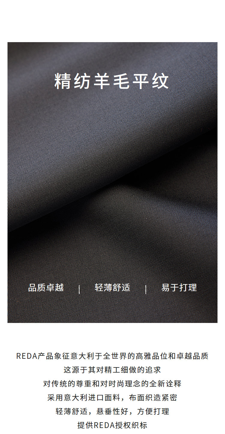 采用意大利进口面料,布面织造紧密轻薄舒适,悬垂性好,方便打理