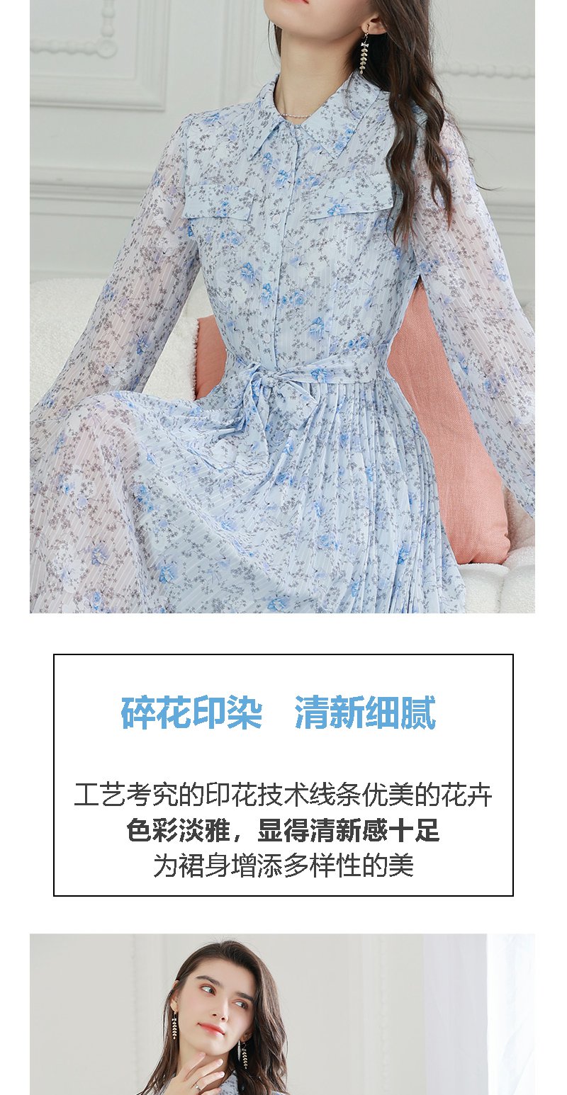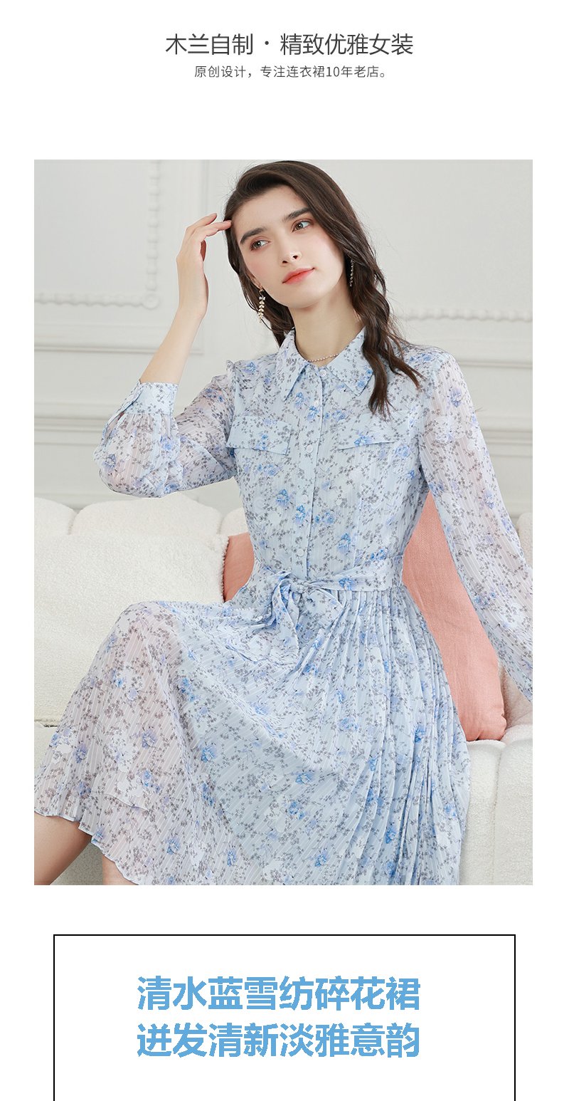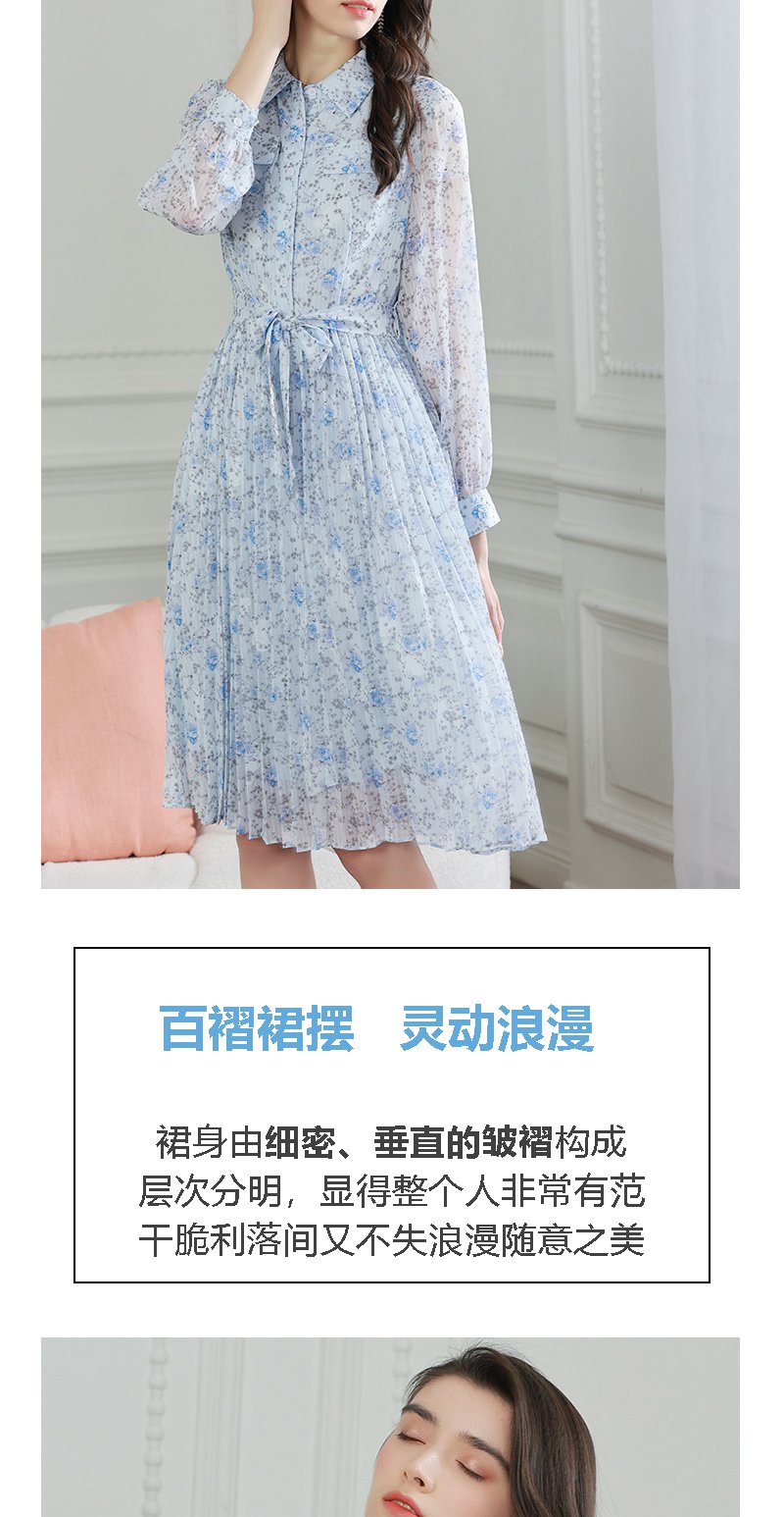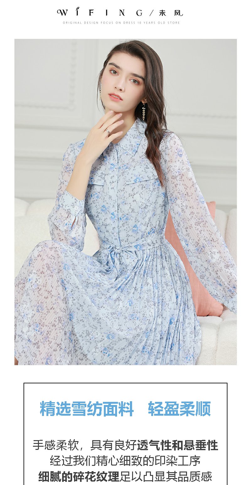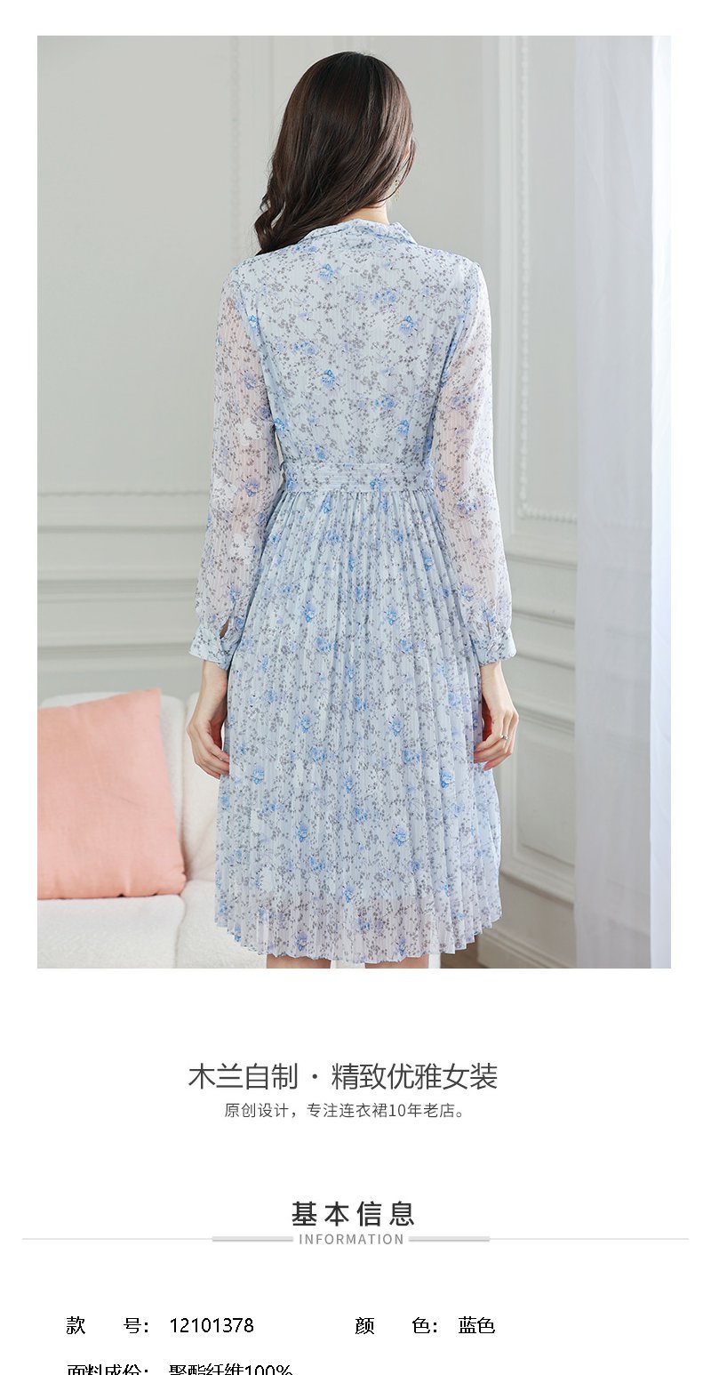 未风蓝色雪纺碎花连衣裙女早秋2024秋季新款气质显瘦娃娃领百褶裙